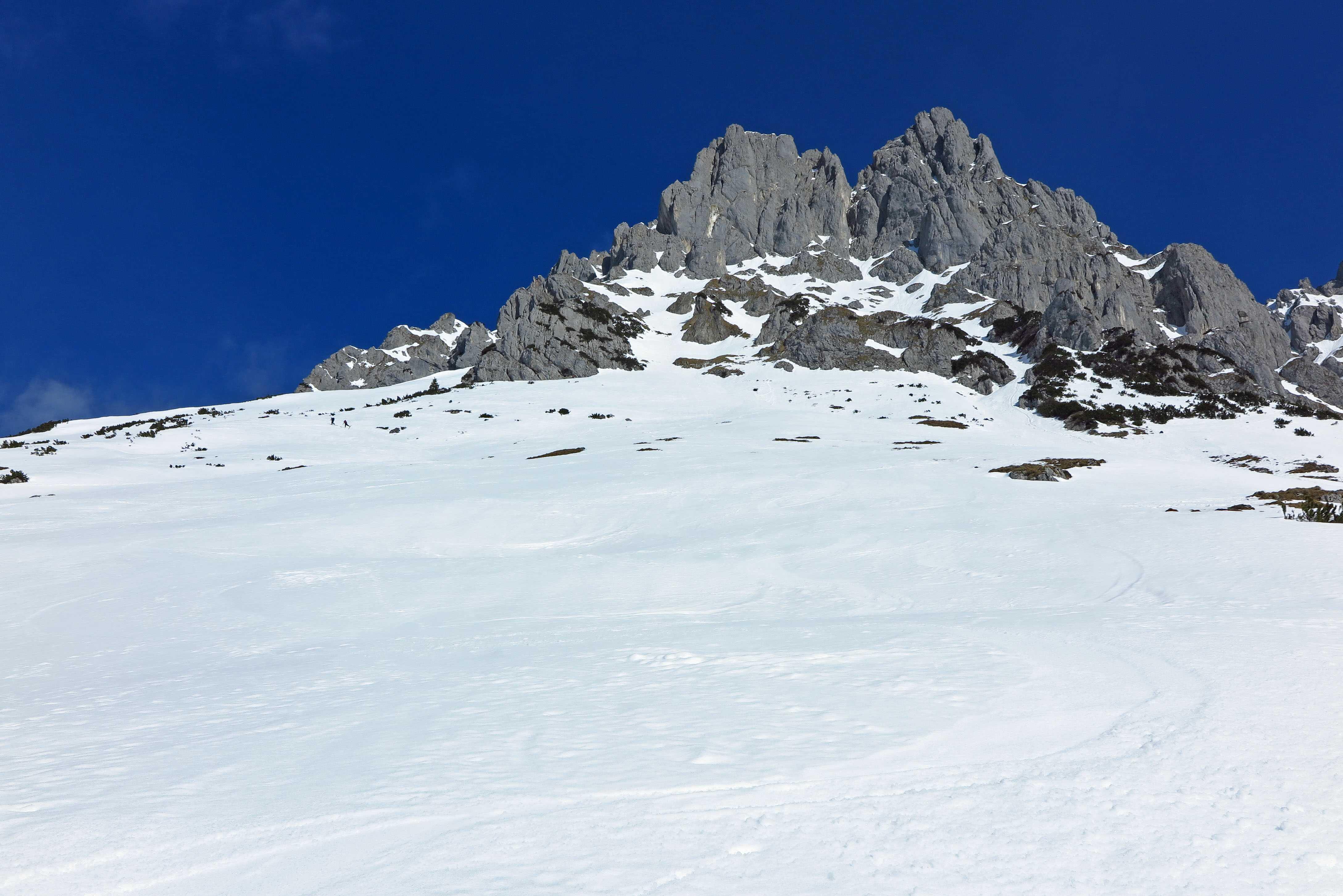 Vom PP Hüttling (827) über die Obere Regalpalm (1313) hinauf zum oberen Brotzeitfelsen des Herrensteins (1920). Abfahrt zur Regalpalm zurück und Wiederaufstieg zur Ackerlhütte und weiter ins Östl. Hochgrubachkar bis unter die Maukspitze (ca. 1730). Abfahrt Hochgrubachkar und über Ackerlhütte und Regalpalm zum PP zurück.