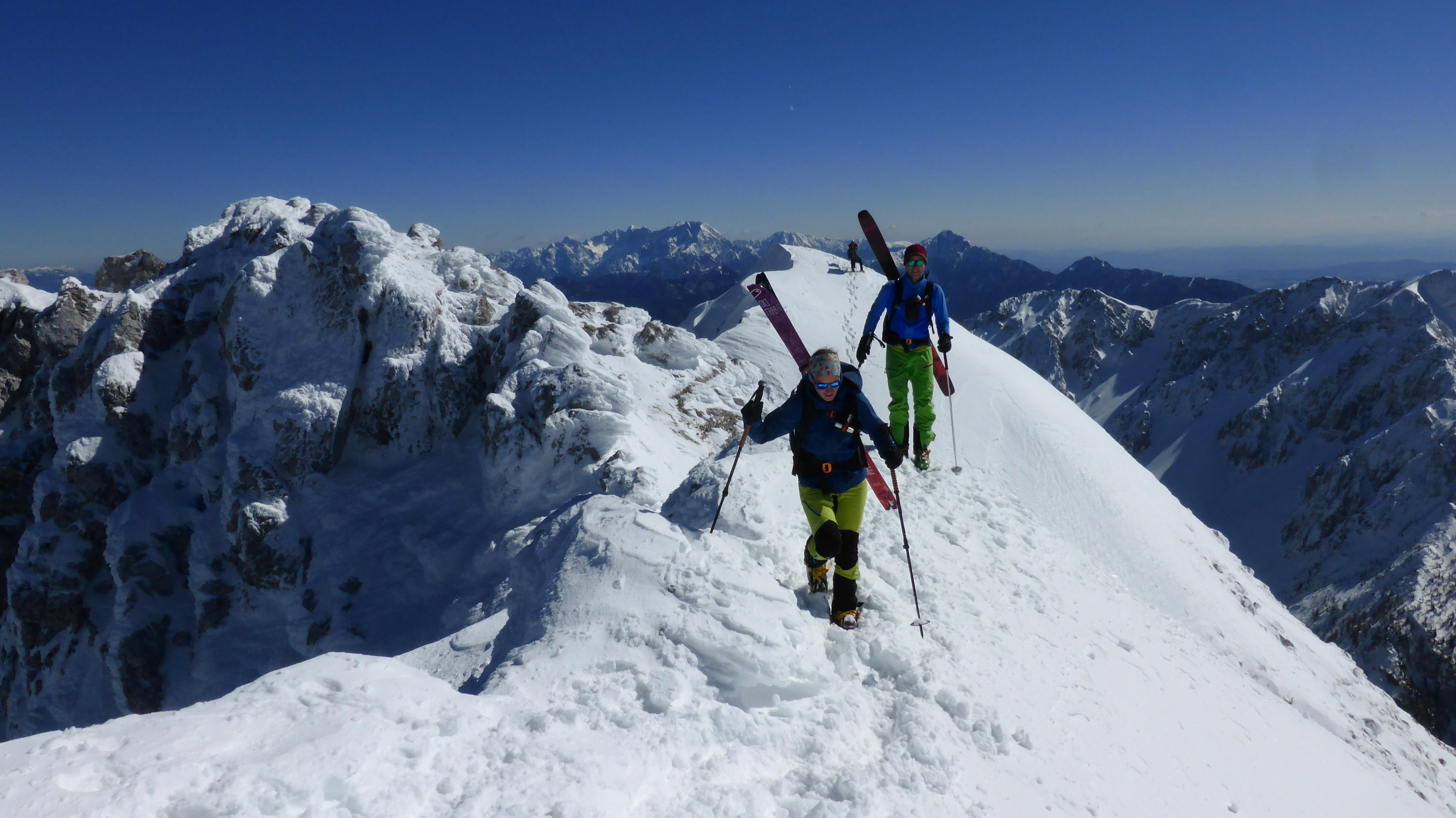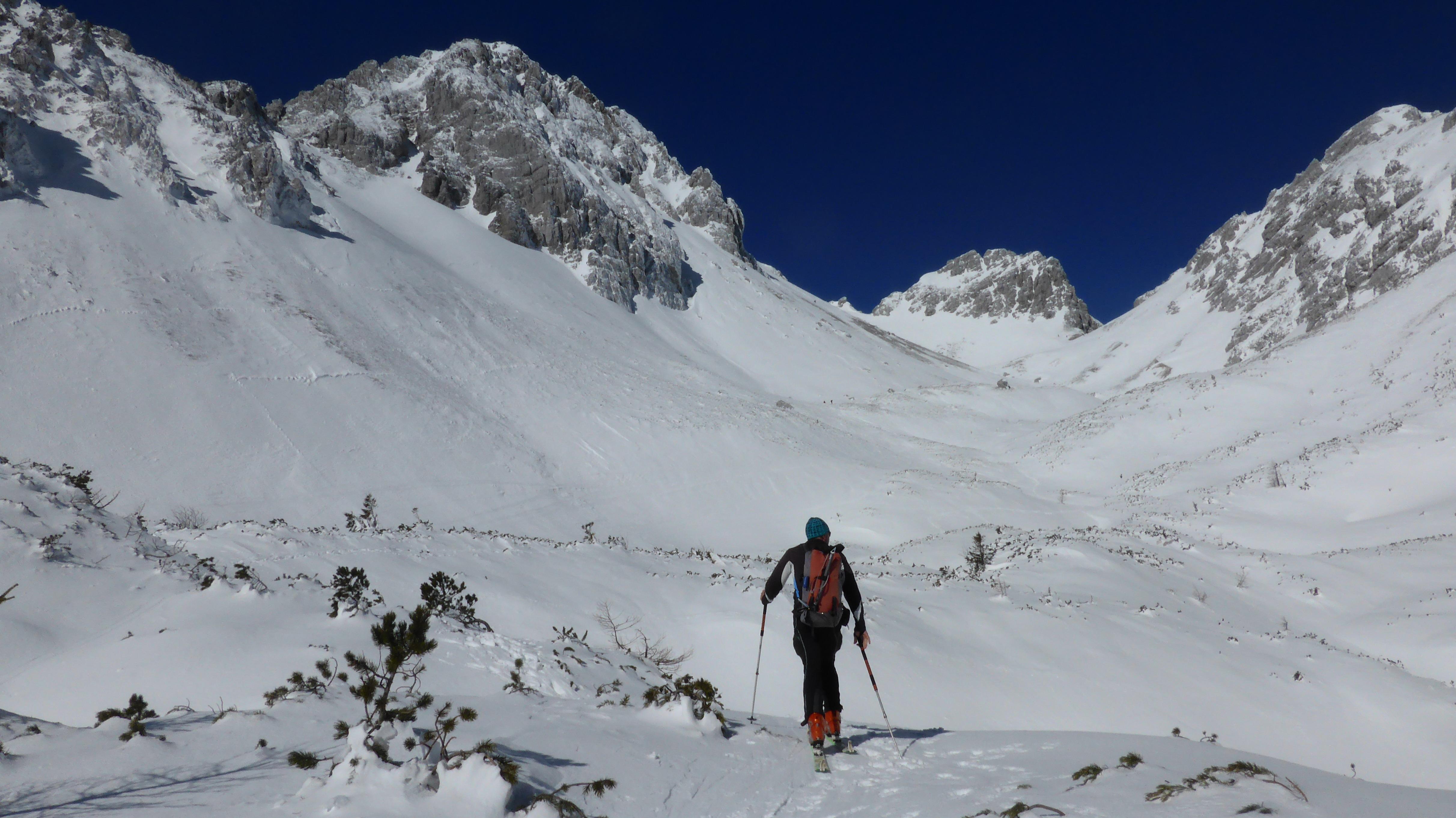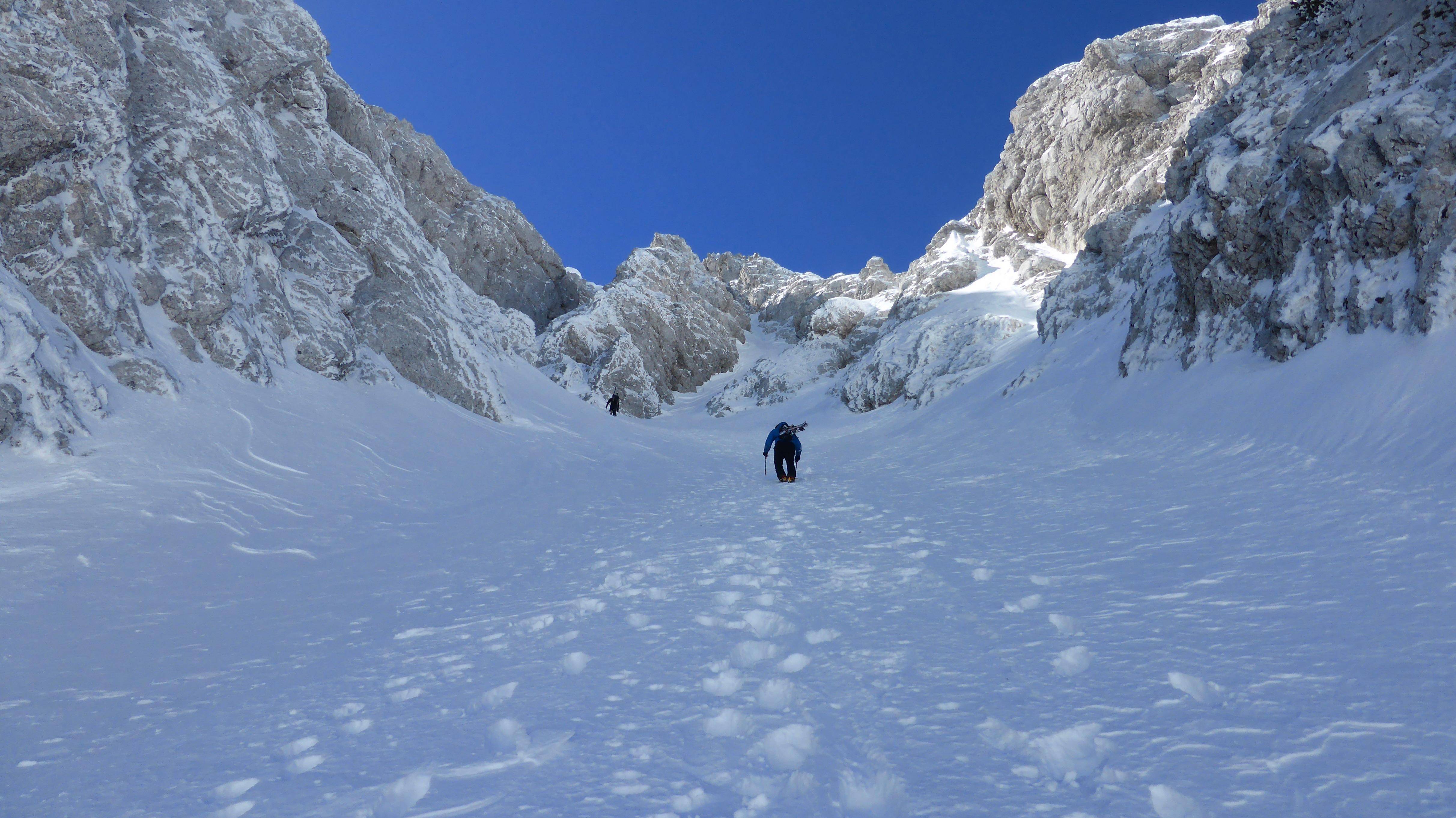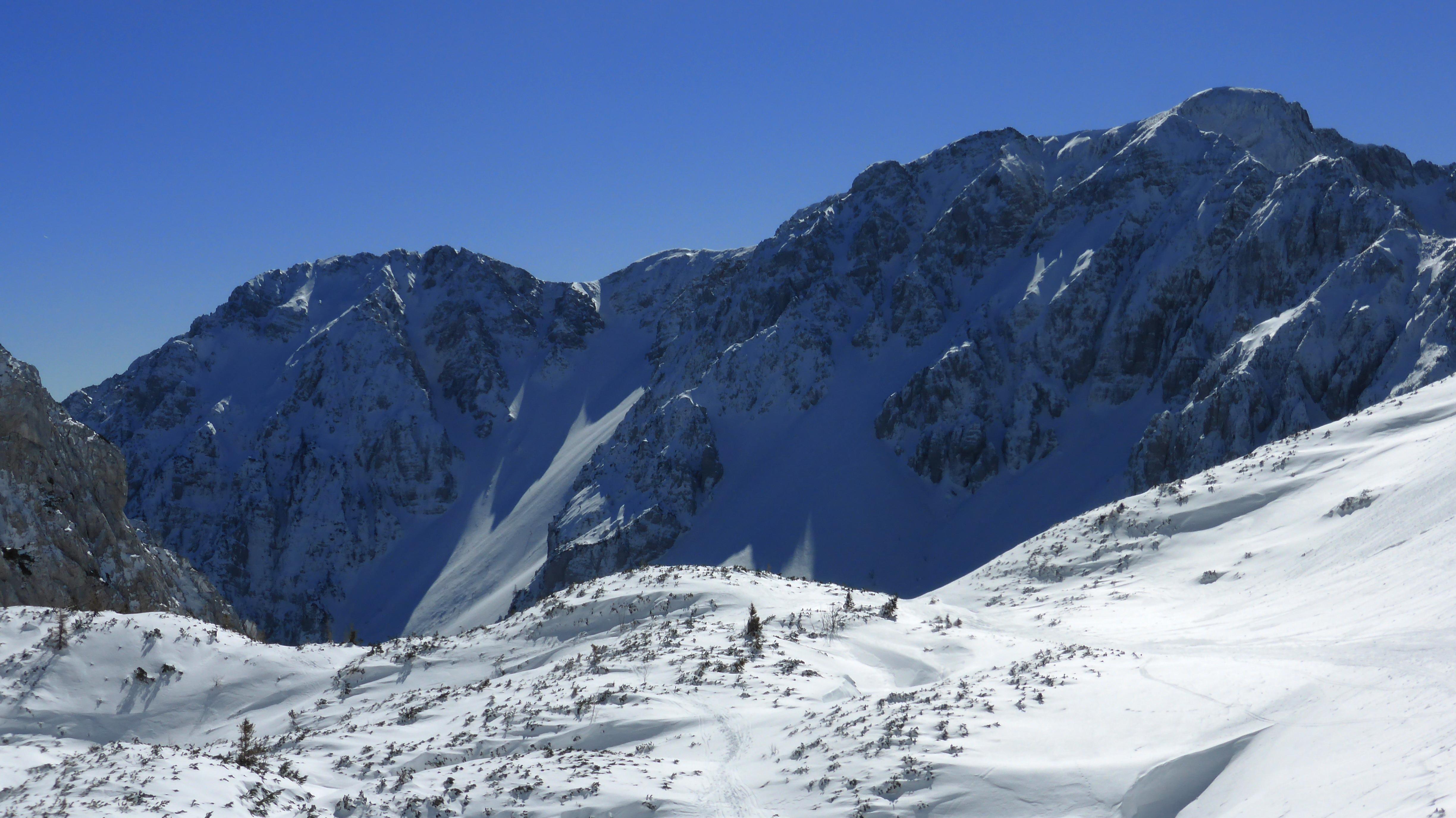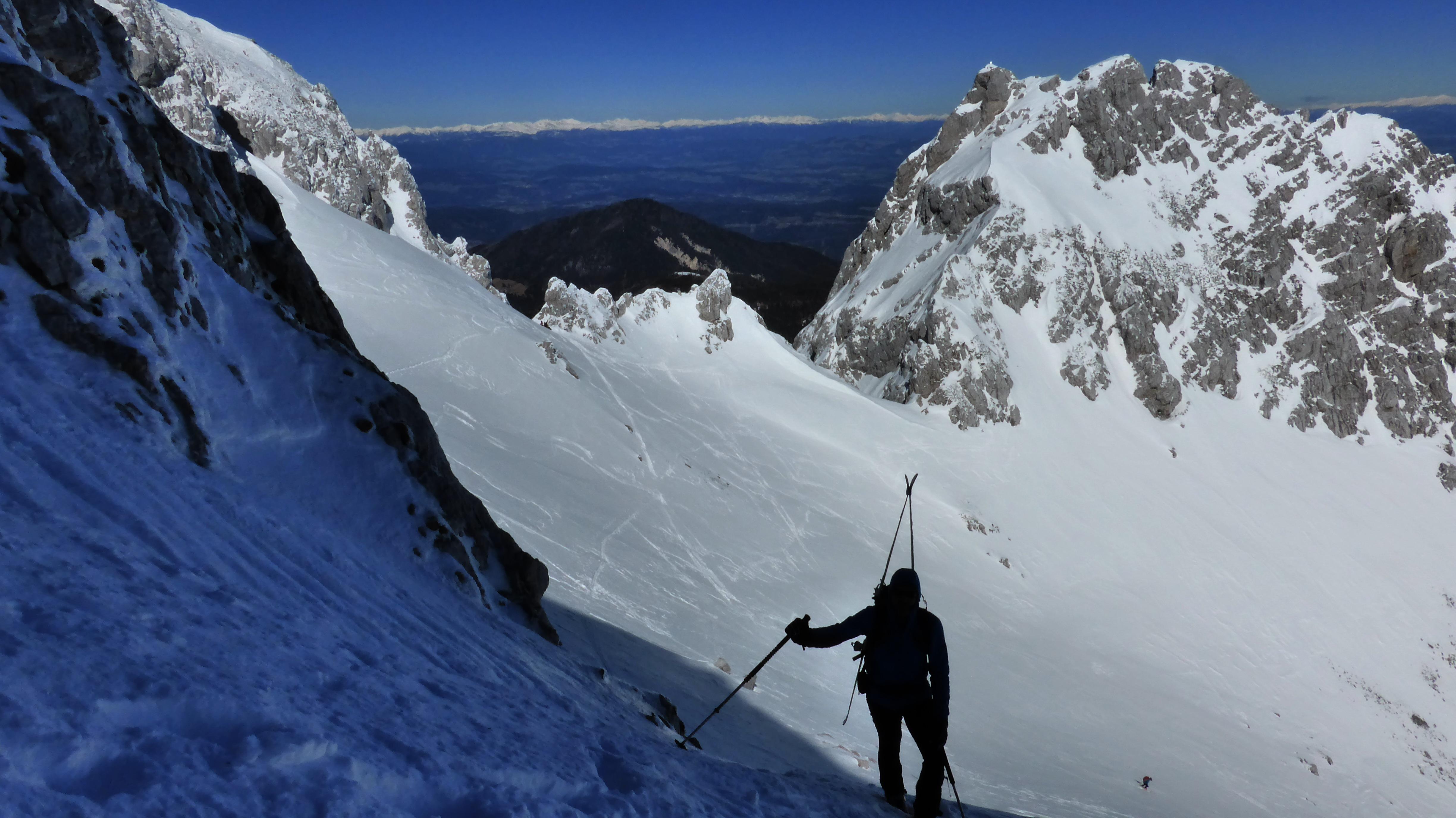 ...vom Loibl-Südportal über die Zelenica ins Kar der Suho Ruševje und über die zur Y-Rinne auf den Gipfel. Abfahrt über Südrinne zum Dom pri Izviru Zavrsnice und zurück zur Zelenica.