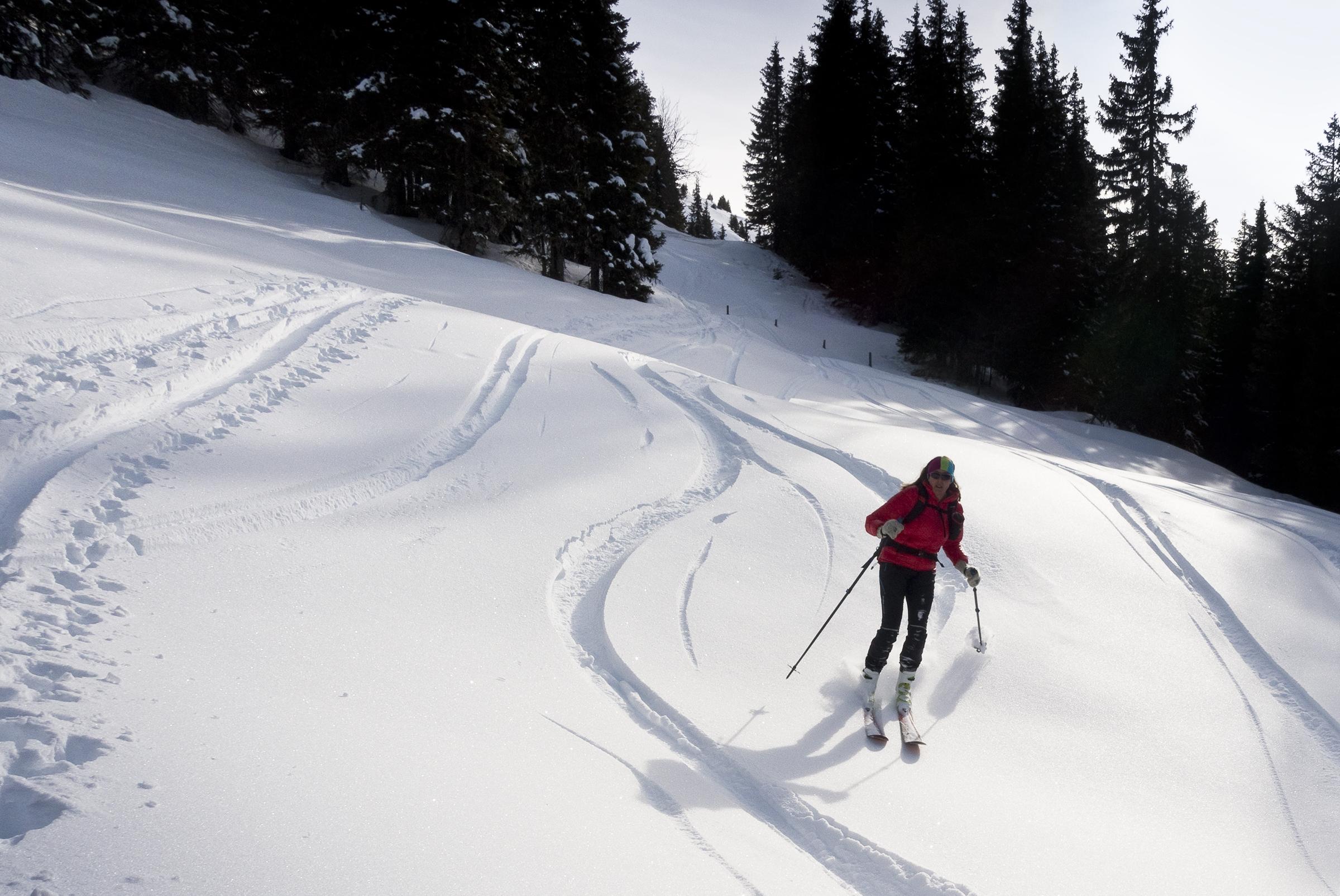Aus dem Exenbachgraben,- keine Geheimtour, - aber wir haben nur einen anderen Tourengeher getroffen. Südseitig natürlich Bruchharsch. Aber wer am Waldrand oder im Wald abfährt, kann hier noch richtigen Pulverschnee antreffen. Über der Baumgrenze und am Grat ist die Schneedecke windbehandelt. Aber heute ging sogar die steile Nordostflanke des Gernkogel zu fahren, ganz oben kein Triebschnee, nur gut fahrbarer etwas verfestigter Pulver, der leider im Mittelteil dann tückische windgepresste Felder aufwies. Man umfährt danach den nördlichen Gratausläufer und muss für den Anstieg zurück in die Langeckscharte nochmal auffellen. Hat sich gelohnt heute!