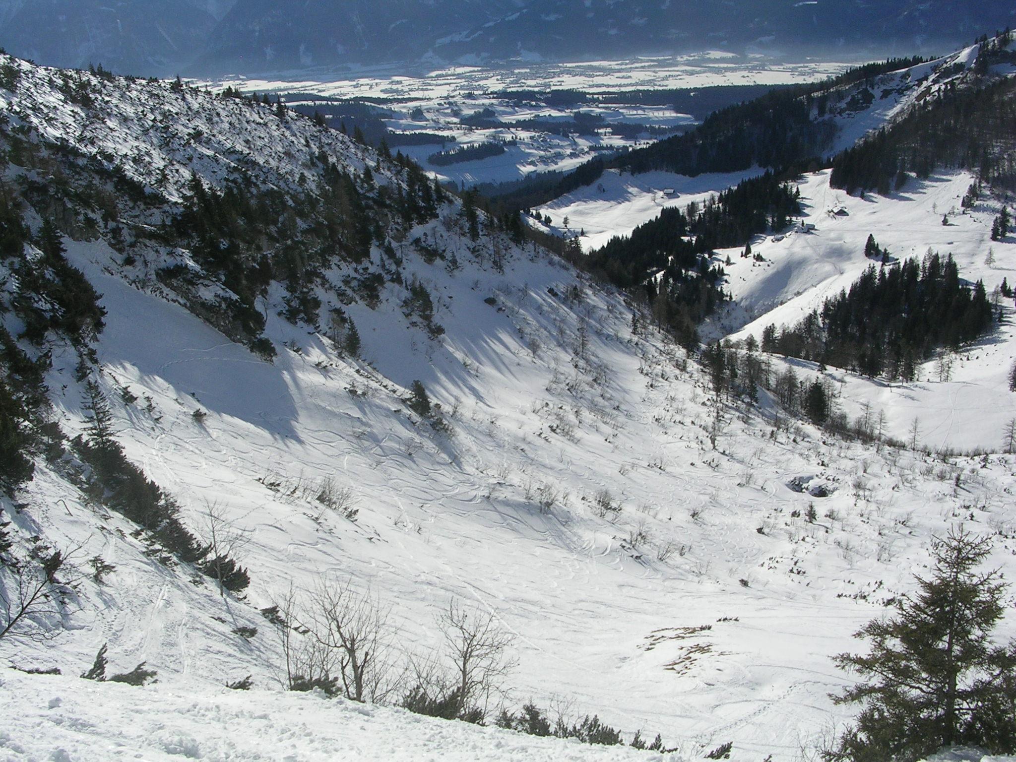 Vom Parkplatz im Tauglboden auf den Schmittenstein. Abfahrt in den Tennerwinkel, weil der Pulverschnee so verlockend ausgesehen hat, und Wiederanstieg. Dann war vorgesehen, bei Firn auf der Südseite in den Tauglboden abzufahren. Da ich aber meine Mütze verloren hatte, bin ich wieder in den Tennerwinkel gefahren. Die Mütze war natürlich ganz unten beim Umkehrpunkt am Beginn der Forststraße nach Kasbach.