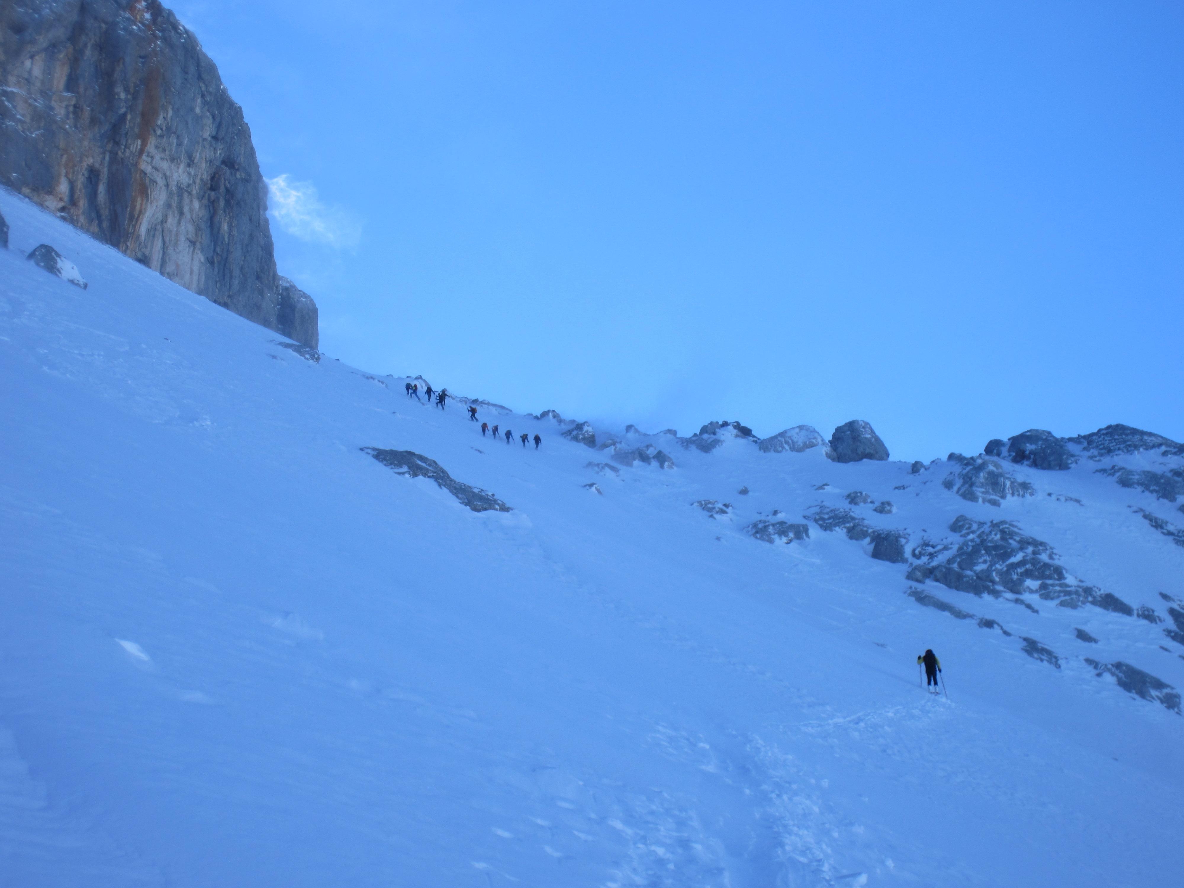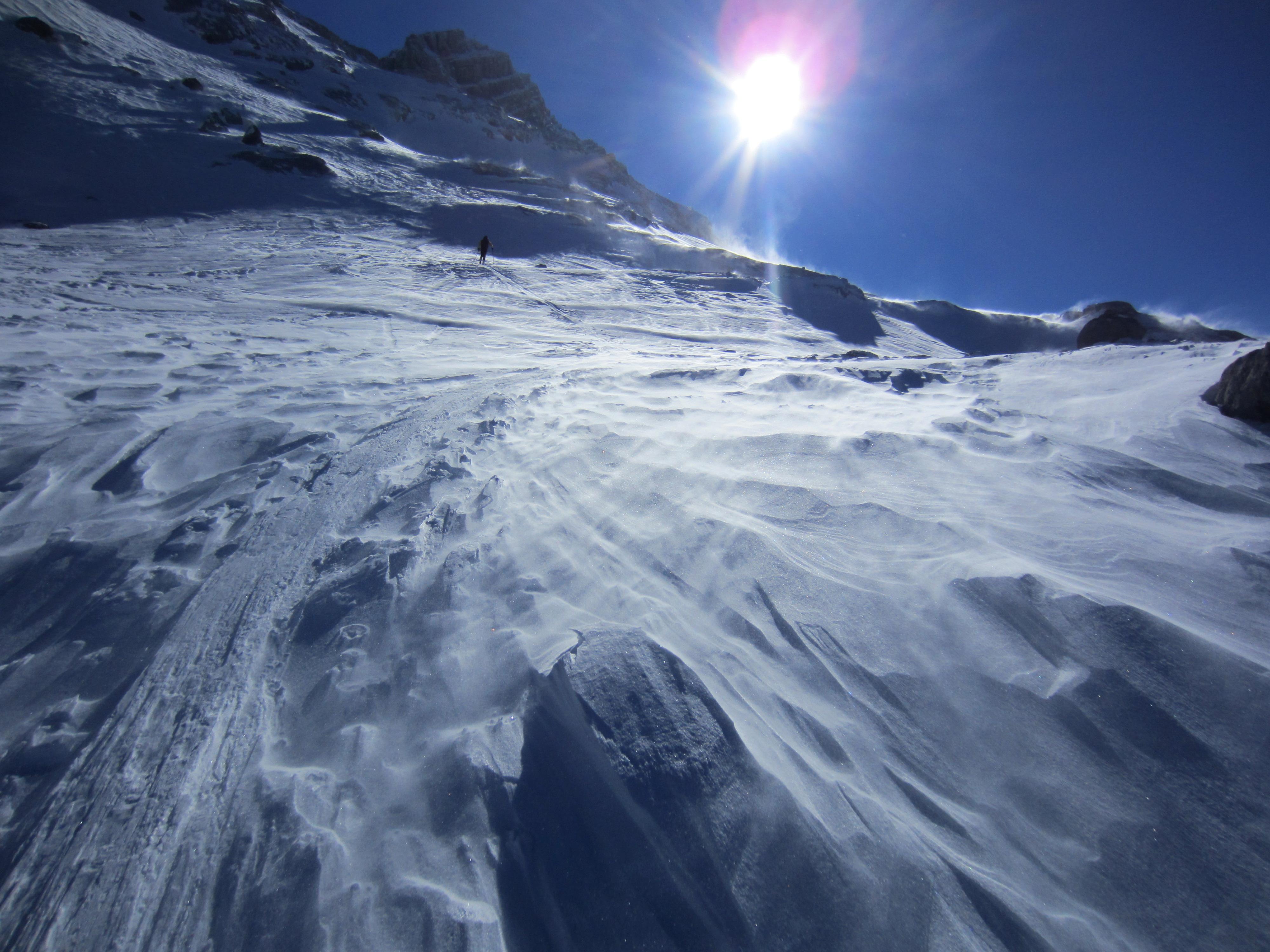 Es sollte eine einsame, lange Pulverschneetour mit einer genialen Abfahrt werden. Nich alles traf heute zu: Der Parkplatz beim Hackerbauern war un 9 Uhr bereits über voll. Im Waldbereich herrliche Spur in schönem Winterwald. Ab einer Höhe von 2200m begann es dann fürchterlich zu stürmen und im Triebschnee entspechend schlecht zu gehen, man rutschte immer wieder weg. Die Seile am Gipfelanstieg waren zum grüßten Teil frei, so war der vereiste Weg kein Problem.