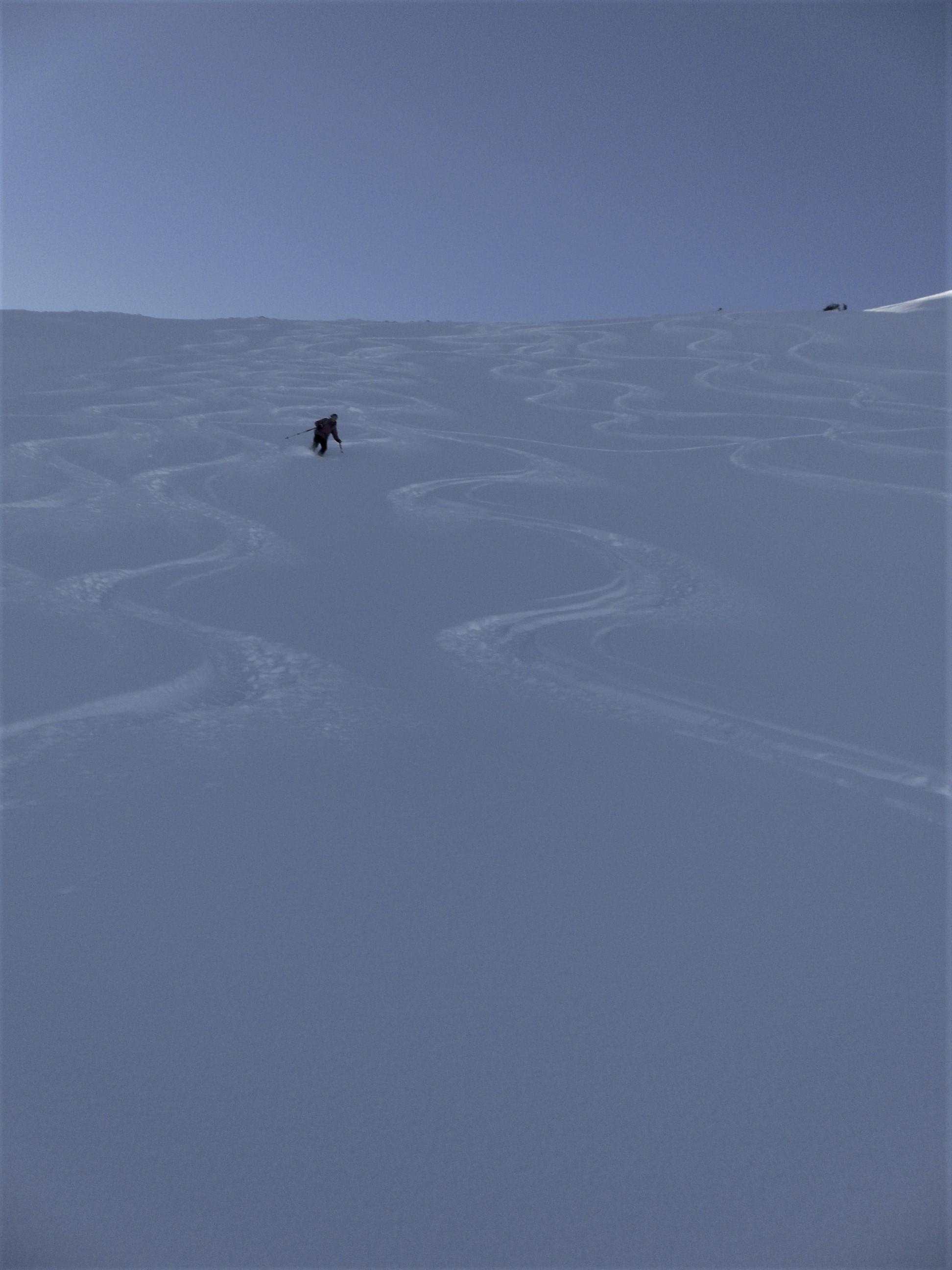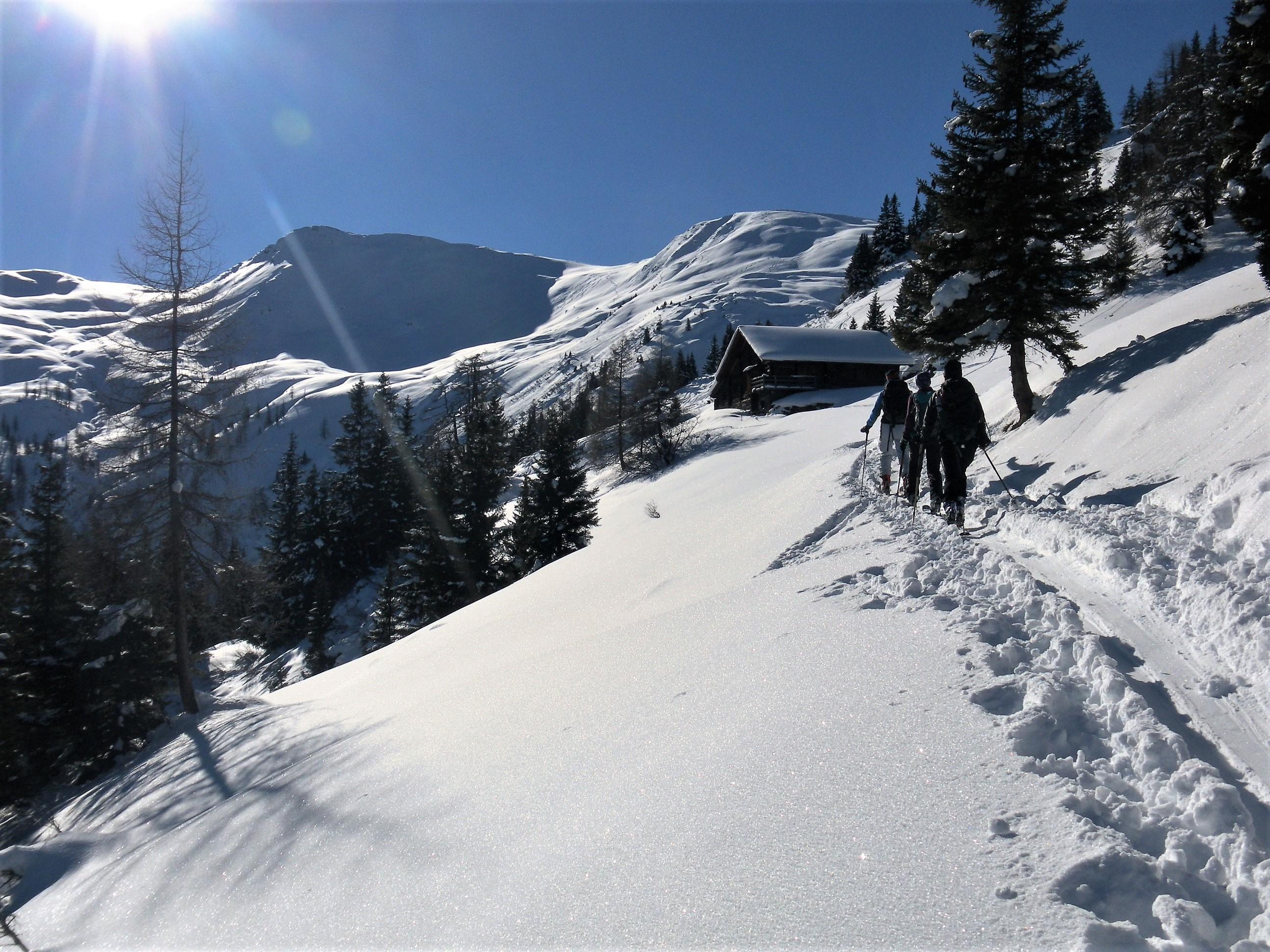 Der Güterweg hat eine durchgehende Schneeauflage, im Tofernkar liegt leicht gesetzter Pulverschnee mit einer kräftigen Rauhreifauflage. In unserem Tourenbereich finden wir kaum eine Spannung in der Schneedecke, die wenigen Triebschneepakete sind gut erkennbar. Der Rücken zum Finsterkopf ist abgeblasen.