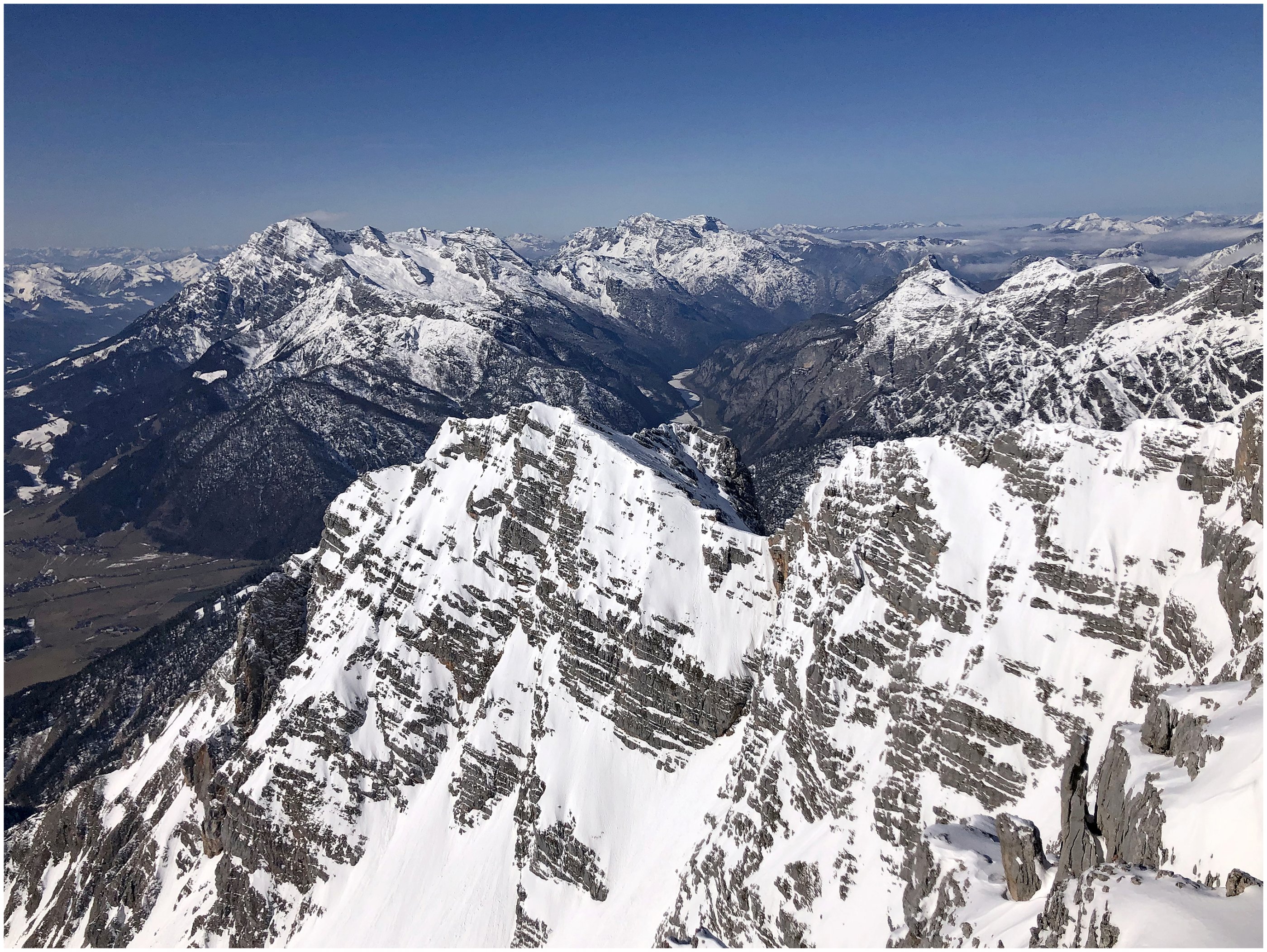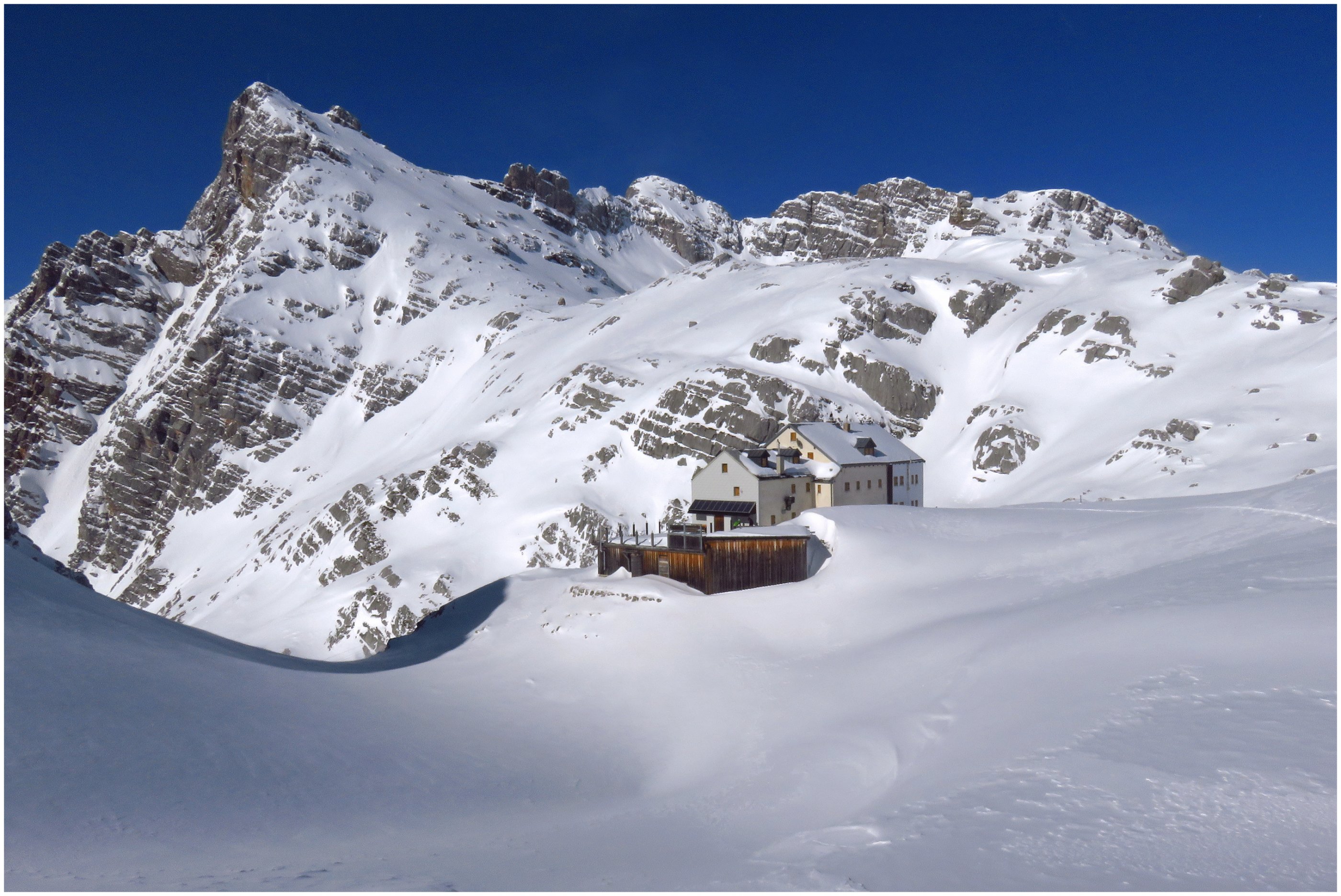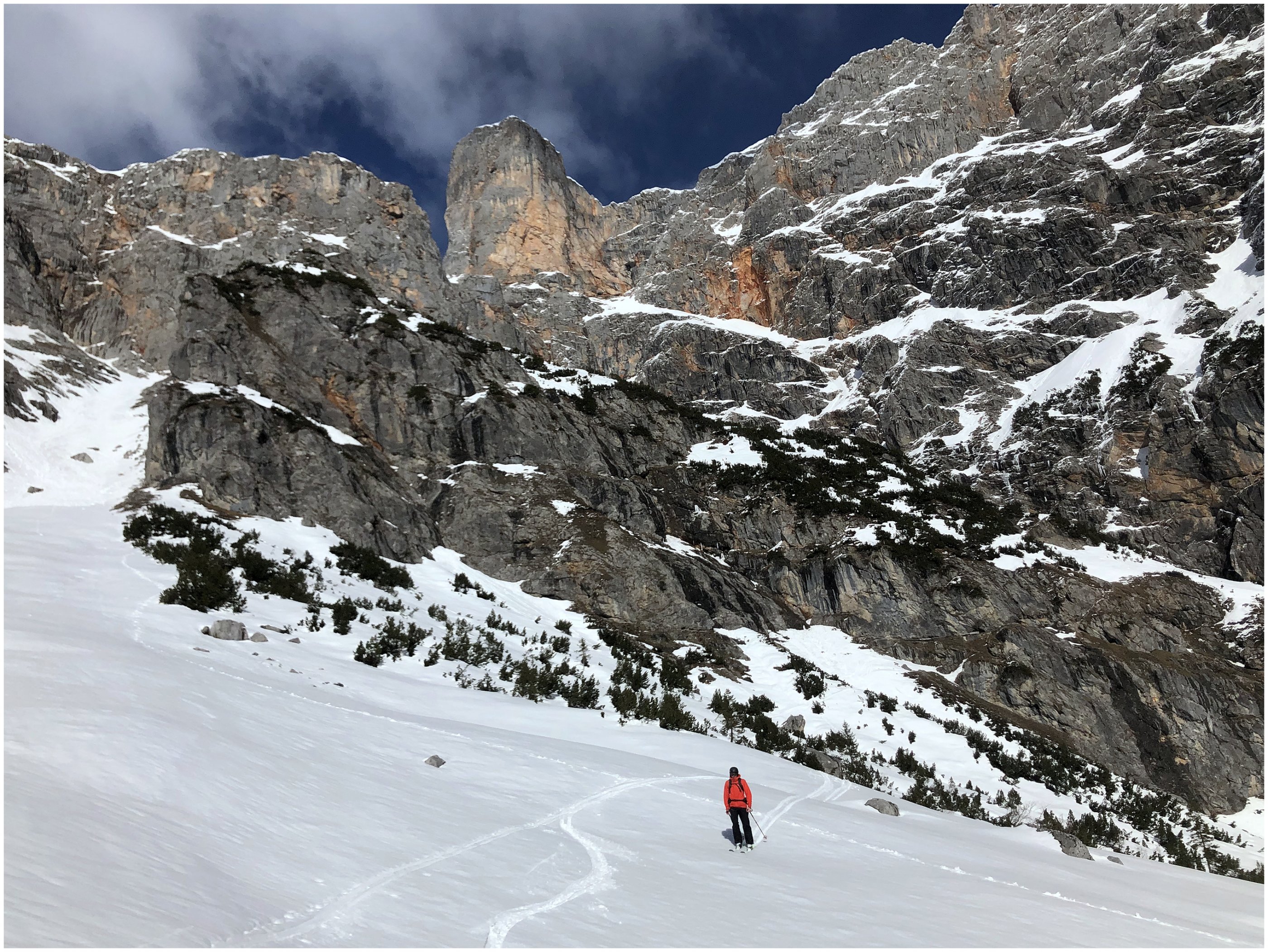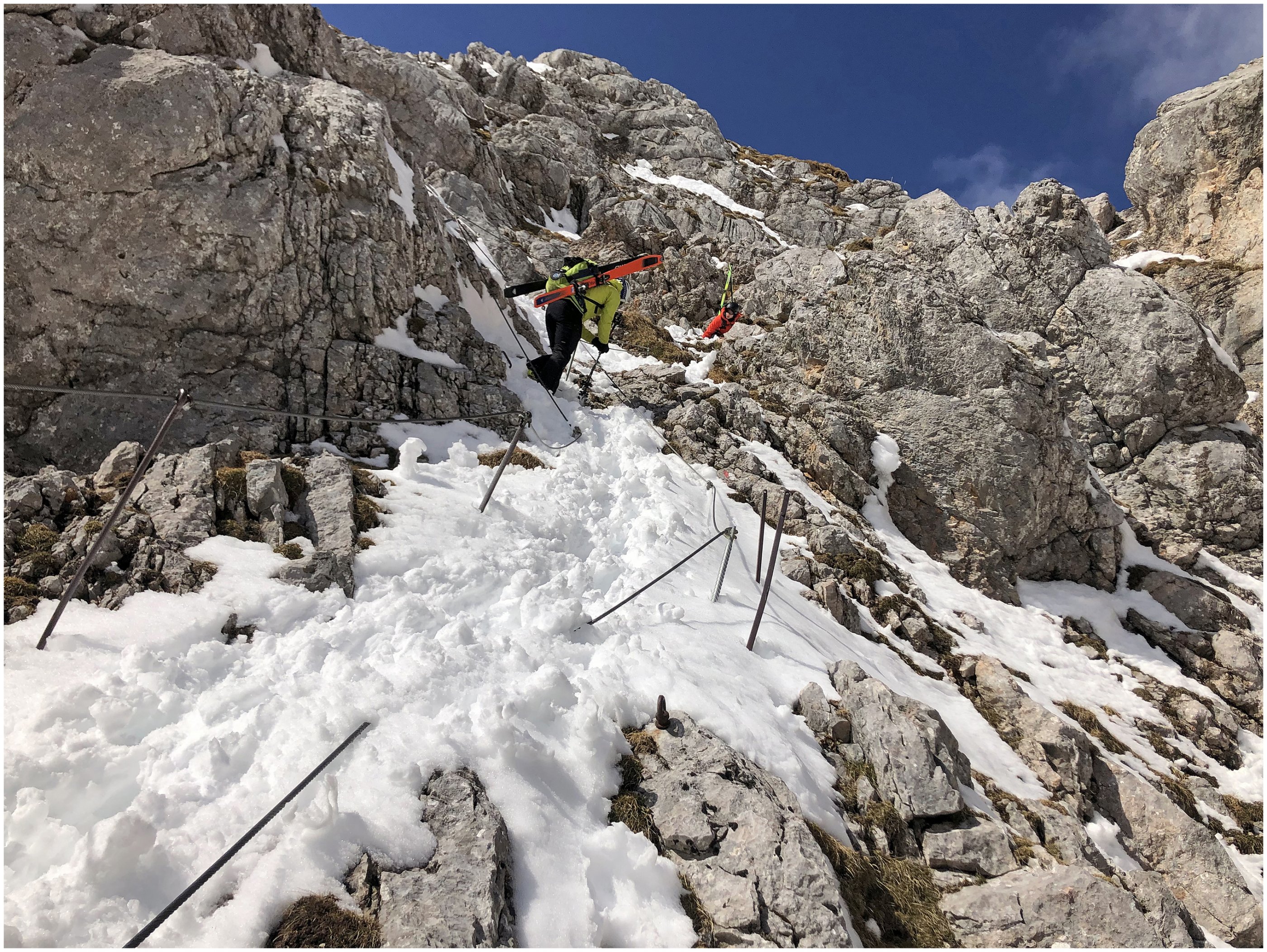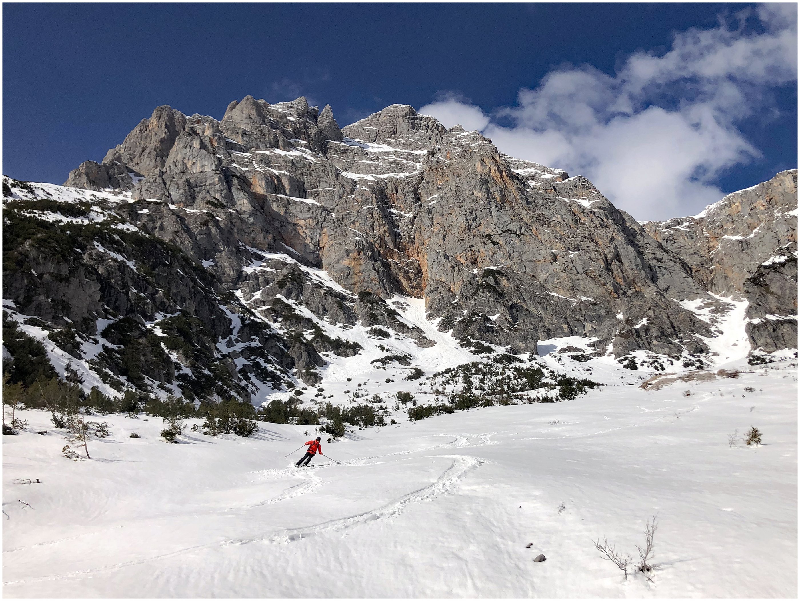 Die Skitour ist vom Parkplatz bis zum Gipfel mit Ski möglich, ausgenommen in den seilversicherten Abschnitten. In den Steigpassagen liegt guter Stapfschnee und die Sicherungsseile liegen zum Großteil frei. Lawinenlage (1-2) und Tagesgang (Abstieg/Abfahrt vor 12:00Uhr) beachten. Von feinem Pulverschnee über Nassschnee bis super Firn durften wir alles genießen.