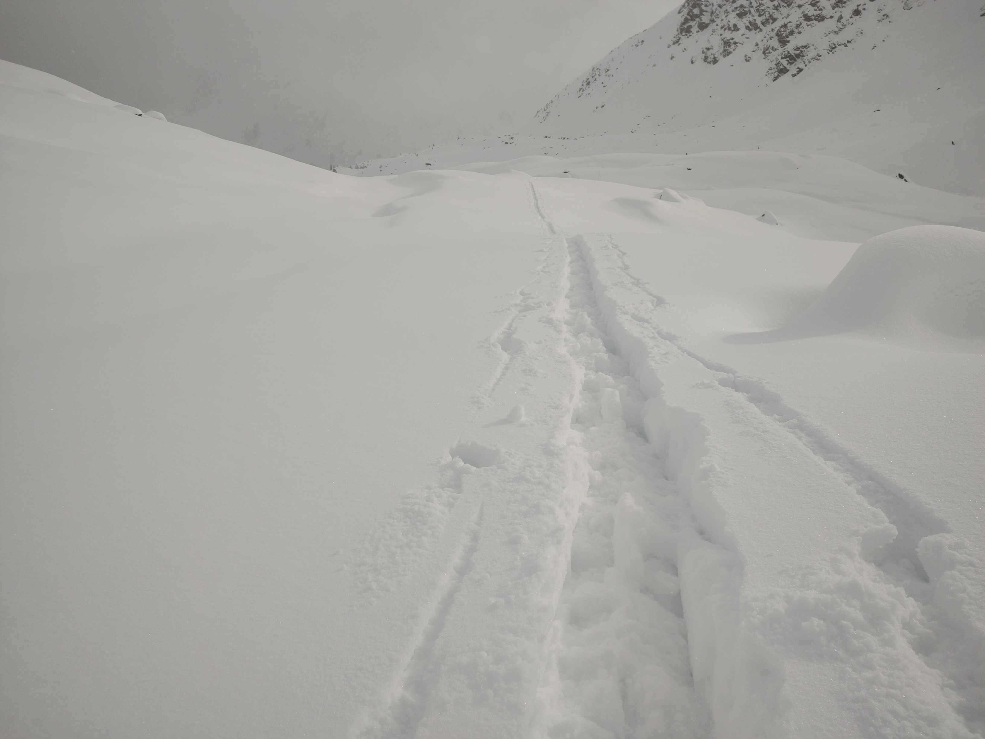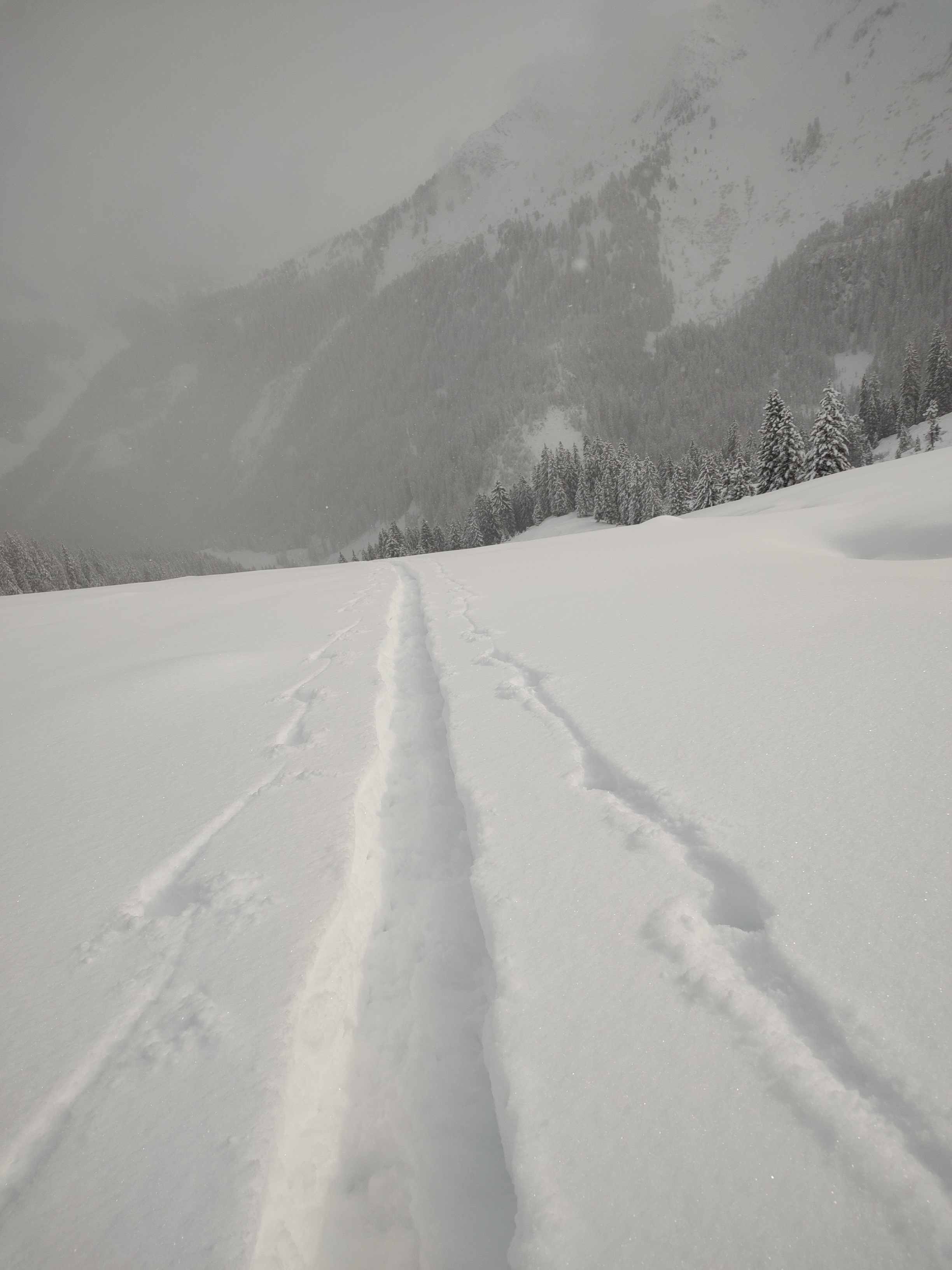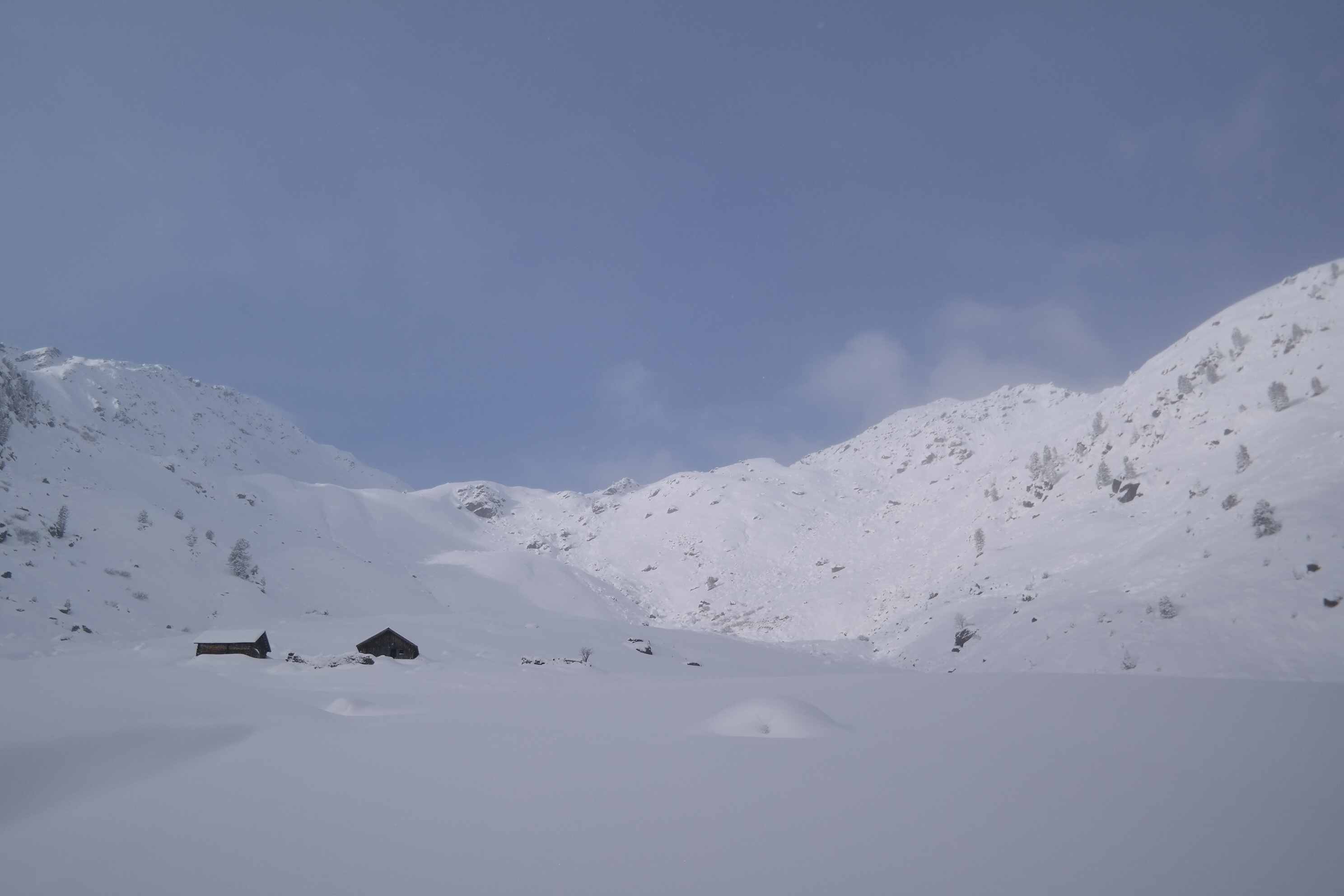 Im Wald viel zu wenig Schnee für eine Abfahrt, auf Forstraßen ausreichend. Oberhalb der Waldgrenze 30-50 cm Neuschnee, aber großteils ohne ausreichender Unterlage. Die Abfahrtsspur muss sehr behutsam gewählt werden. Einige Hänge bieten aber wunderbaren hüfthohen Powder.