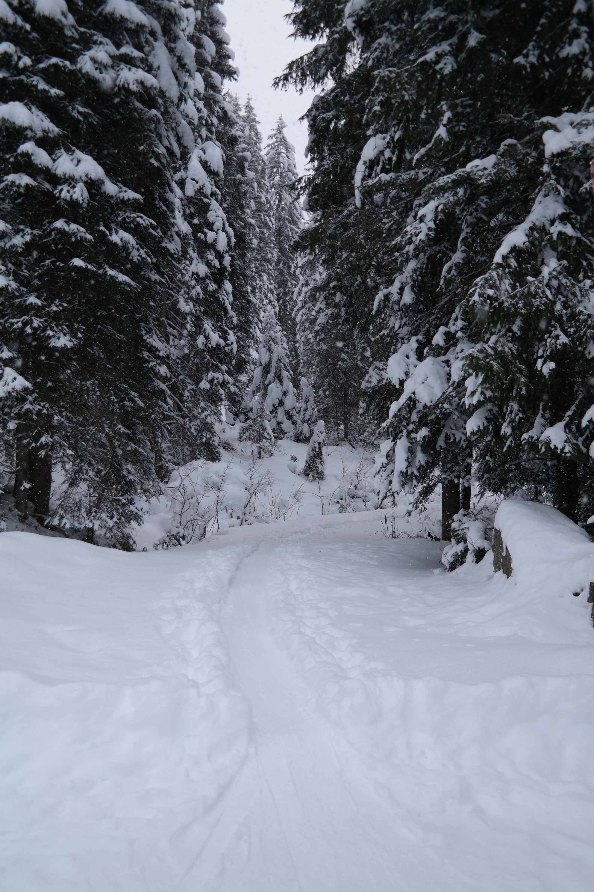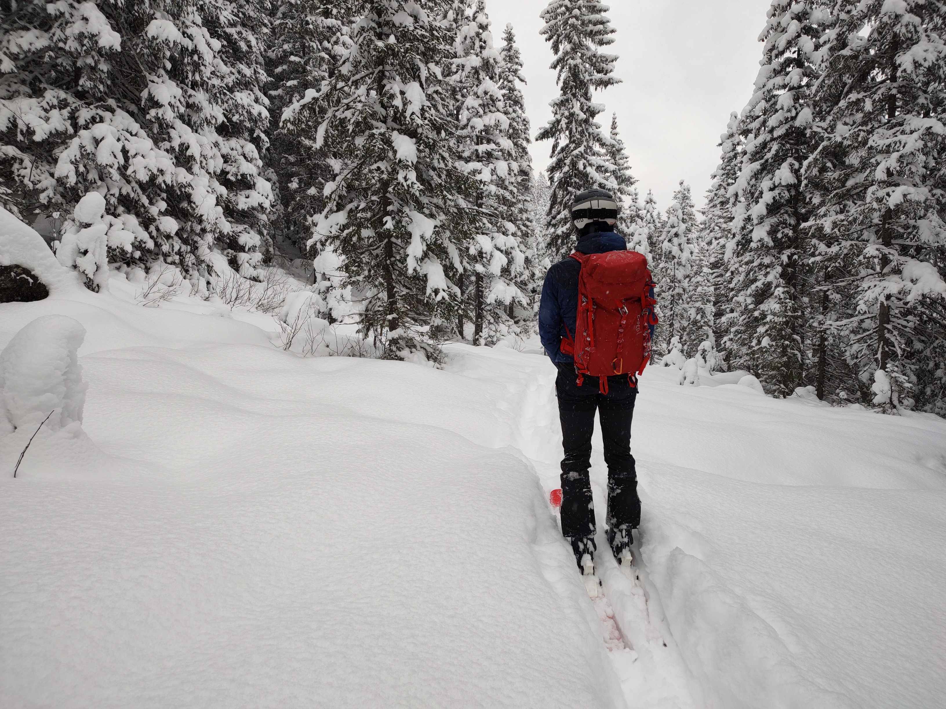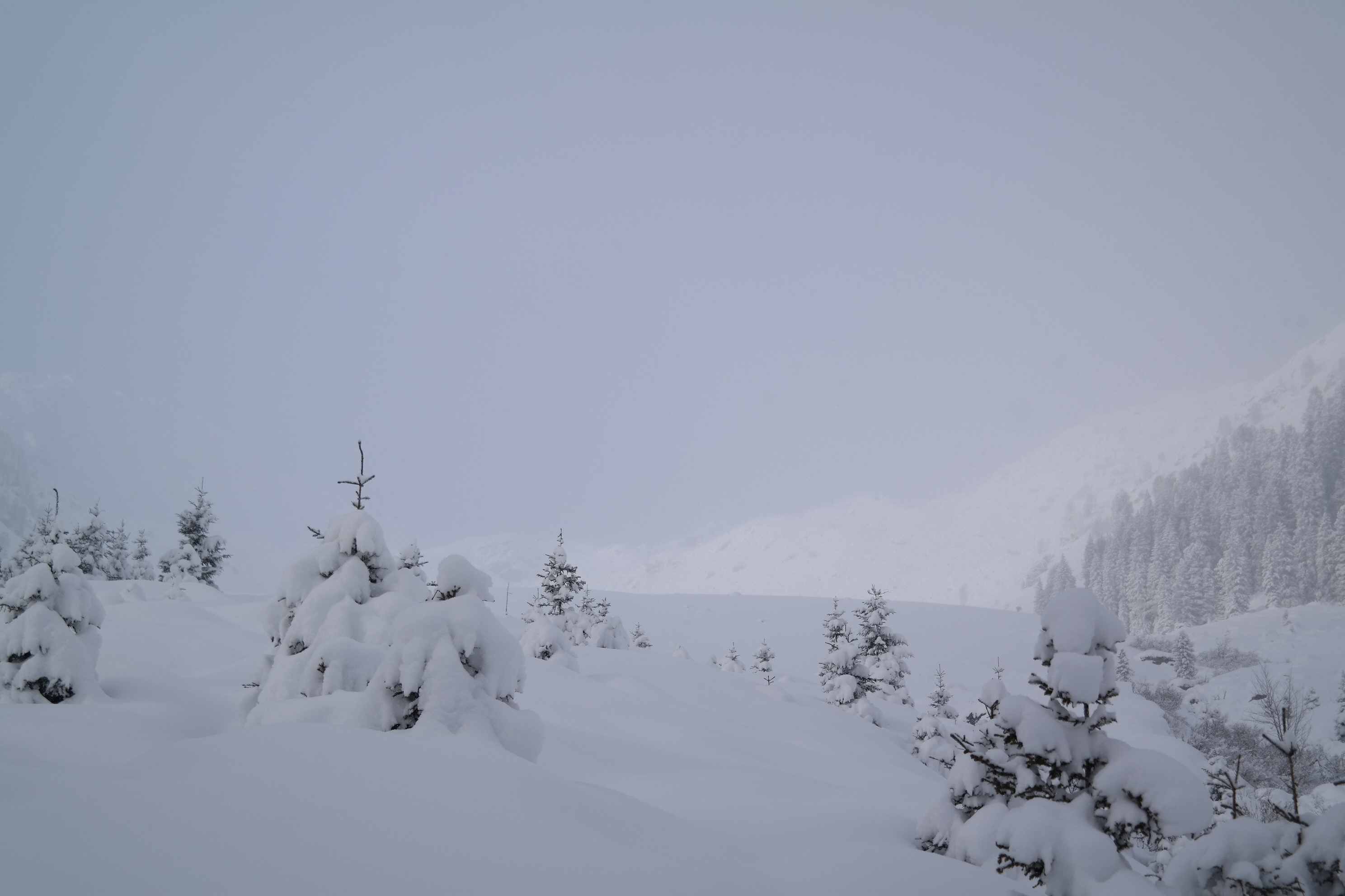 Im Wald viel zu wenig Schnee für eine Abfahrt, auf Forstraßen ausreichend. Oberhalb der Waldgrenze 30-50 cm Neuschnee, aber großteils ohne ausreichender Unterlage. Die Abfahrtsspur muss sehr behutsam gewählt werden. Einige Hänge bieten aber wunderbaren hüfthohen Powder.