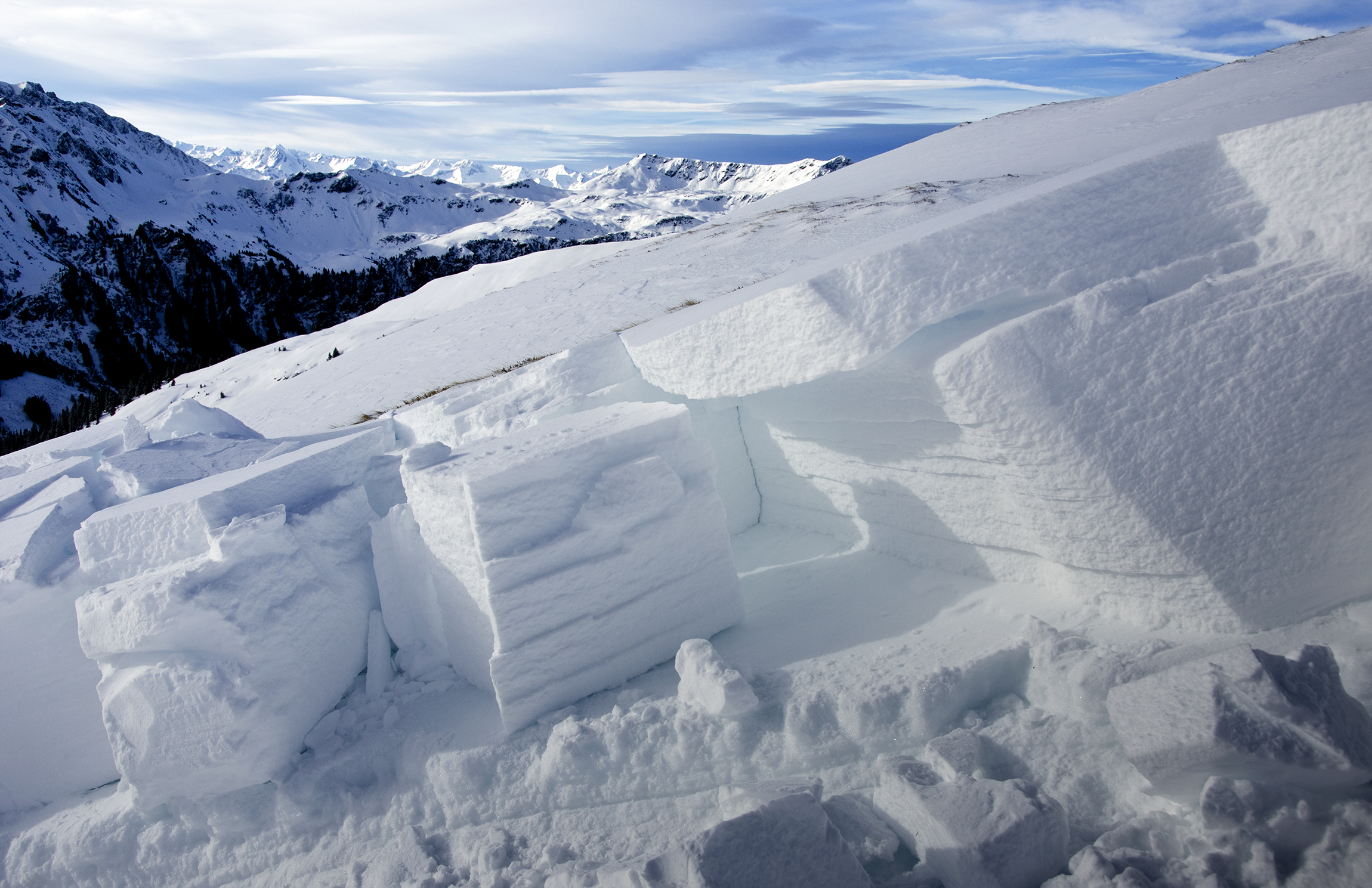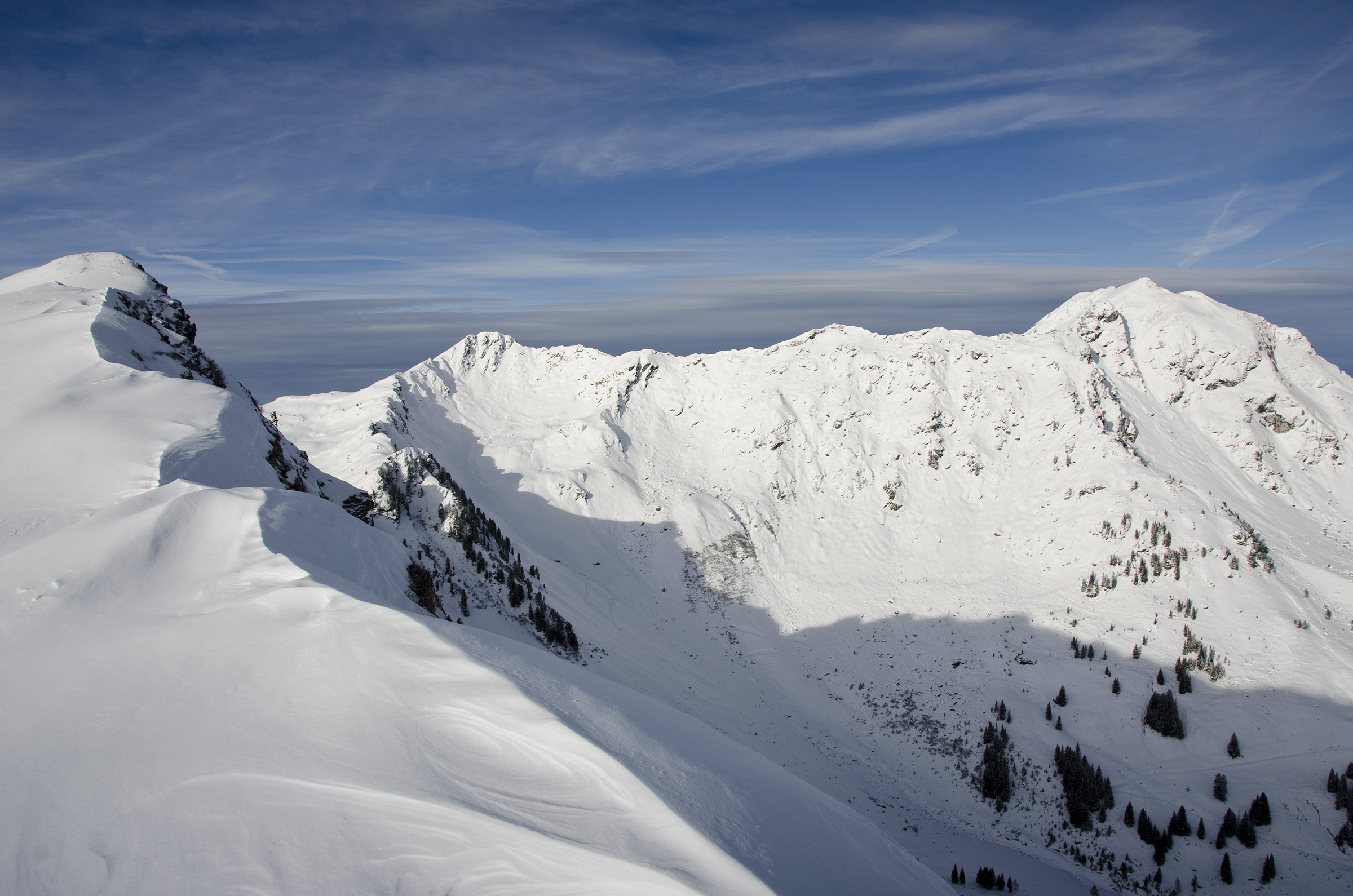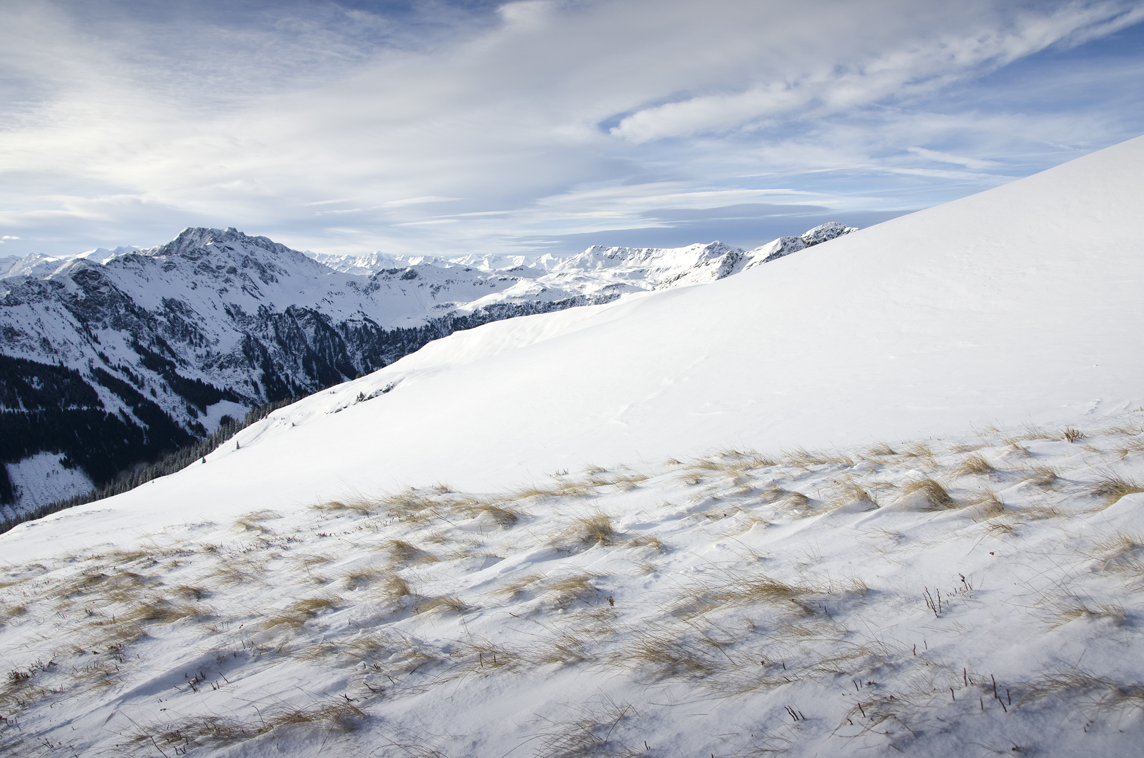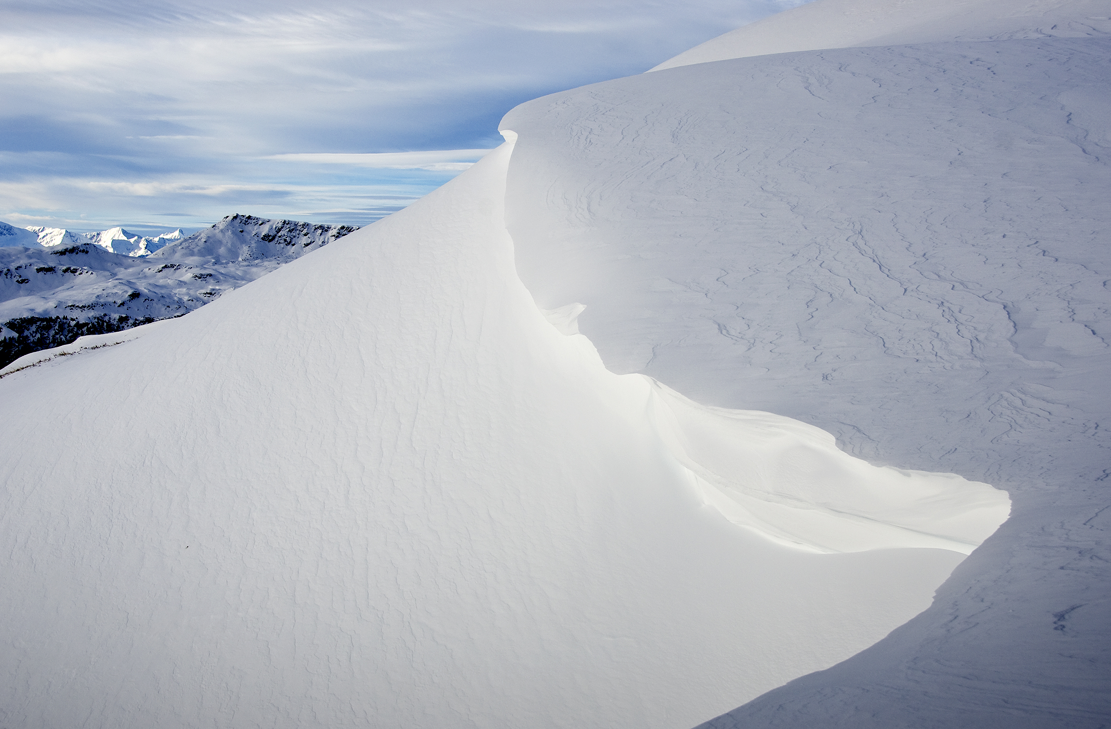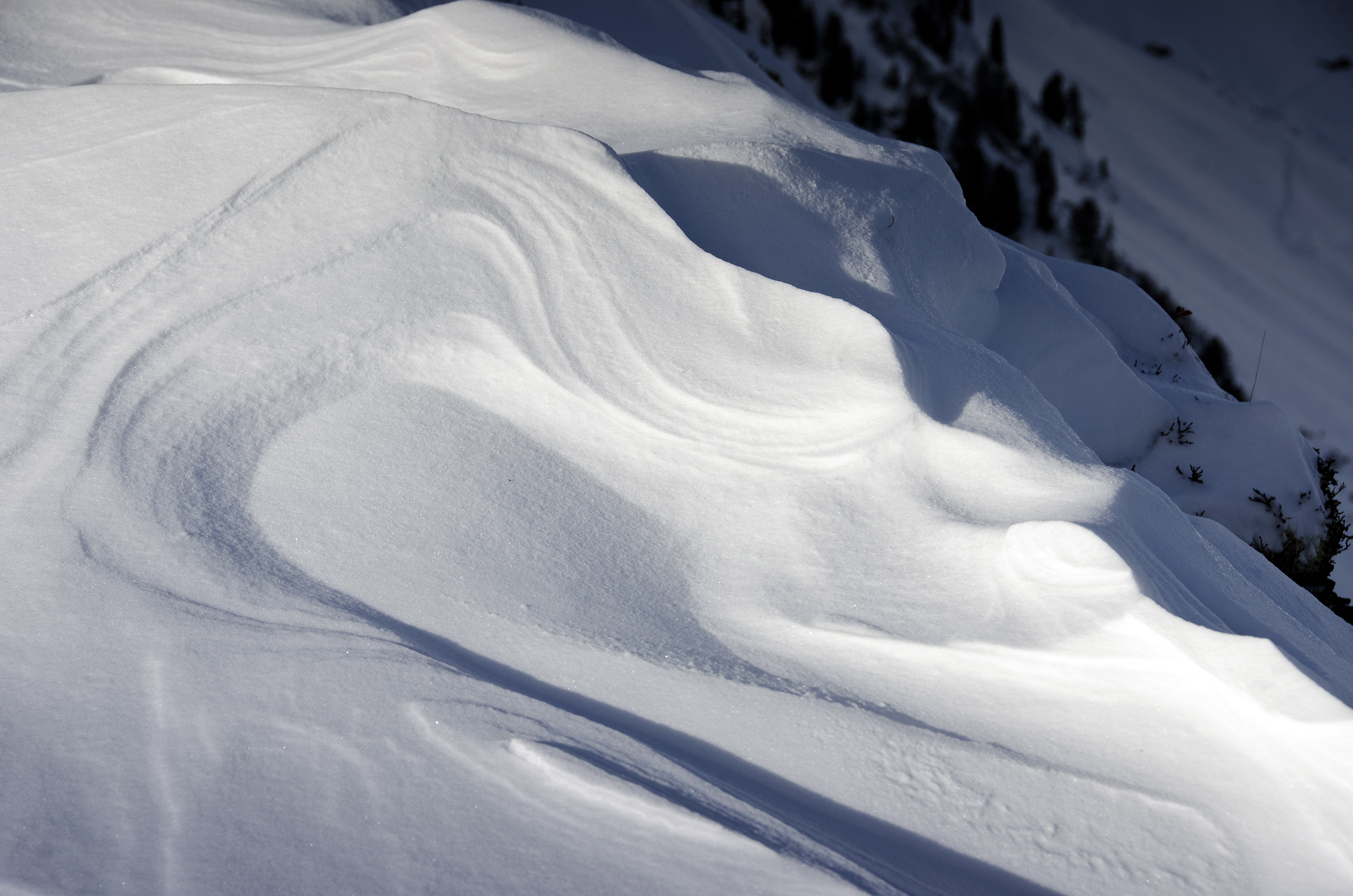 Rinnen und weniger windexponierte Flächen sind ost- und südseitig mit gepresstem Triebschnee angefüllt.