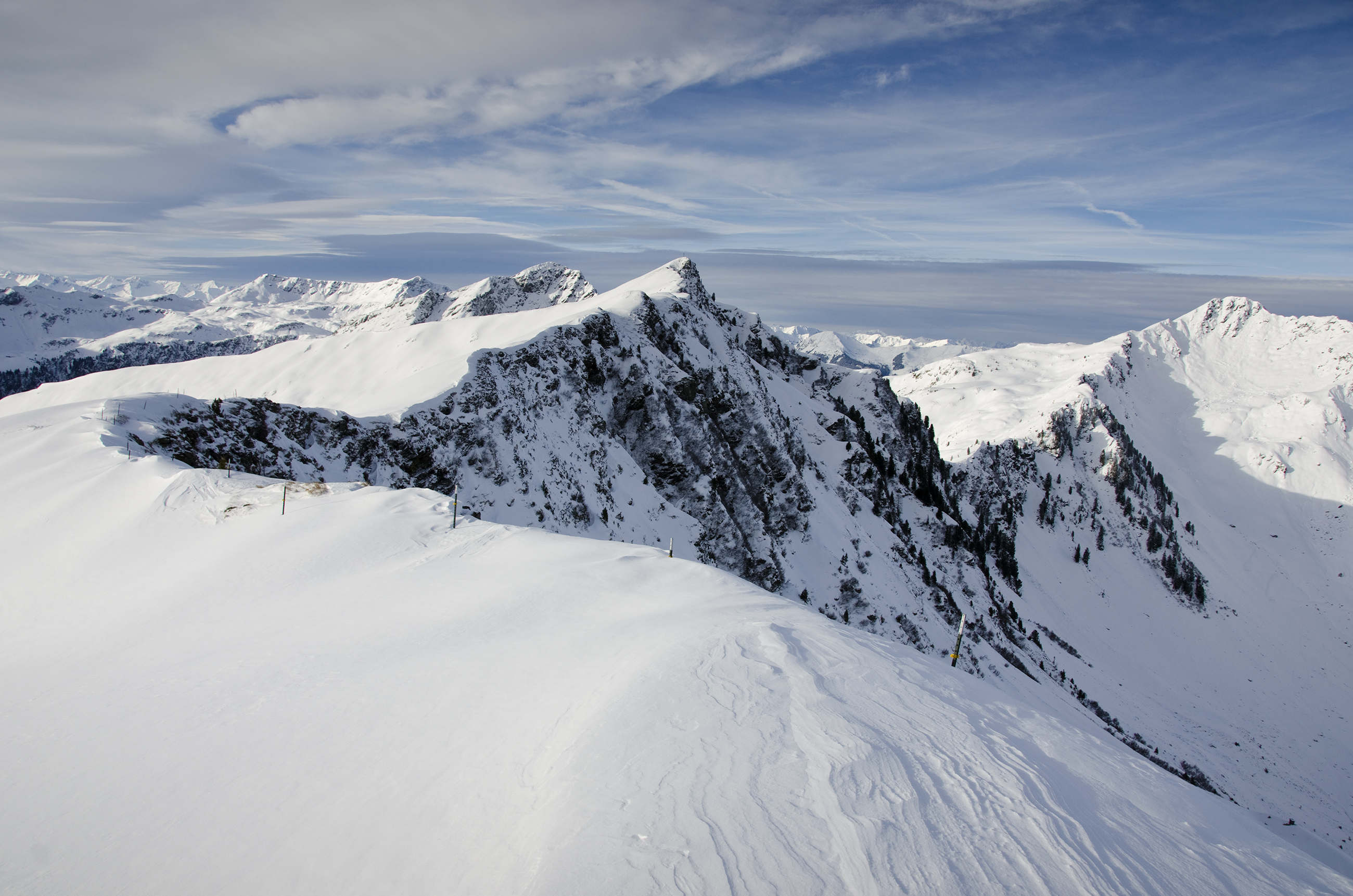 Aus dem Hochalm-Pistengebiet bin ich heute zum Spieleckkogel gewandert. Auffallend war über der Baumgrenze die ungleiche Schneeverteilung. Neben abgeblasenen grasigen Rücken mit Harsch gab es mächtige Triebschneeansammlungen in den Rinnen. Der Sturm hat also wie in den Hohen Tauern auch hier gewaltig verfrachtet.