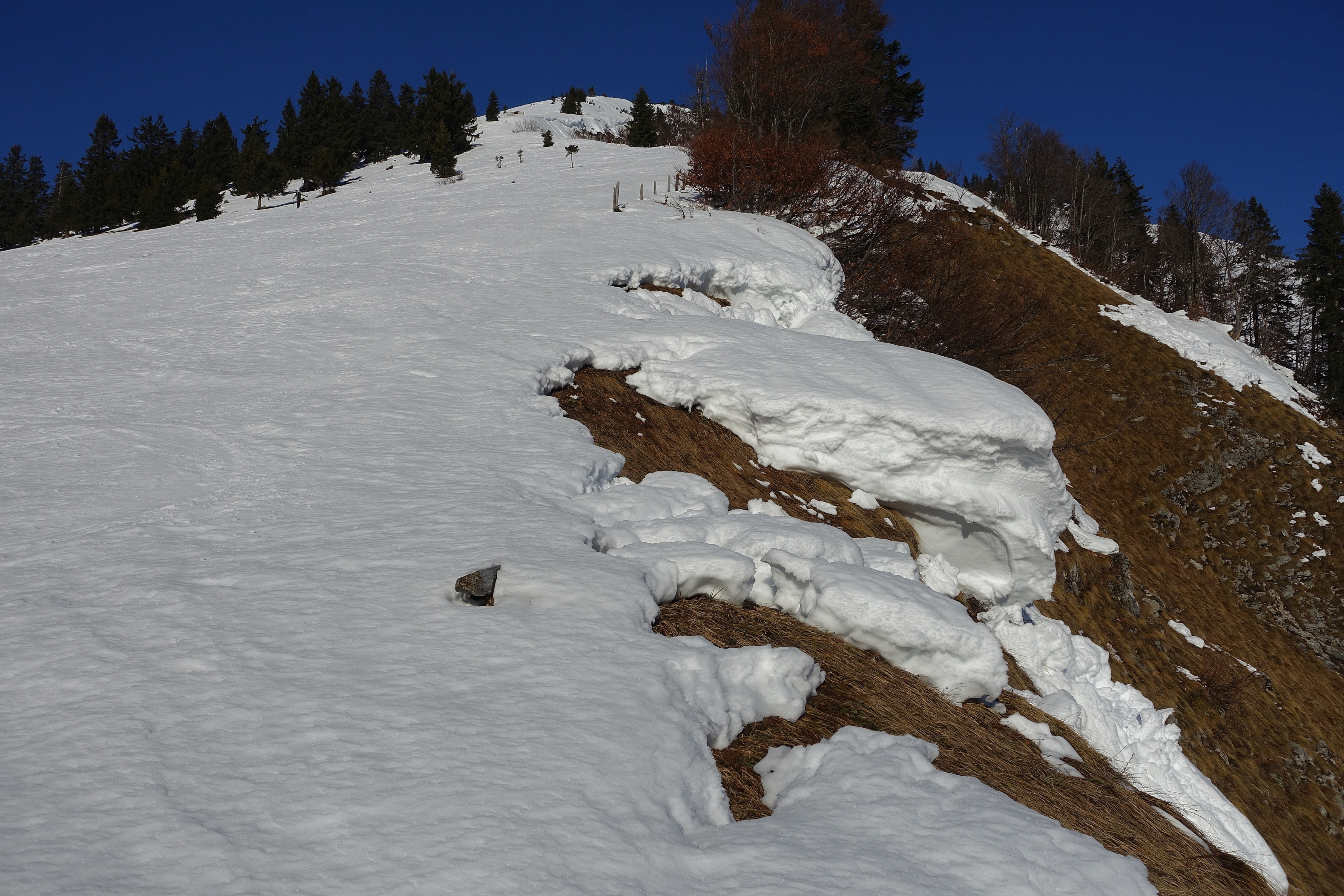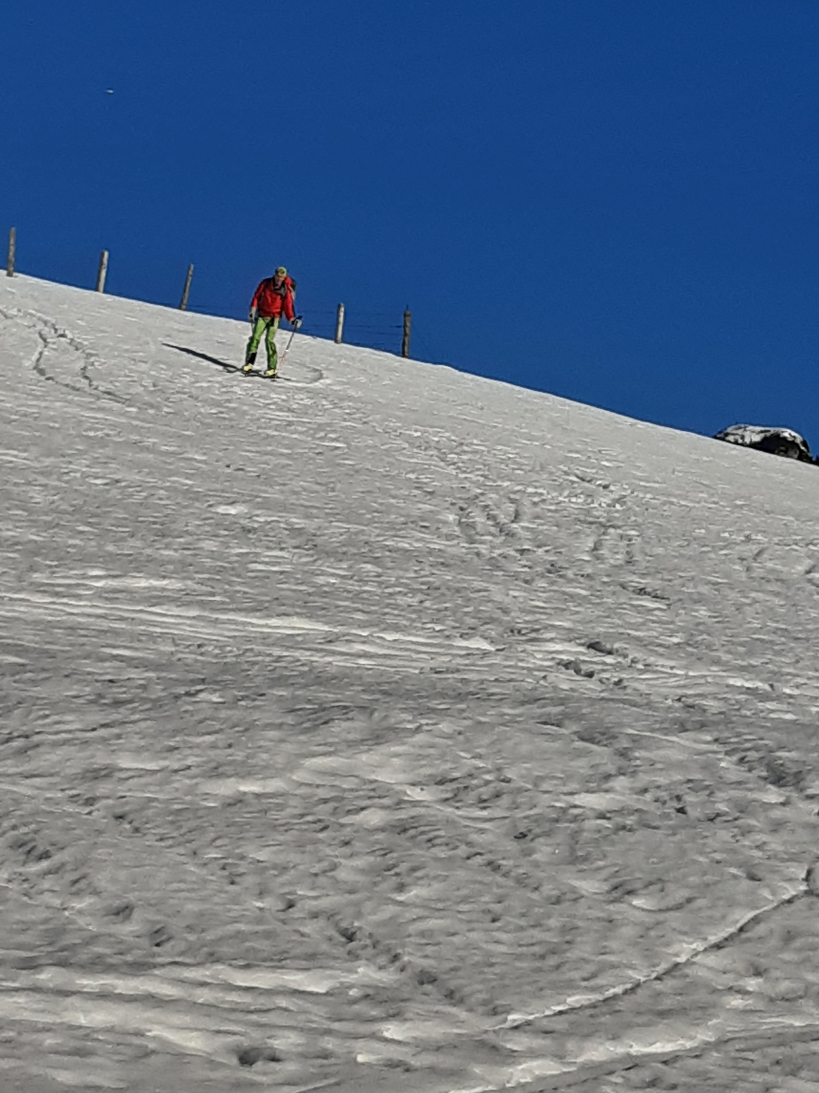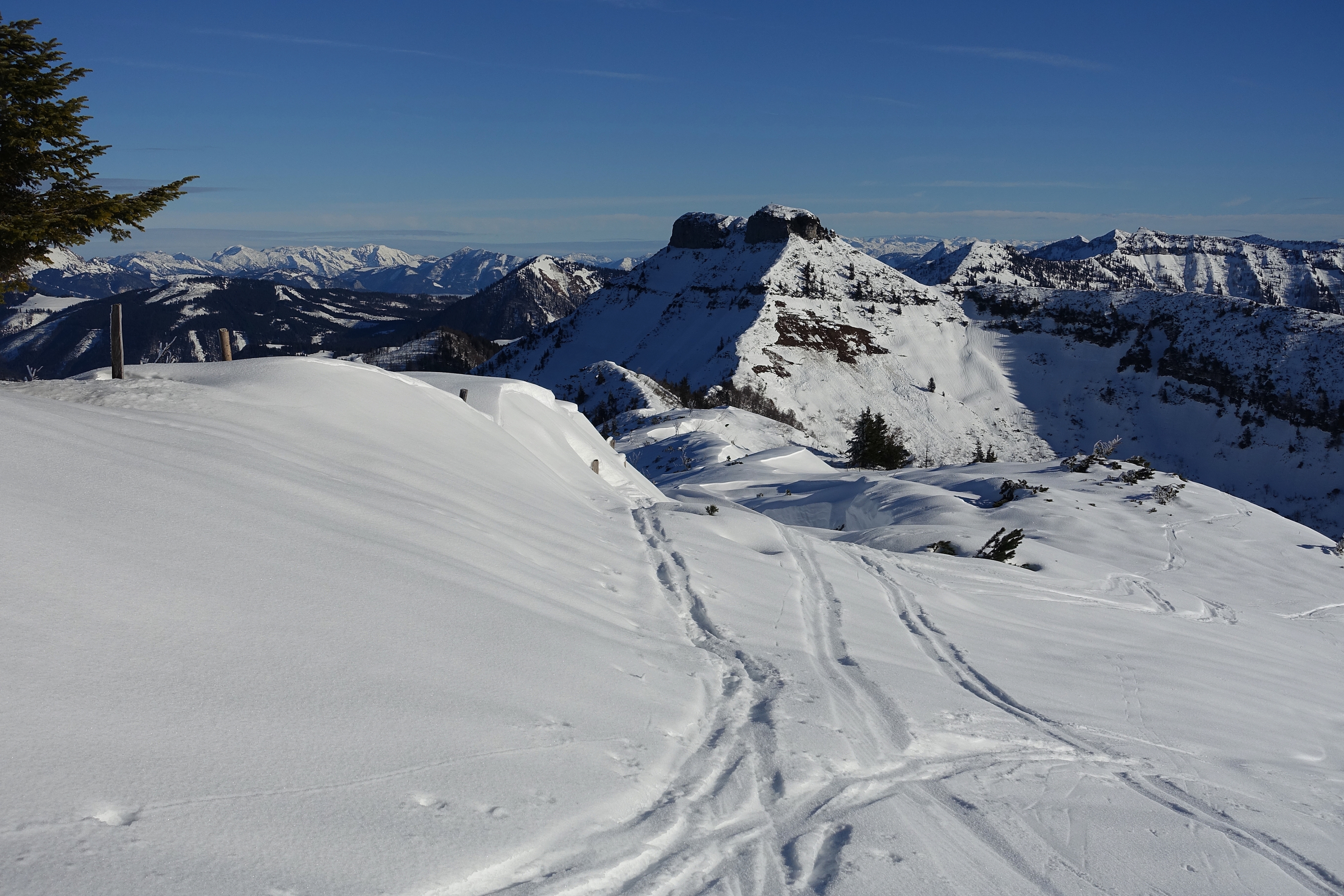 Von Rengerberg auf den Schlenken, um 10.30 Uhr nur 3 Autos am Parkplatz. Wetter zeigte sich bis ca. 13.30 Uhr von der besten Seite, strahlend blauer Himmel und sehr mild, auch am Gipfel fast windstill. Dann zog aber der Nebel aus dem Flachgau herein und es wurde schnell diesig. Schnee von allen etwas, mit etwas Fantasie kam schon etwas Firnfeeling für den gesamte Gipfelhang auf - vorausgesetzt man ist im Sinne der Abfahrt ganz am linken Gratrand geblieben. Der Forstweg im Schatten eher hart und in der Sonne schön weich, leider stören die vielen Fußspuren etwas.