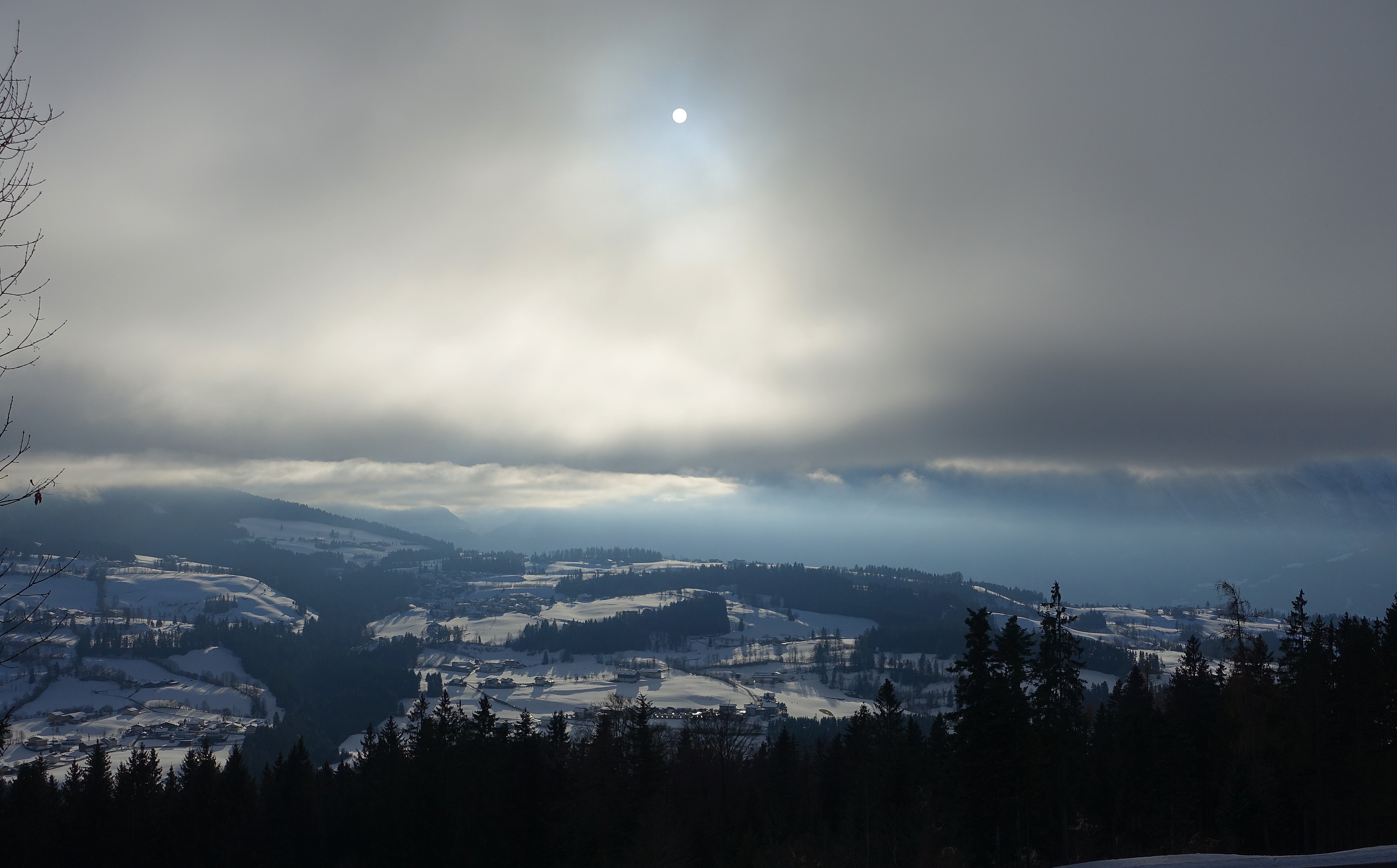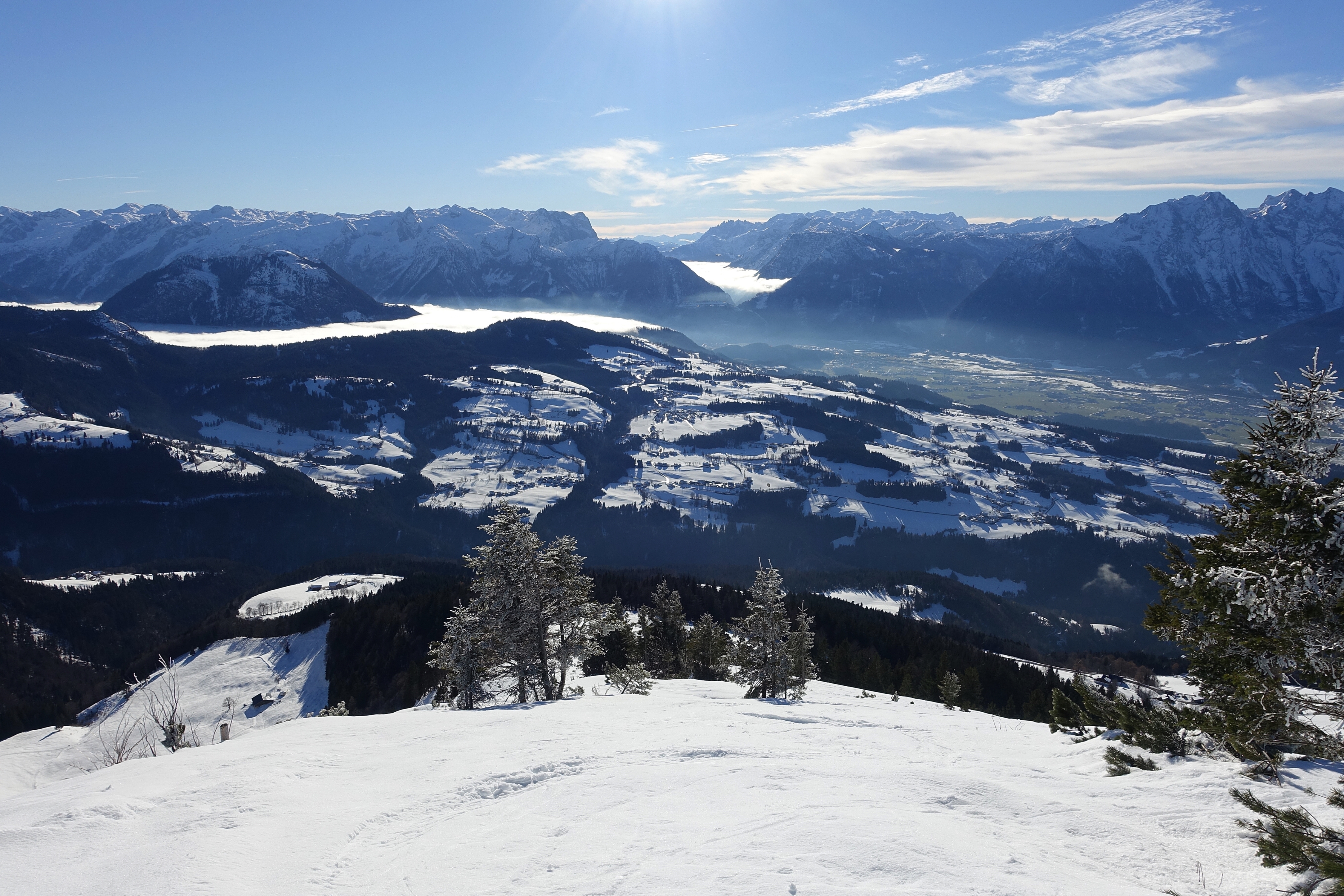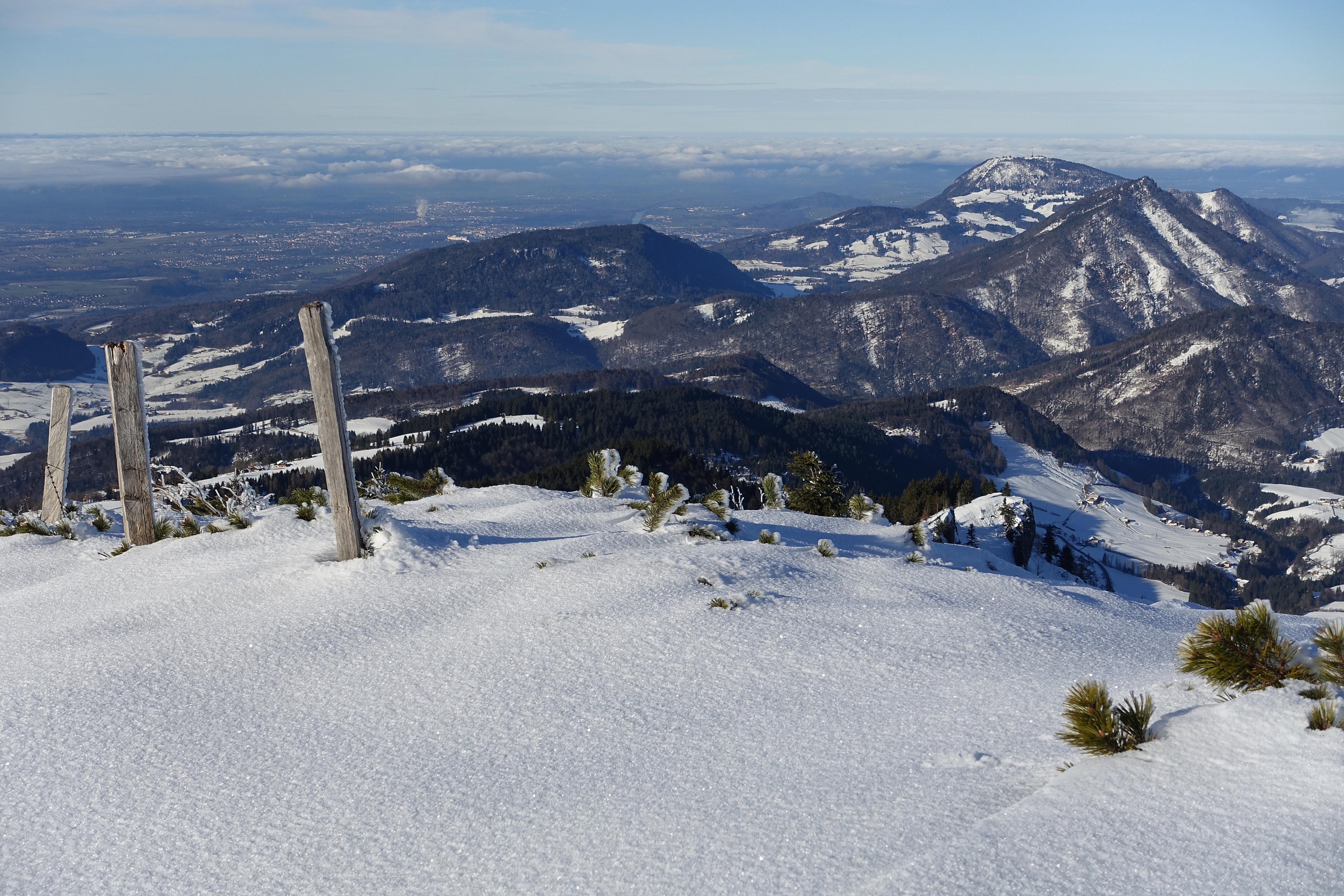 Von Rengerberg auf den Schlenken, um 10.30 Uhr nur 3 Autos am Parkplatz. Wetter zeigte sich bis ca. 13.30 Uhr von der besten Seite, strahlend blauer Himmel und sehr mild, auch am Gipfel fast windstill. Dann zog aber der Nebel aus dem Flachgau herein und es wurde schnell diesig. Schnee von allen etwas, mit etwas Fantasie kam schon etwas Firnfeeling für den gesamte Gipfelhang auf - vorausgesetzt man ist im Sinne der Abfahrt ganz am linken Gratrand geblieben. Der Forstweg im Schatten eher hart und in der Sonne schön weich, leider stören die vielen Fußspuren etwas.