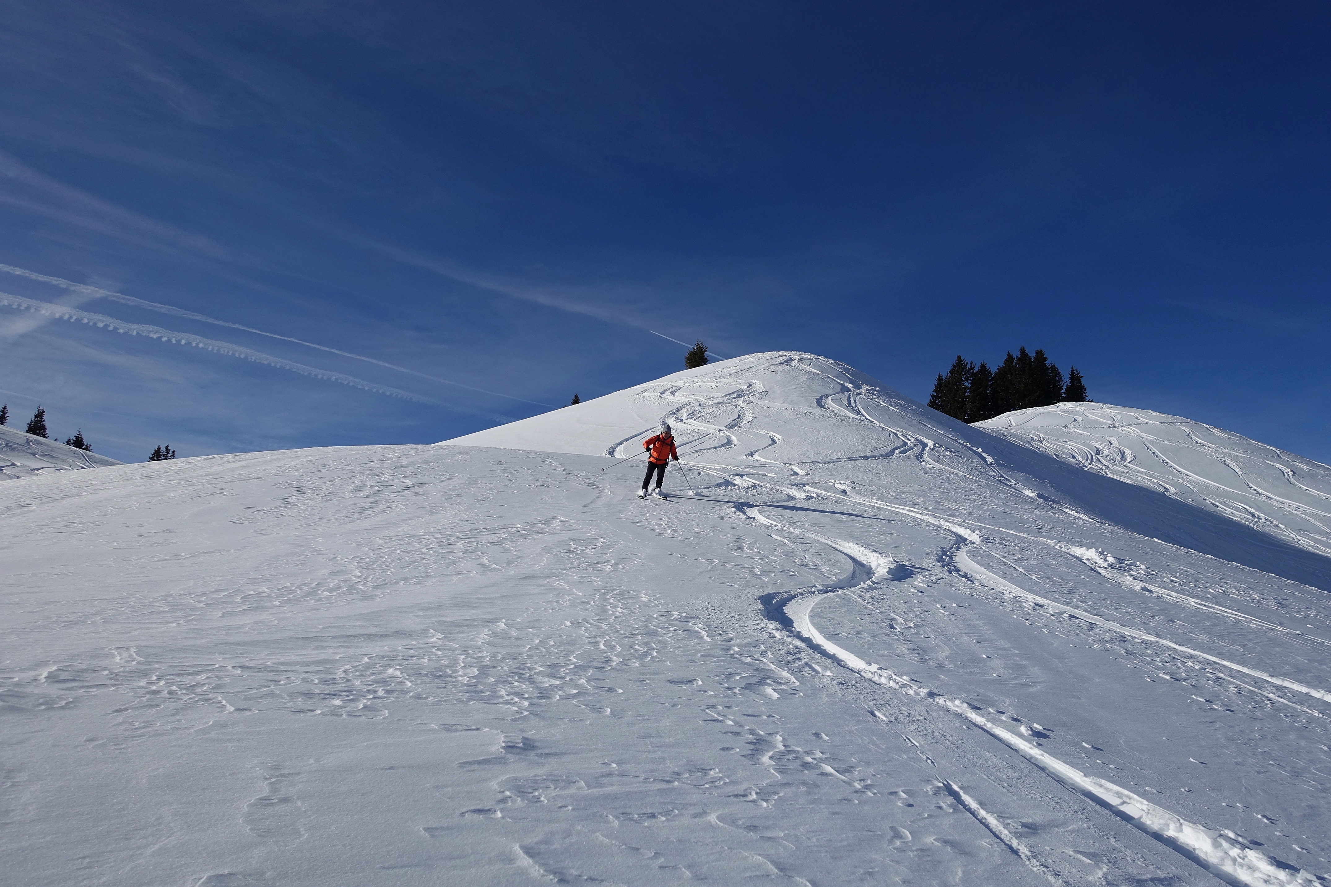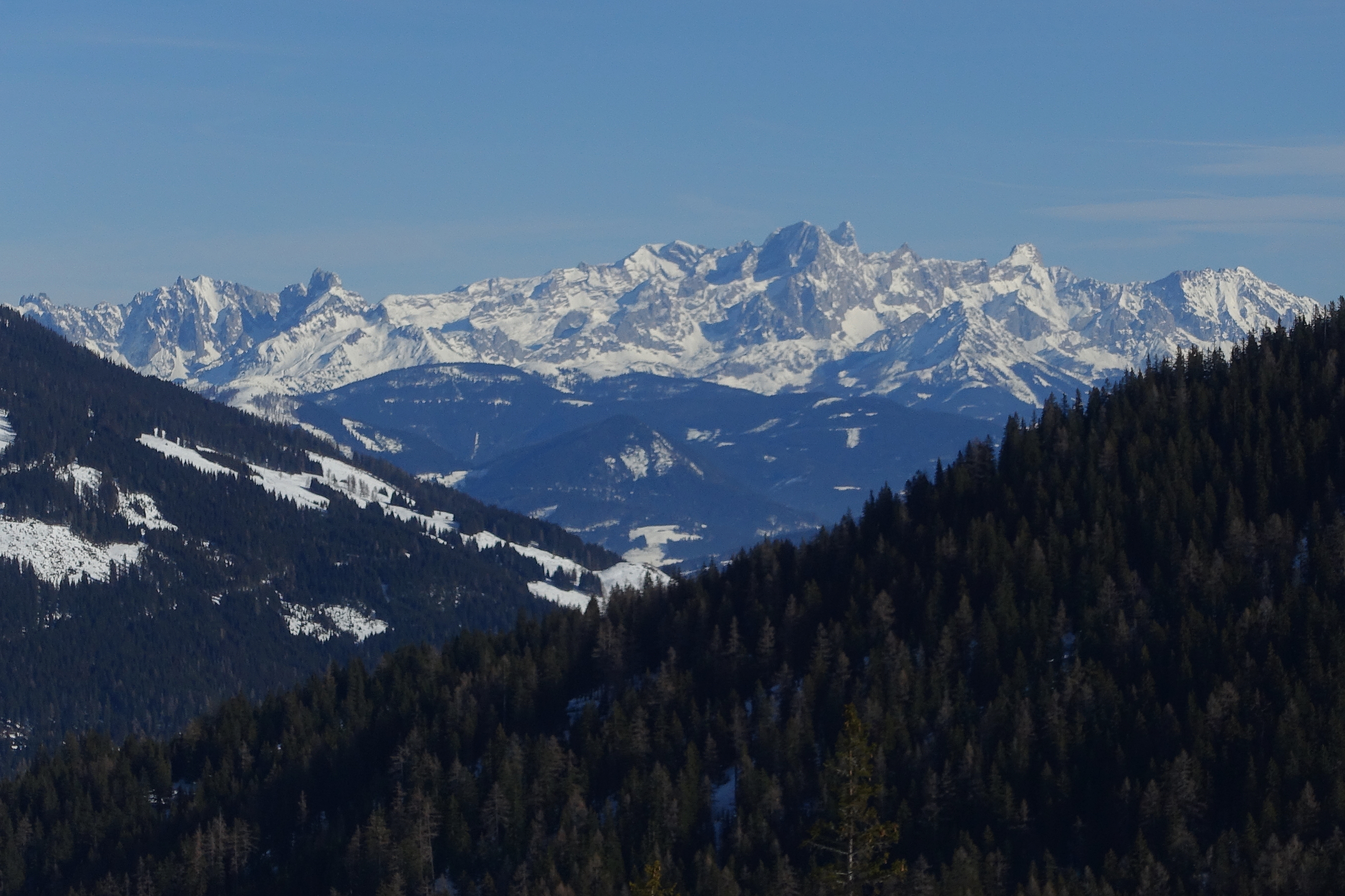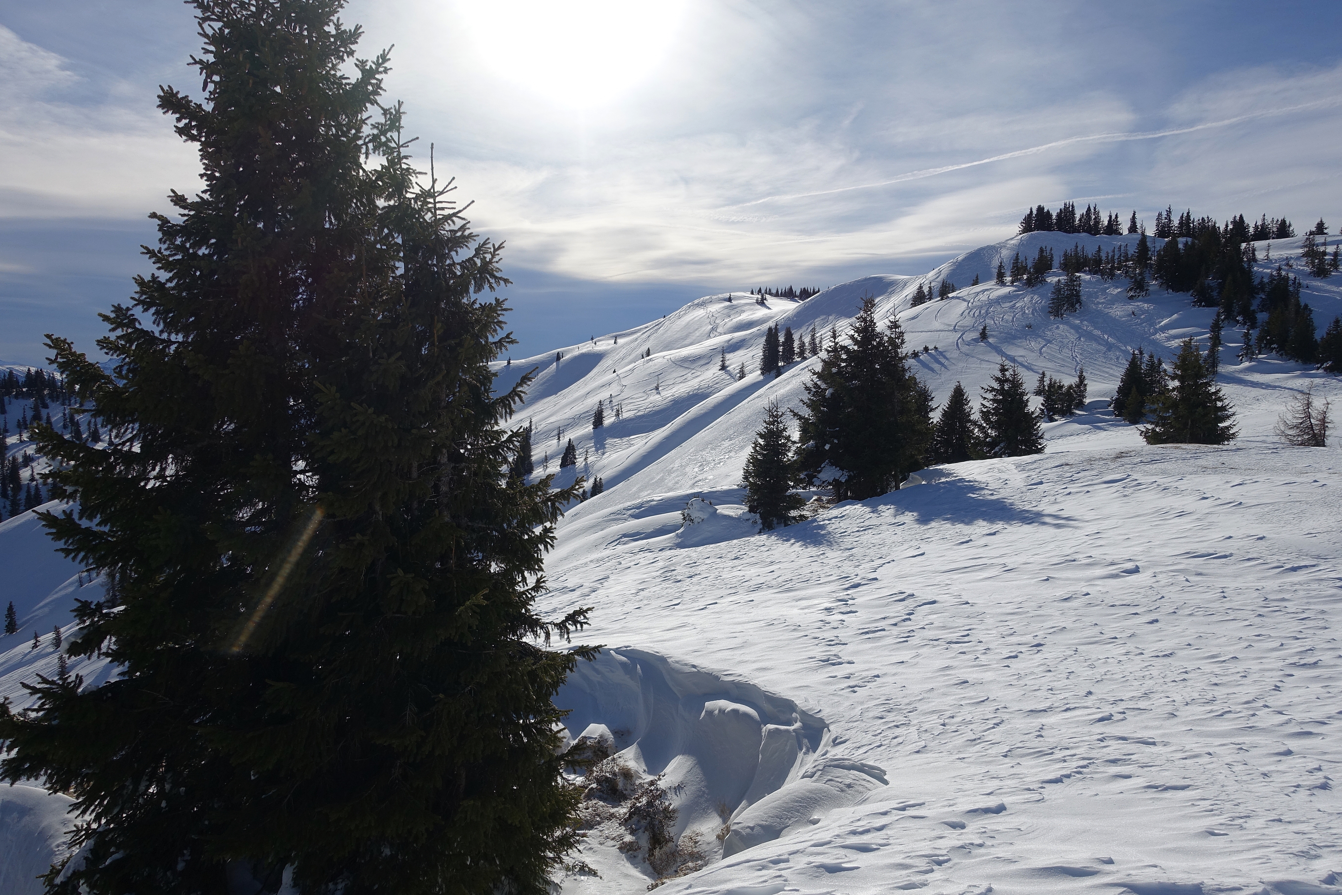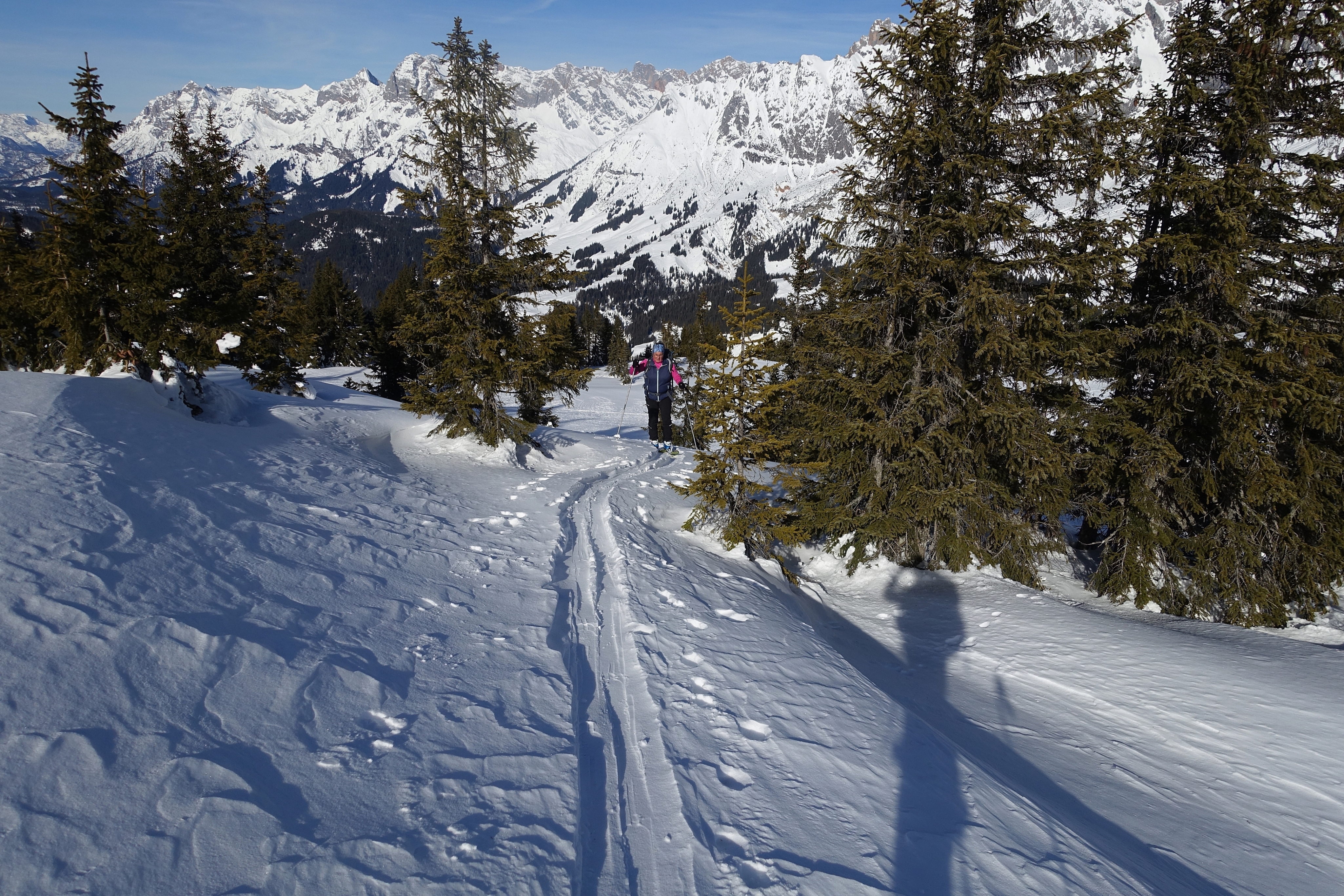 Heute wieder gute Bedinungen vorgefunden und zur Überraschung wenig los. Vom Dientner Sattel zum Kollmannsegg, Abfahrt über Klingelbergalm - schöner gesetzte Pulver von oben bis unten, und nicht extrem zerfahren, für den 4. Schönwettertag eigentlich verwunderlich. Gegen gestern ein wahres Vergnügen.