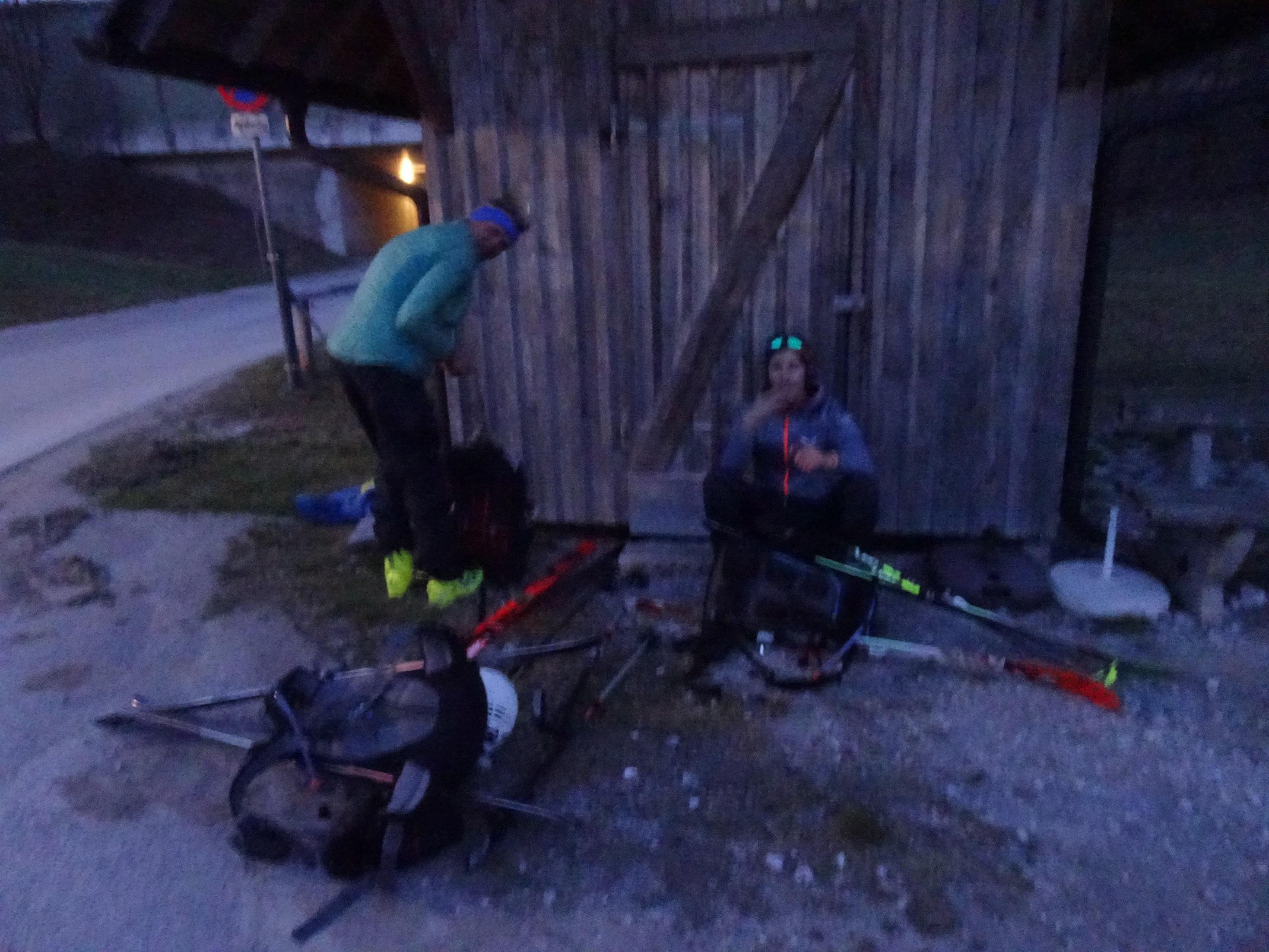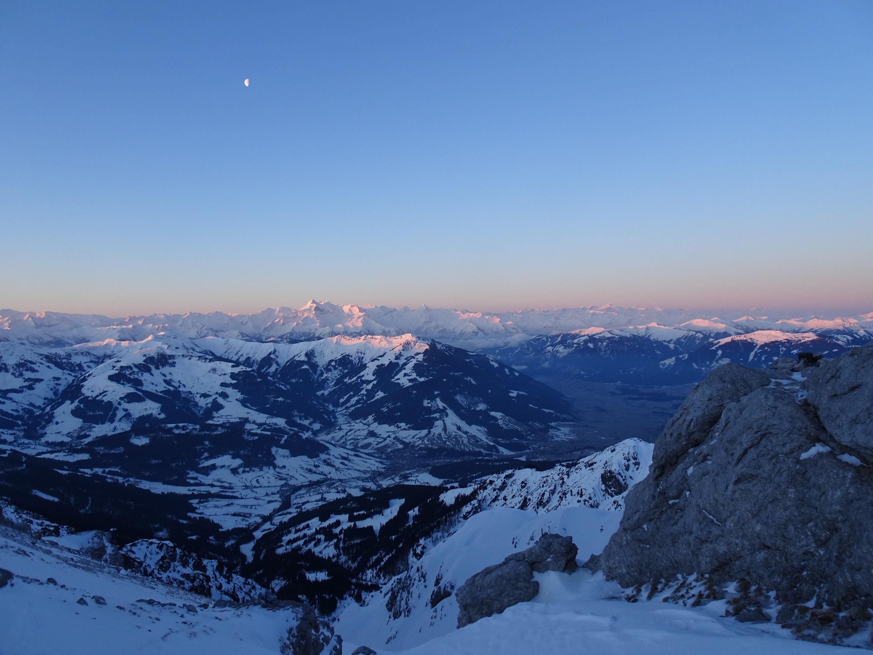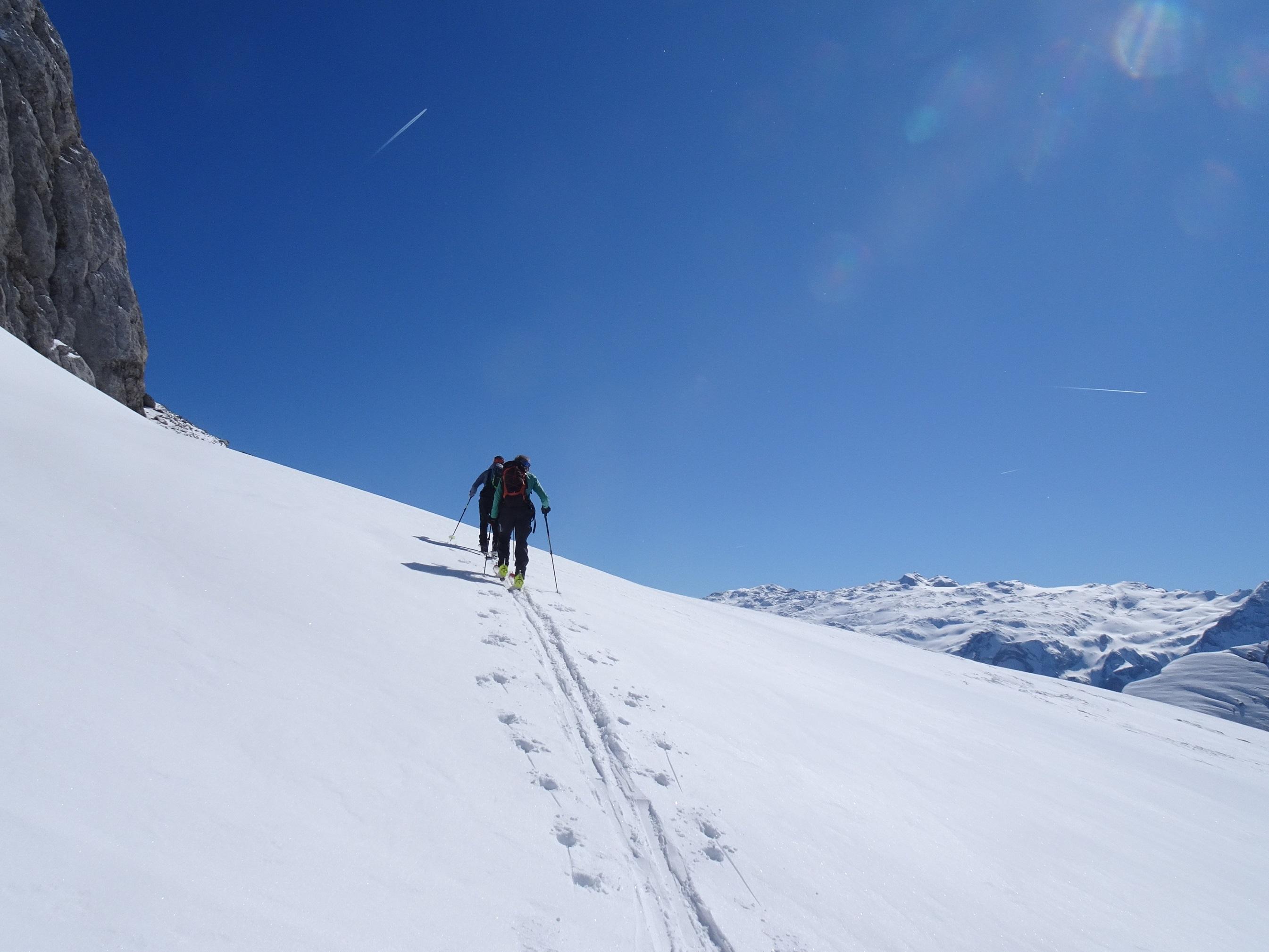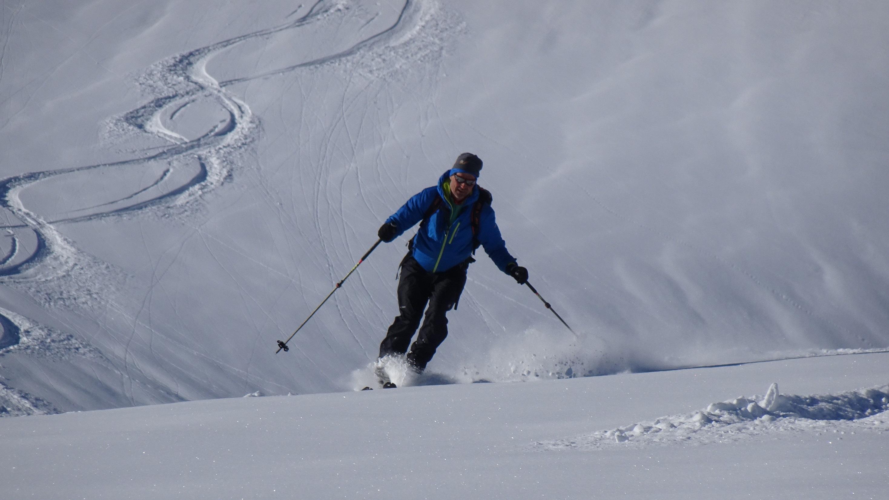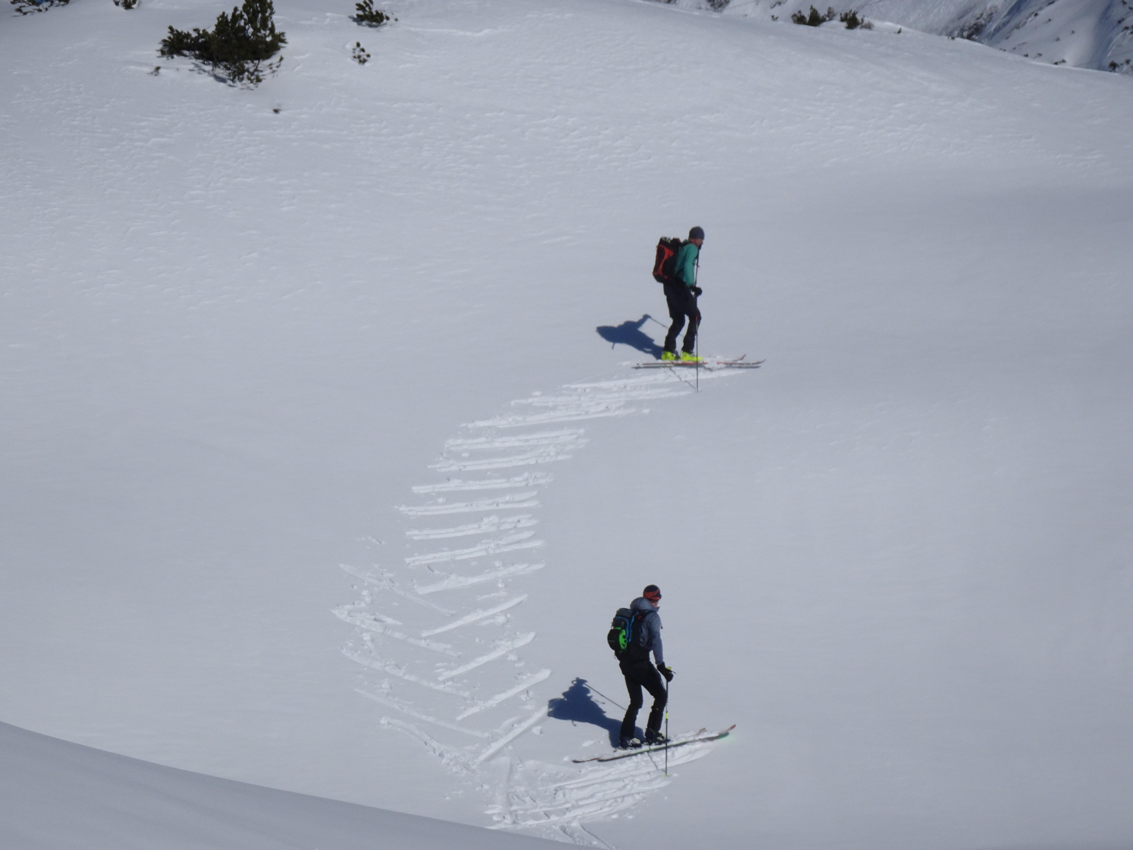 Es war ein idealer Tag für diese Tour: zwei Begleiter die das Ganze mitgingen, Mondschein für den Aufstieg, Lawinenwarnstufe 1, sehr kompakter Schnee mit einer dünnen Pulferschneeauflage. Wir hatten schönes Wetter und einen Wind der dafür sorgte, das uns auch am späten Nachmittag der Schnee nicht zu weich wurde und so gut vorankamen. Auch die Waldpassagen waren gut zu fahren.