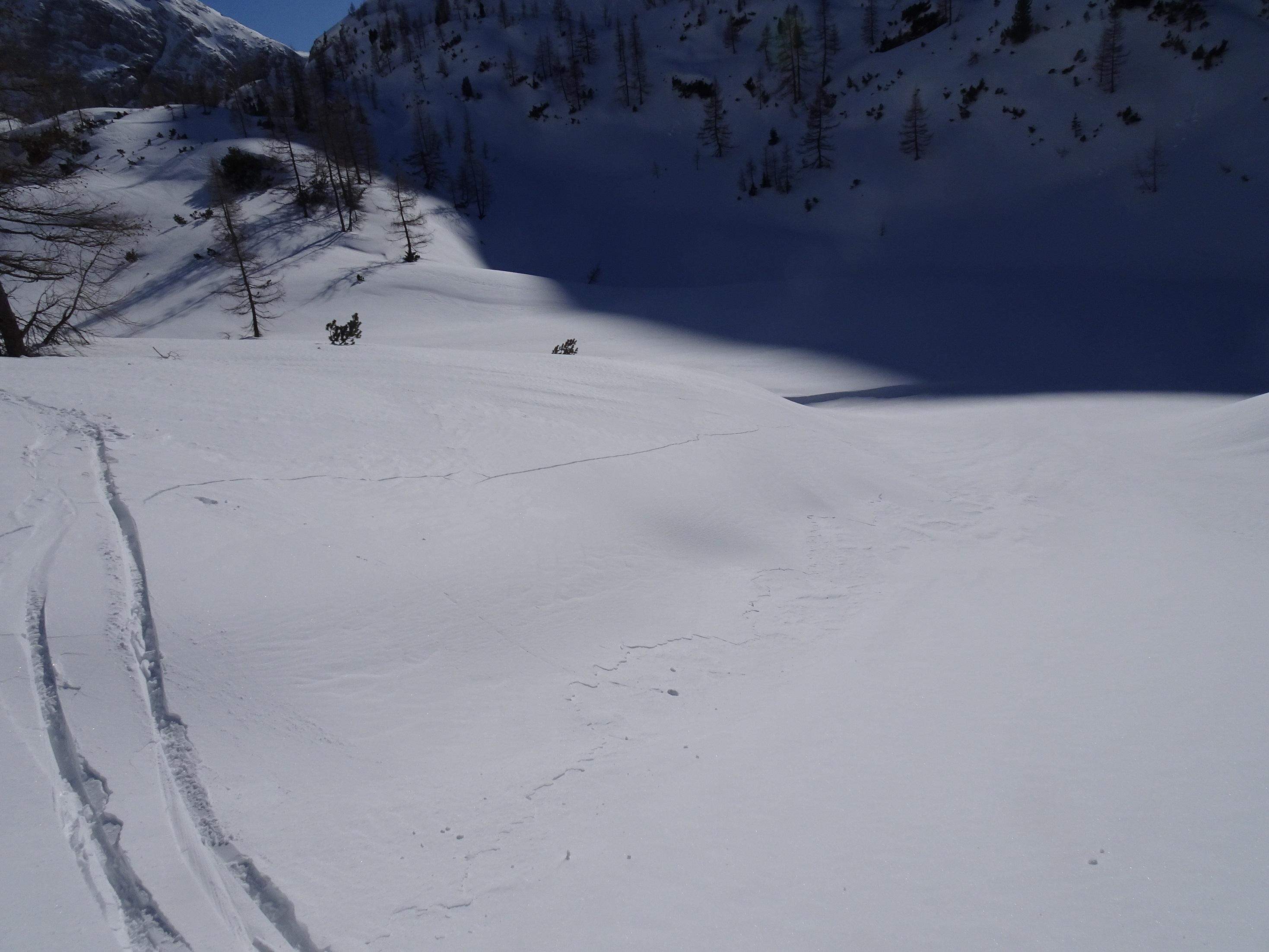 Vom Krallerwinkel stiegen wir über die Buchauerscharte aufs Steinerne Meer und erfreuten uns oben über das Aufgehen der Sonne. Die Scharte selber lag noch im Schatten des Selbhorns. Im oberen Teil waren Steigeisen notwendig. Von dort ging es mit mit einer langen und einigen kurzen Abfahrten, Gegenanstiegen (7 x auffellen), treteln, vielen Schiebestreken, Schitragen und Schrägfahrten Richtung Nordost bis zum Bluntauparkplatz. Die im LWB beschriebenen geringmächtigen Triebschneeschollen haben wir gesehen, vor allem jene, die sietlich in Rinnen geweht wurden waren sehr leicht zustören.