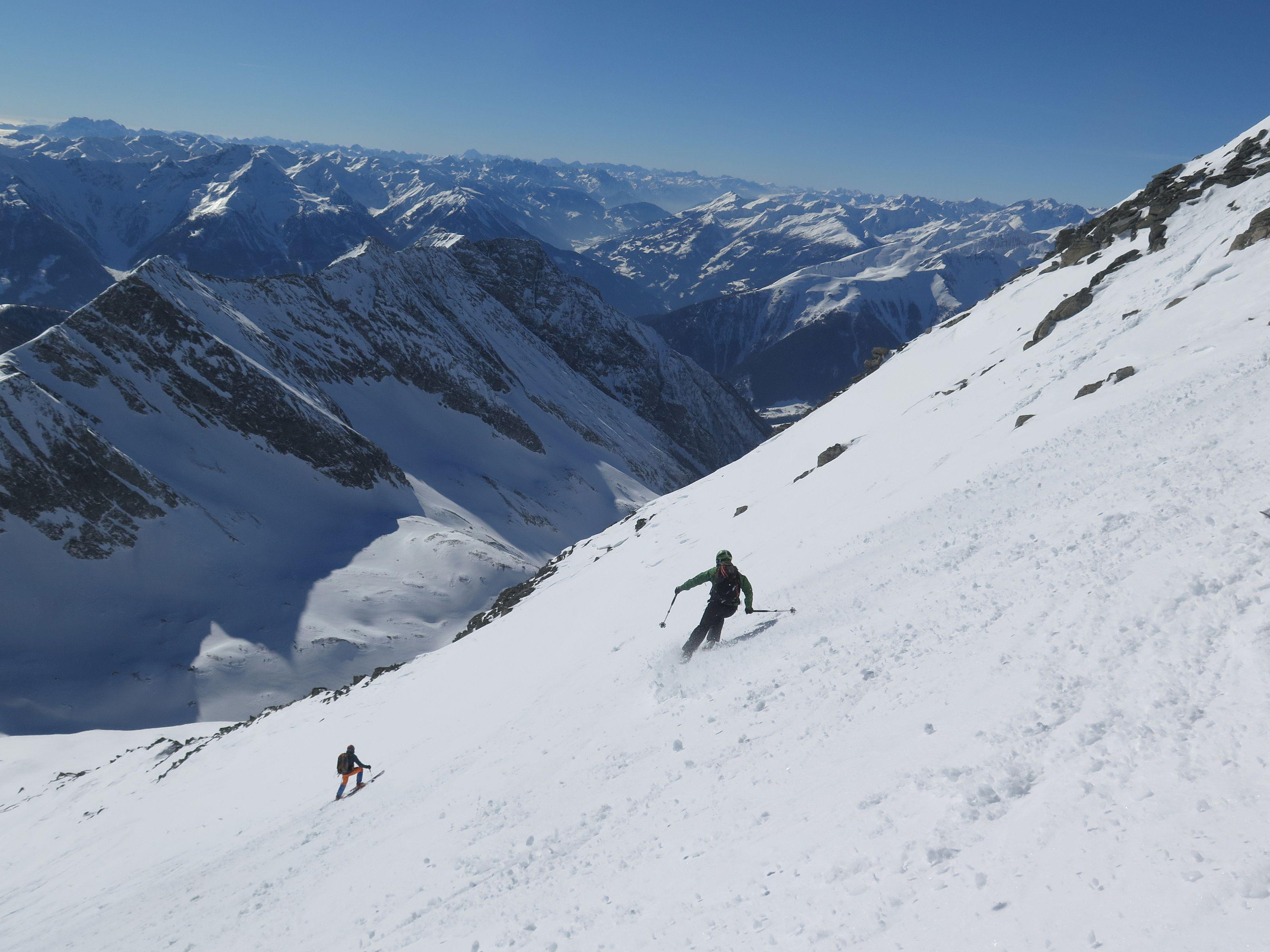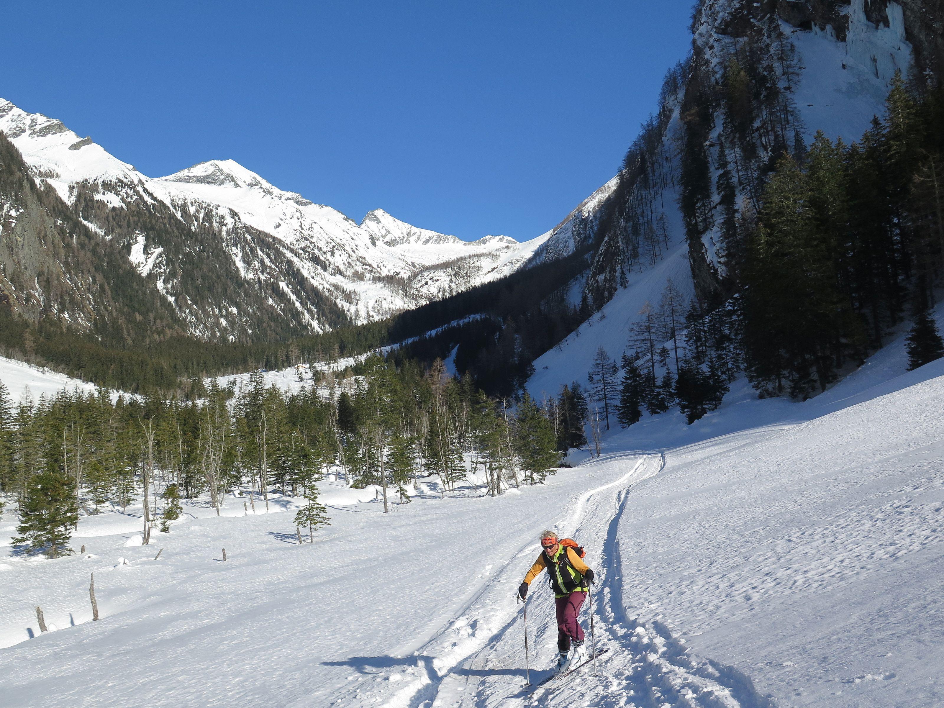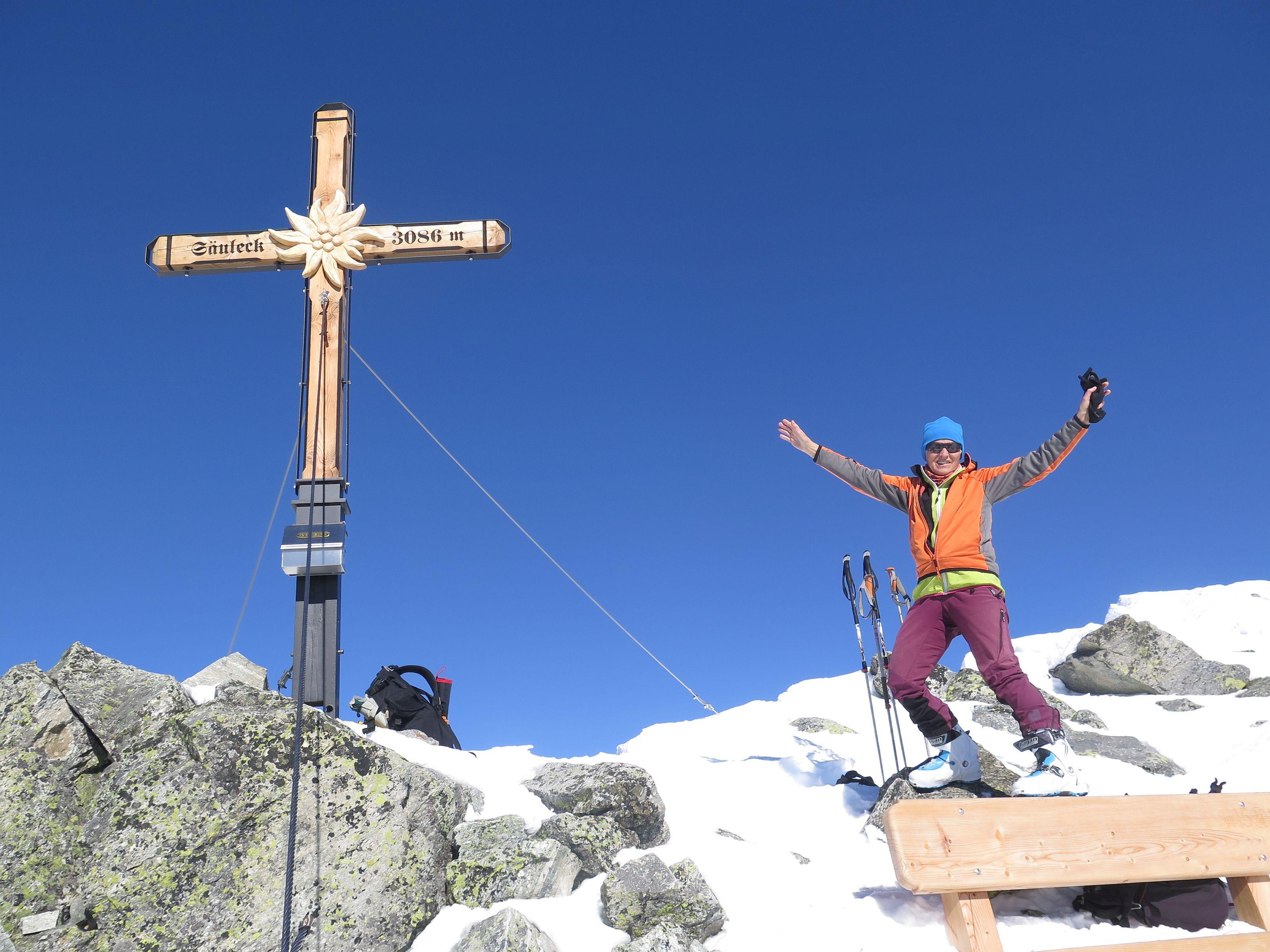 Das Säuleck ist eine einfache, landschaftlich großartige Skitour und gilt als leichter 3000, wobei leicht relativ ist : 1600 hm und 17 km Distanz stellen jedoch eine erhebliche Anforderung an die Kondition. Am Gipfel fantastische Fernsicht vom Glockner über die Dolomiten bis zu den Julischen. Wetter : Sonne pur, leichter Wind. Schnee : wechselhaft - Firn, Harsch, Windgepresst, im Waldbereich weich.