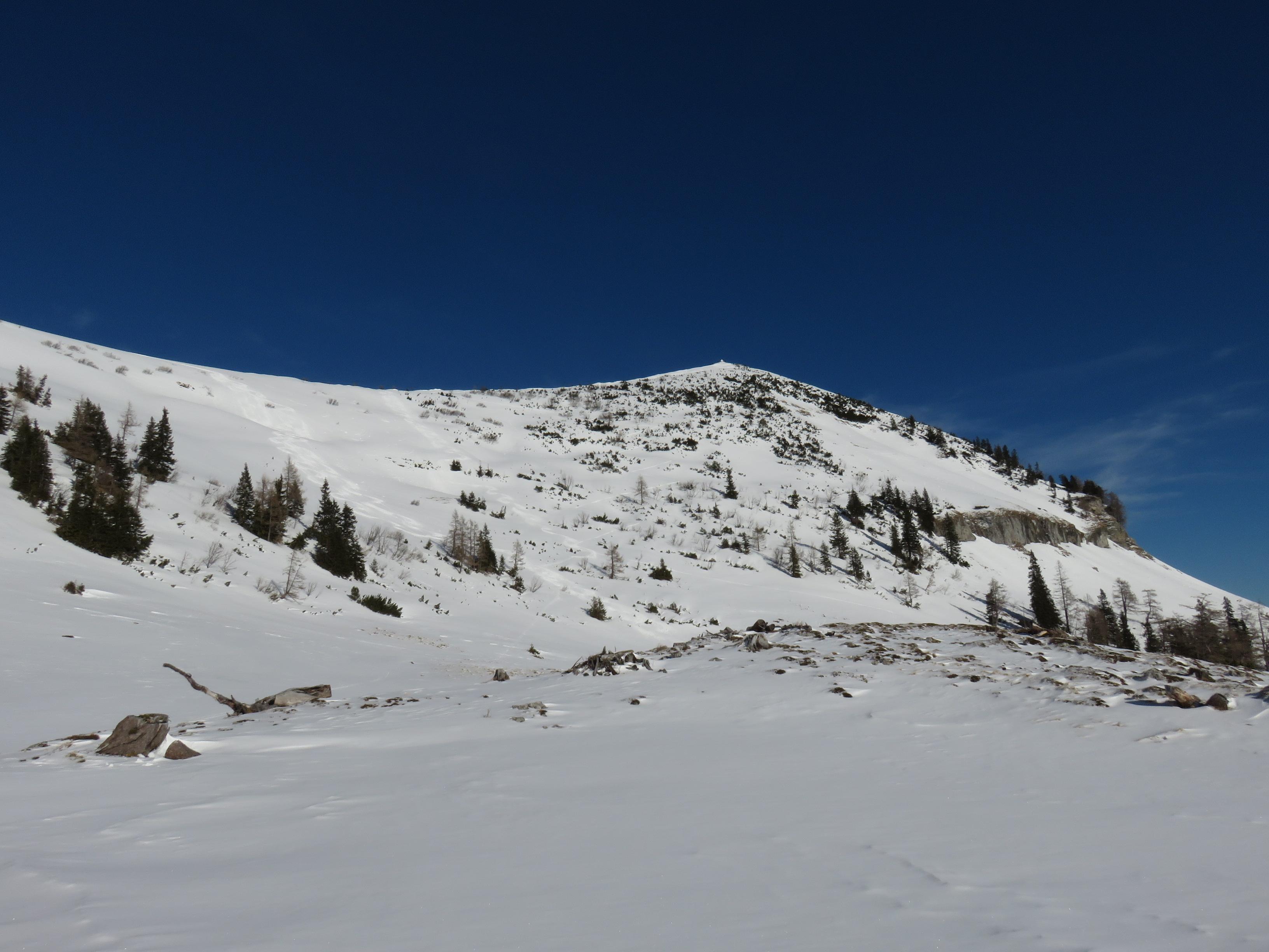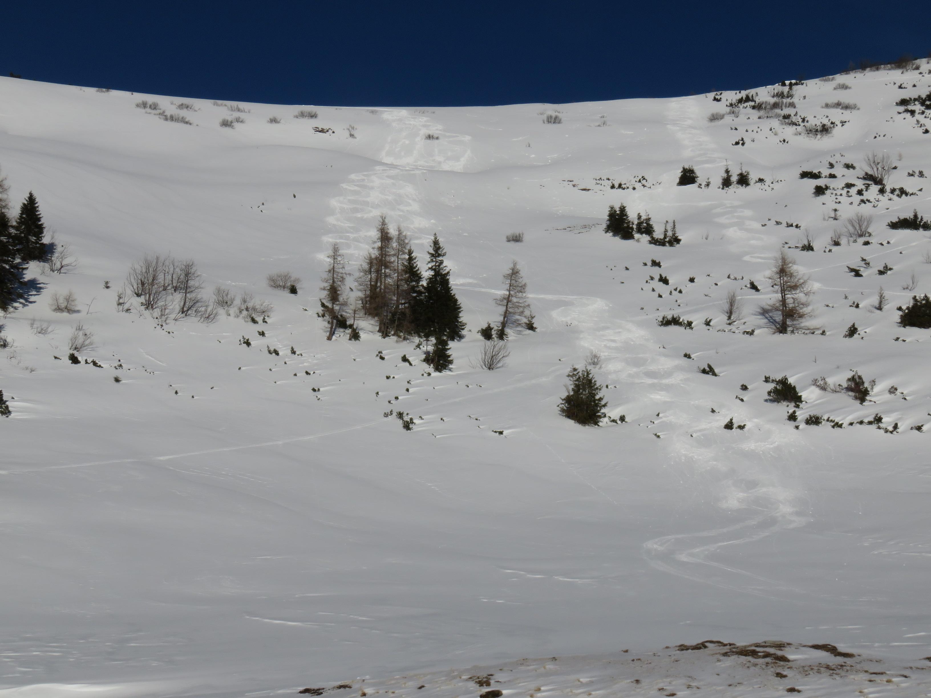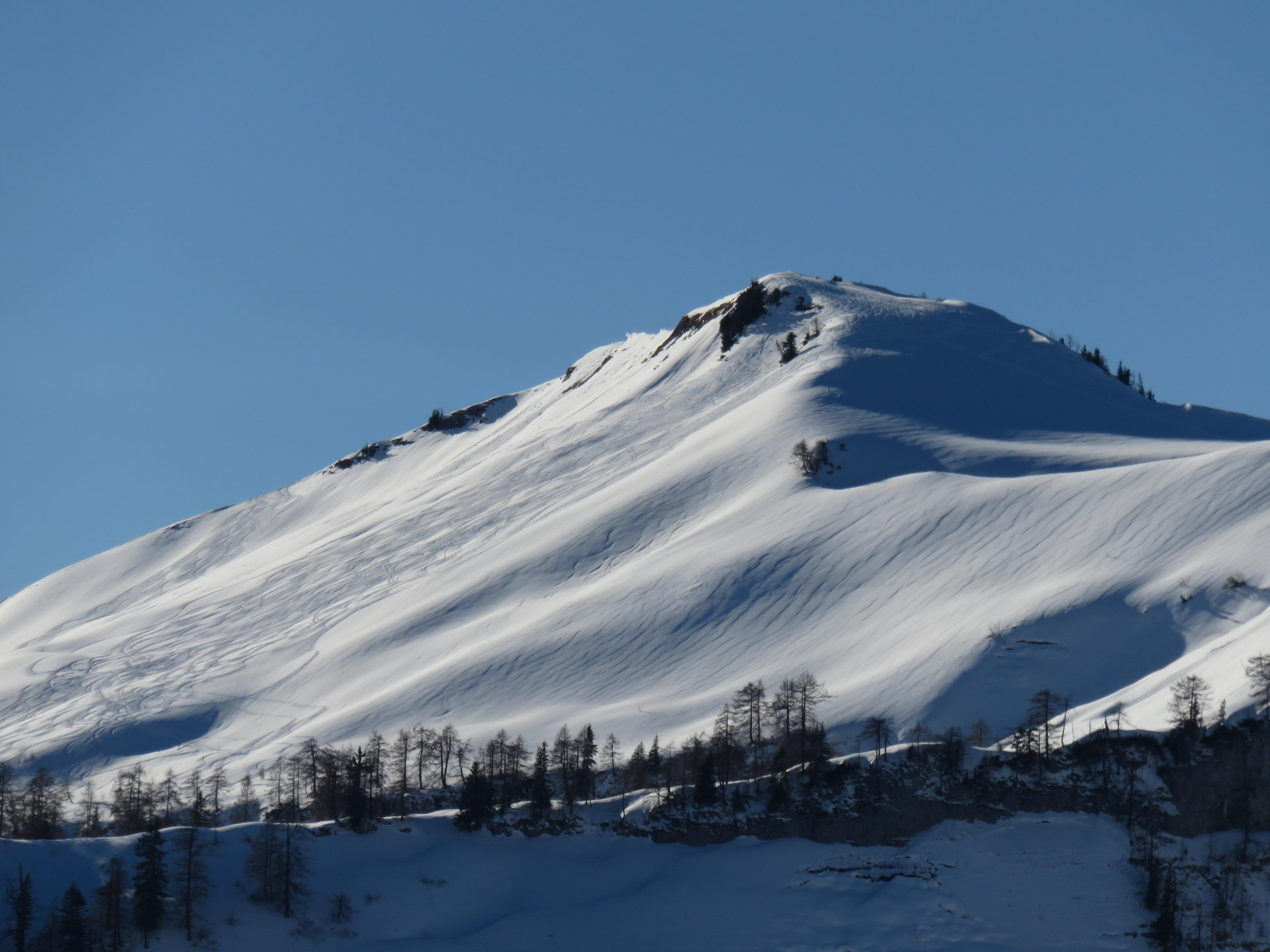 Ab 1000m geringe Neuschneeauflage im Gipfelbereich 2cm. Aufstieg zu den Genneralmen auf der Forststrasse im Wald war uns zu wenig Schnee.