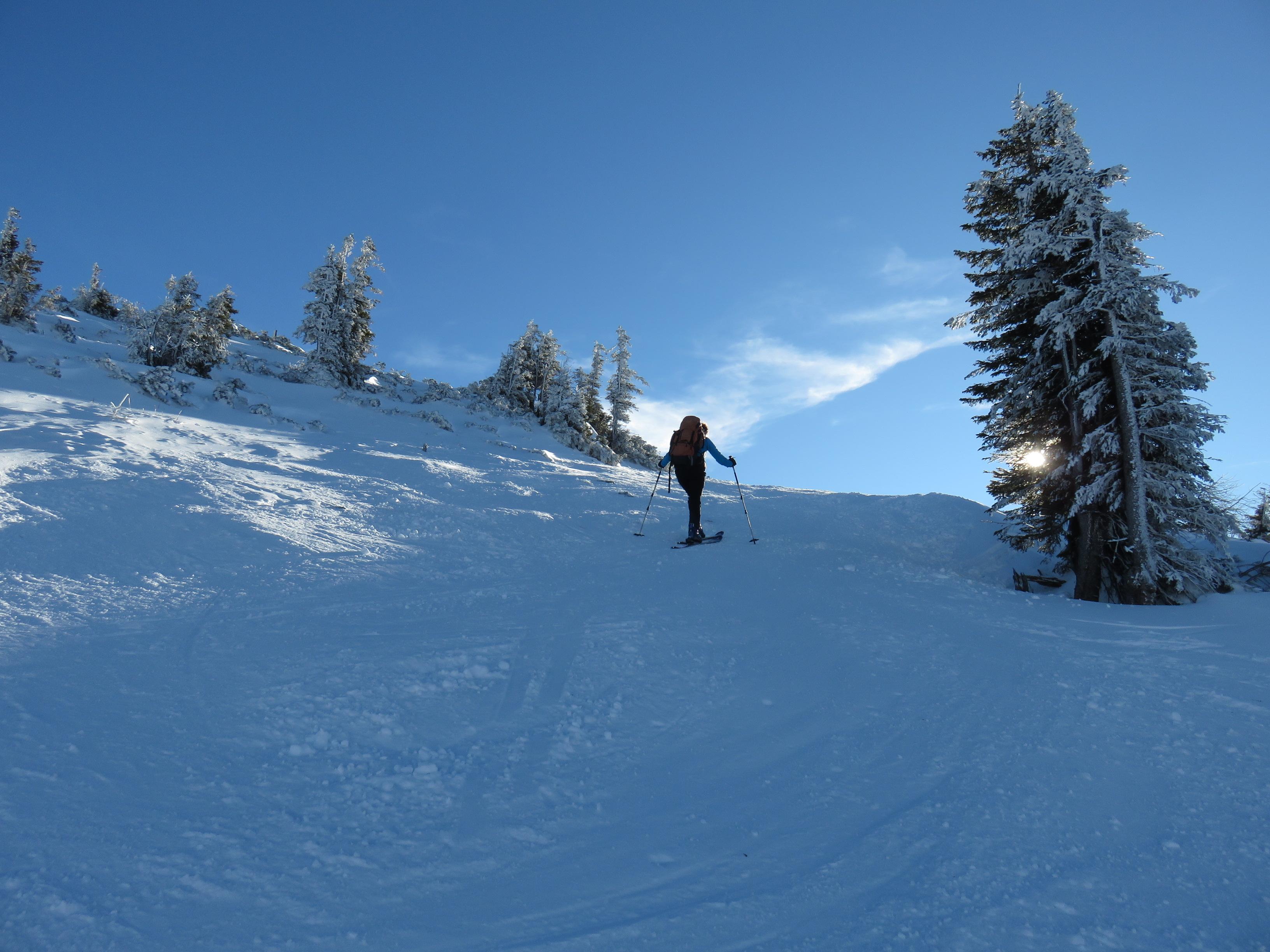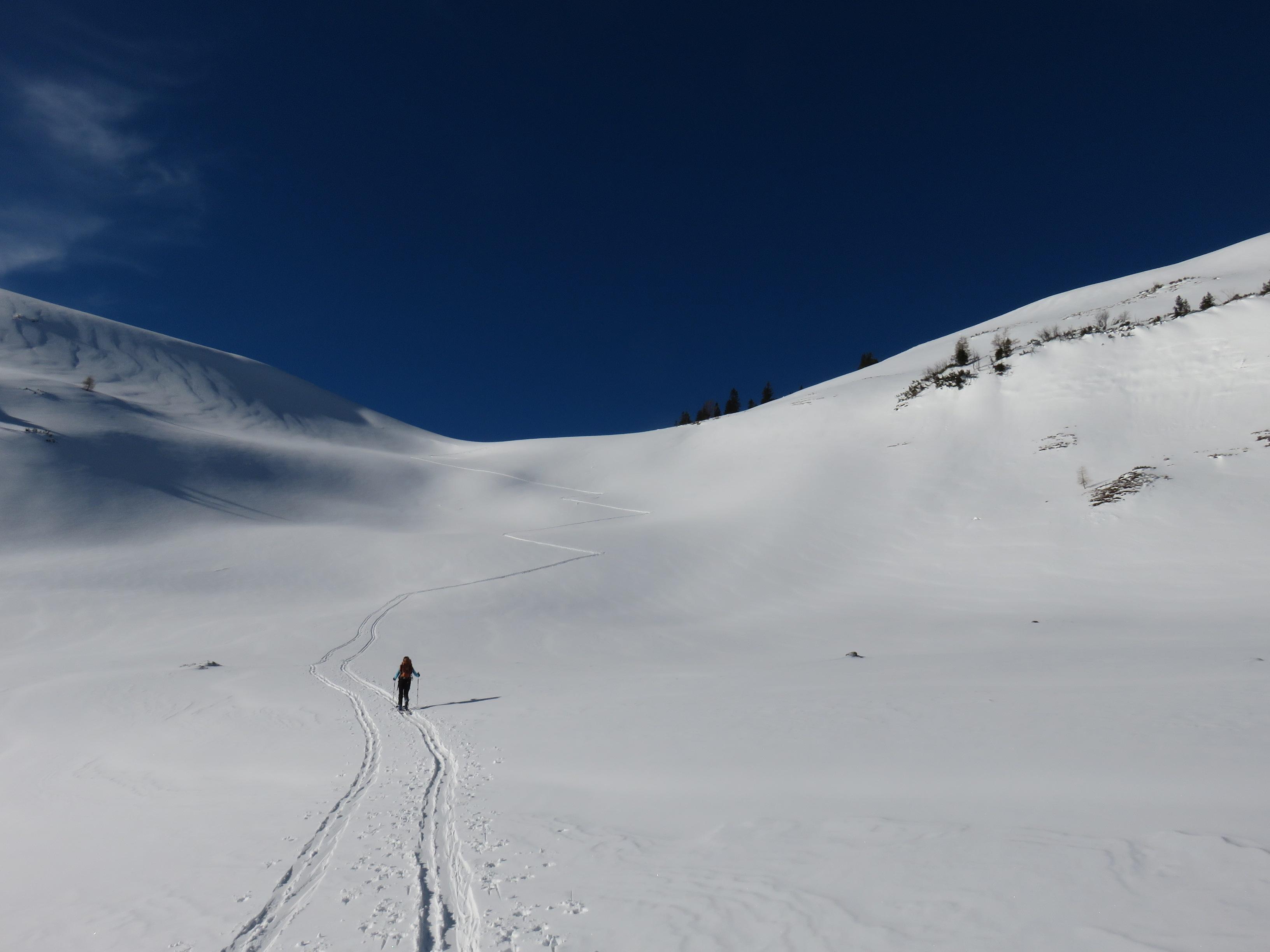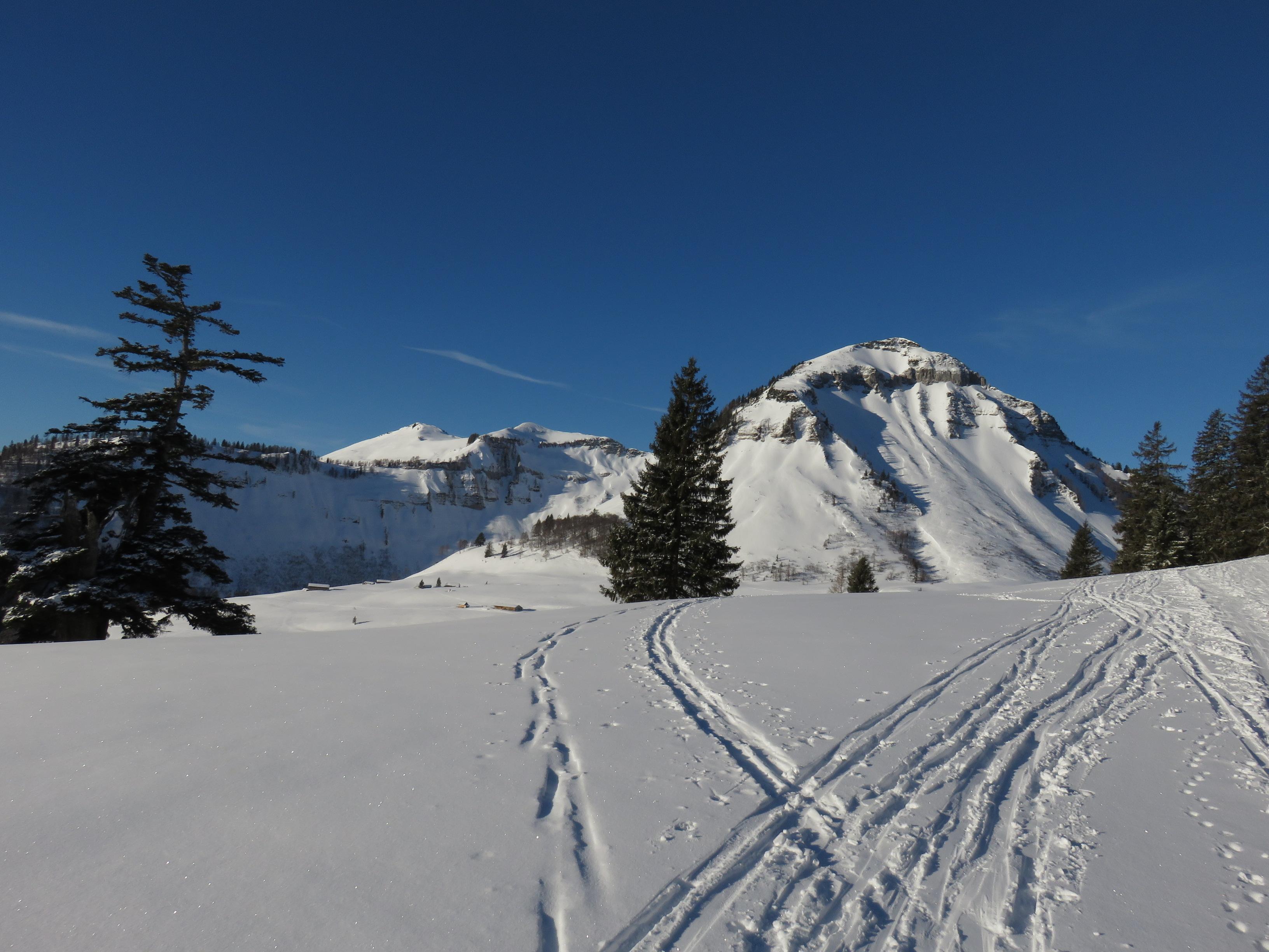 Ab 1000m geringe Neuschneeauflage im Gipfelbereich 2cm. Aufstieg zu den Genneralmen auf der Forststrasse im Wald war uns zu wenig Schnee.