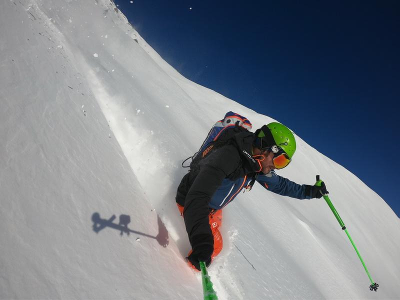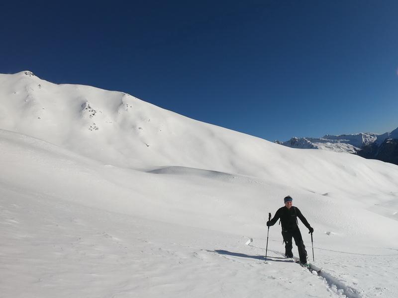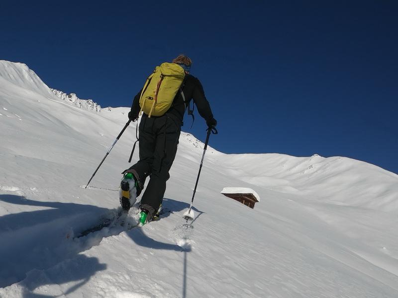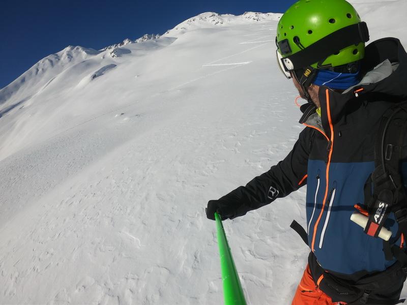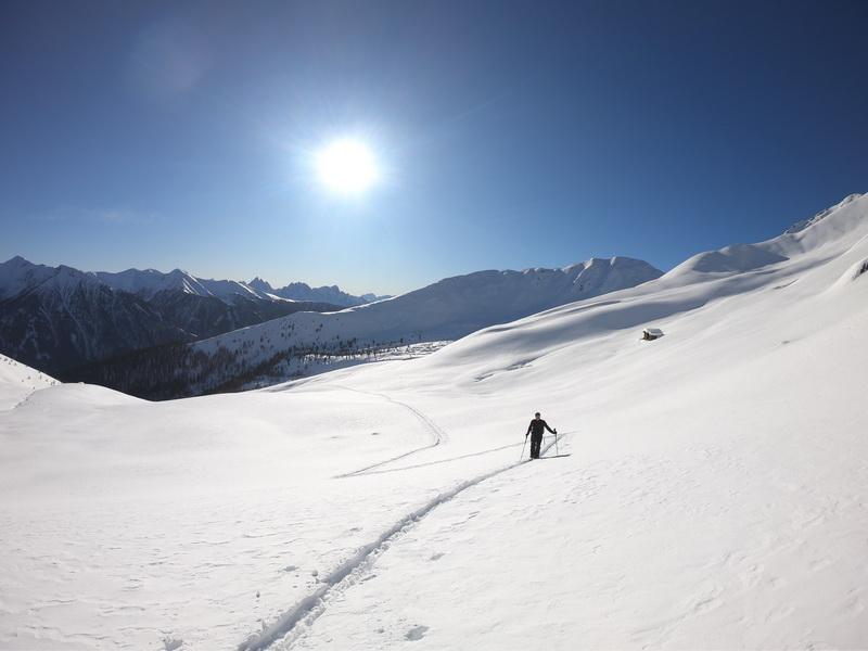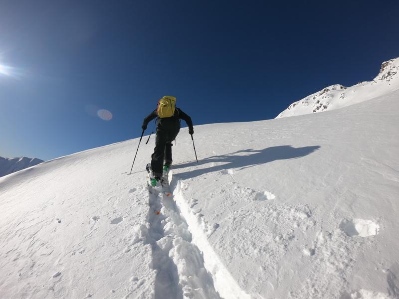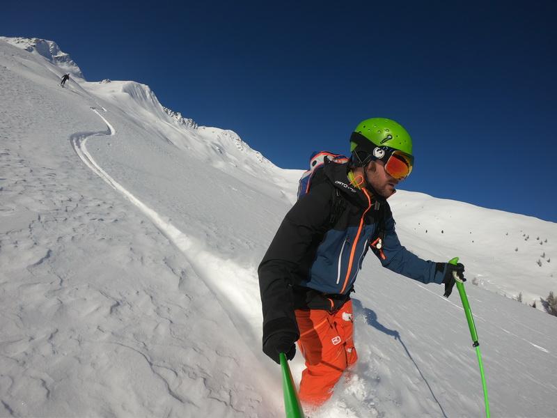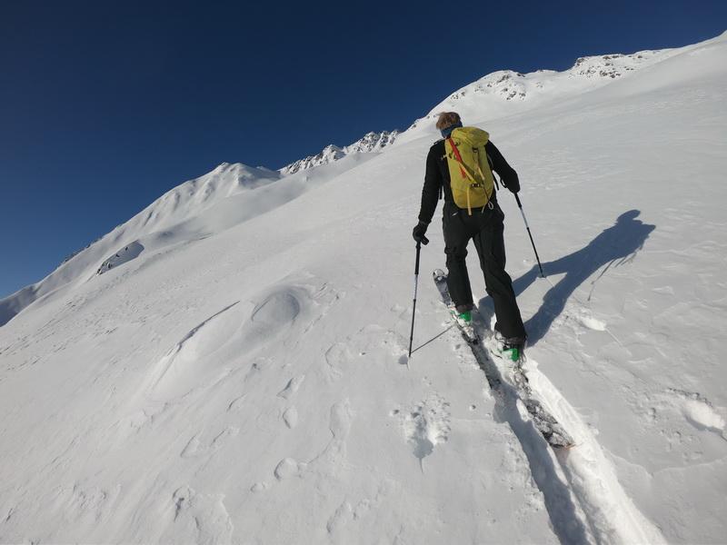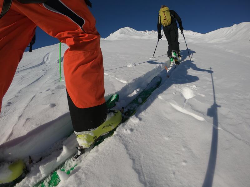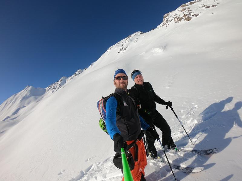Zu verlockend waren die unverspurten Hänge östlich von unserem geplanten Tourennziel,dem Hohen Mann. Zudem war auch augenscheinlich dass sich in den sanften Mulden noch perfekter Pulverschnee gehalten hat. Also haben wir kurz umdisponiert und den Hang bis kurz unter die Scharte aufgespurt. Wie vermutet waren die letzten Meter doch etwas steil und aus unserer Sicht auch gut mit Triebschnee gefüllt. Bis dahin gabs ein paar mal Setzungsgeräusche, allerdings war die Hangneigung dort eher Flach. Auf jeden Fall war unserer Entscheidung, zumindest aus unserer Sicht, goldrichtig und wir konnten eine Traumabfahrt in feinstem Powder genießen. Aber Bilder sagen ja bekanntlich mehr als 1000 Worte.