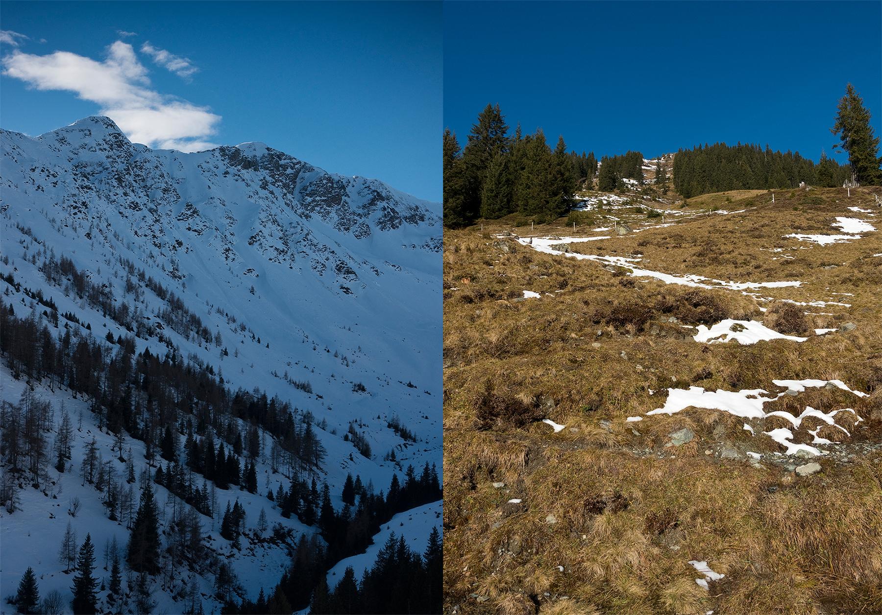 Im Schwarzachgraben sind Stemmerkogel und Medalkogel schon ziemlich aper in den unteren zwei Dritteln. Der Bärensteigkogel sieht noch machbar aus. Der Manlitzkogel hat den meisten Schnee und war vom Tal aus und zurück auf Schnee zu besteigen und abzufahren.