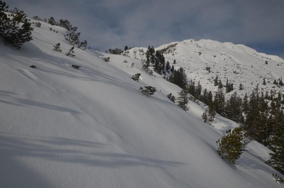 Beim aktuellen, letzten Schneefall dürfte kaum Schnee verfrachtet worden sein. Einzig die Ostflanke des Gressensteins machte zumindest aus der Entfernung für mich einen ziemlich eingeblasenen Eindruck was aber aus der Näher genauer betrachtet werden müßte um hier aussagekräftig zu sein. Lawinenzeichen konnte ich sonst keine erkennen.