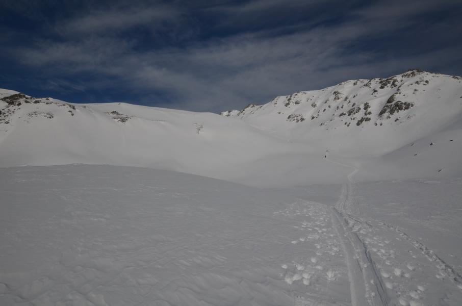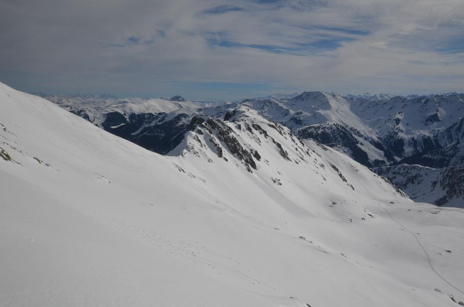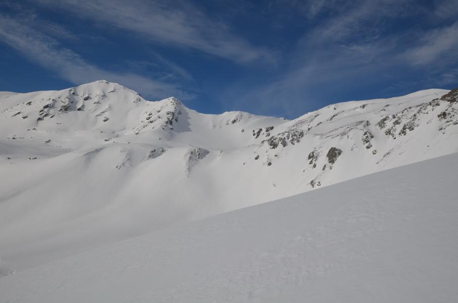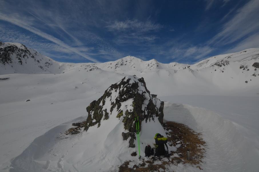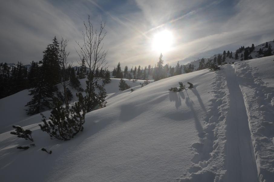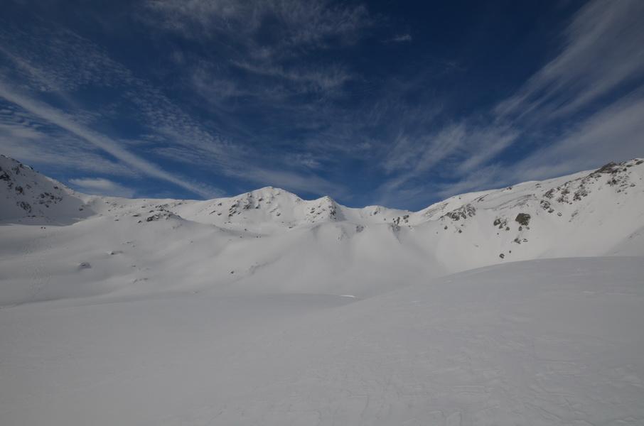 Alles in allem eine wirklich lässige Tour, welche durch die nordseitige Abfahrt extrem aufgewertet wird. Der Windkolk und einige große Wächten in der Gegend zeigen zwar deutlich den Windeinfluss, allerdings muss dieser schon etwas länger zurückliegen.
