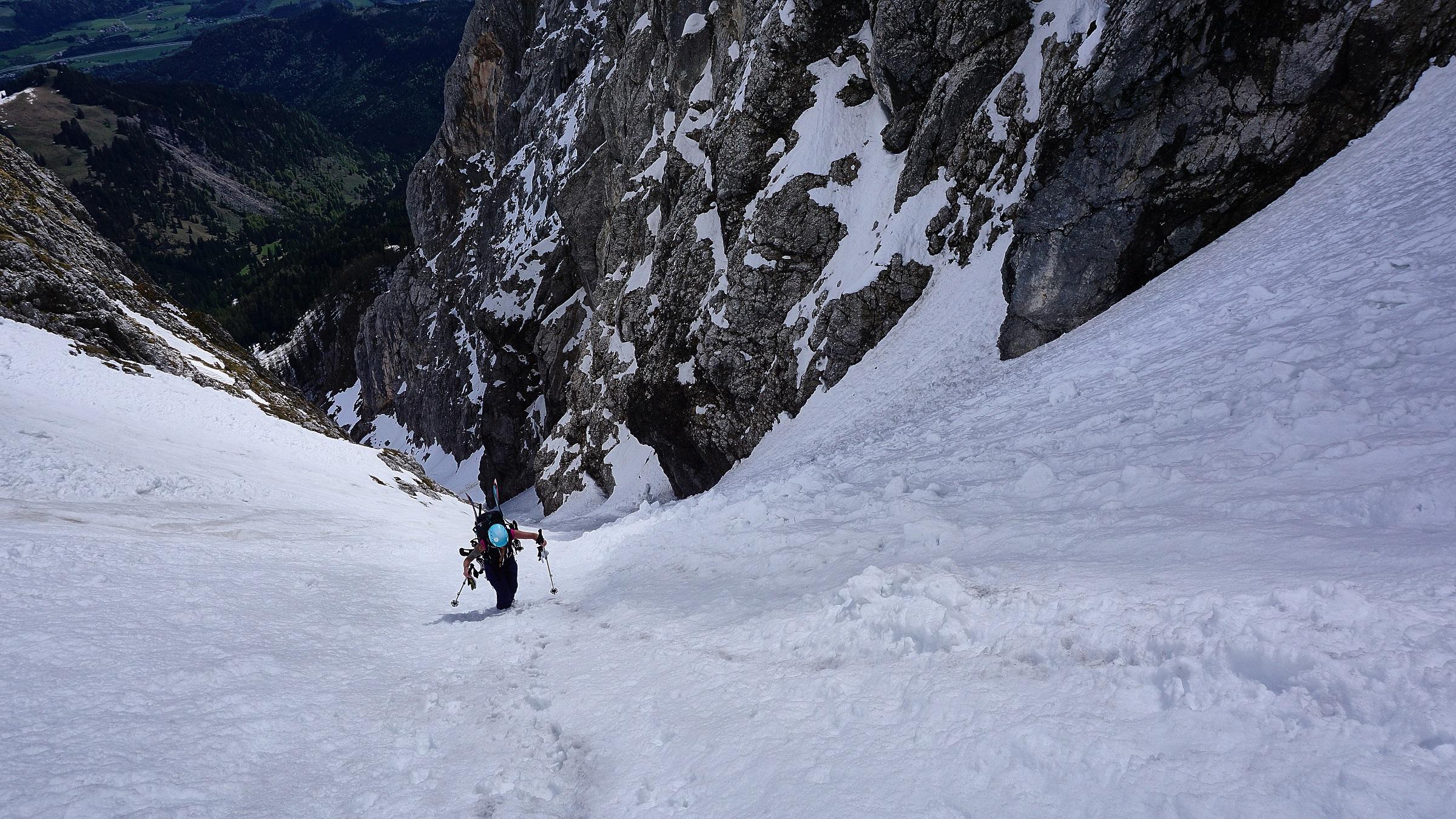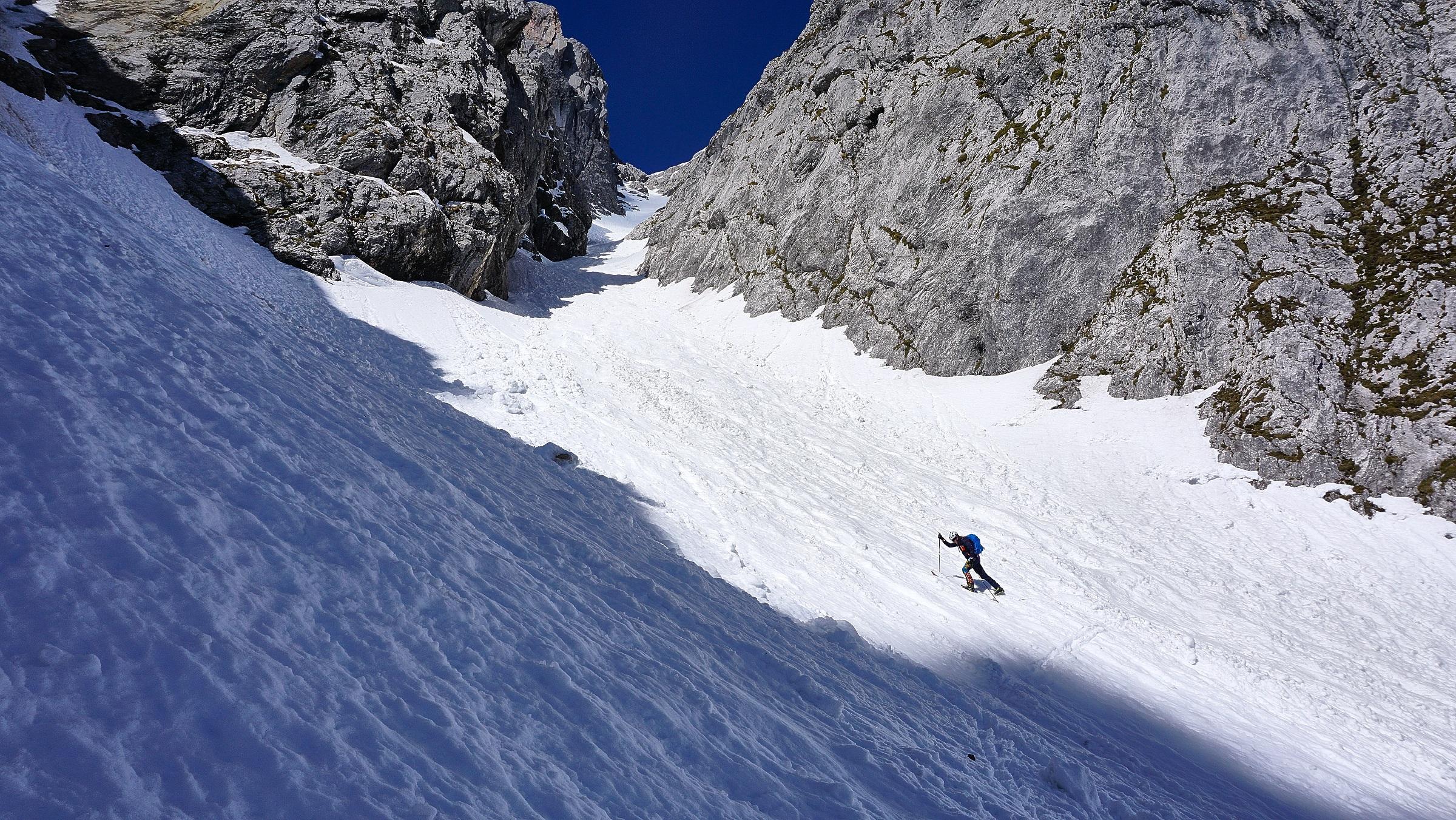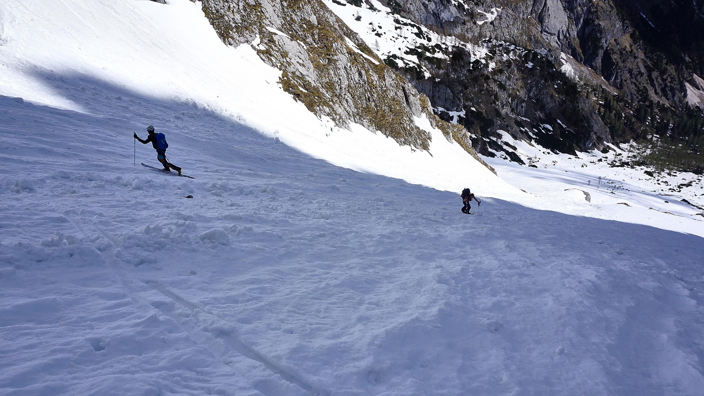 Schnee: trotz klarer und windstiller Nacht hat's nicht mehr durchgefroren, es strahlt bei den Temperaturen nicht mehr ab. Schneeklamm war nach den Neuschneefällen in der Mitte der Rinne bereits entladen und ohne Spuren einer Begehung/Befahrung. Ca. 50 Meter vorm Felsausstieg stoppten wir bei einem Riss in der Schneedecke. Abfahrt in der Rinne sehr tiefer Schnee, viel Slush, der Hang ins Höllkar runter dafür umso gschmeidiger und schmieriger :)