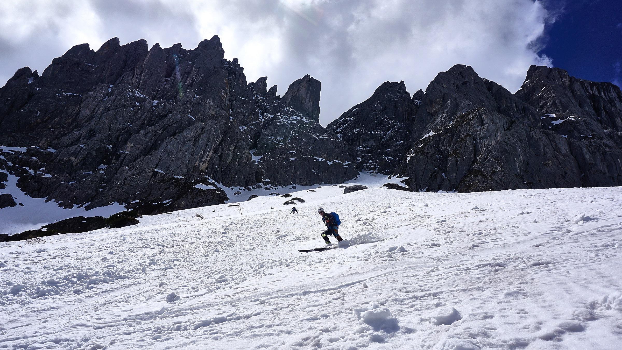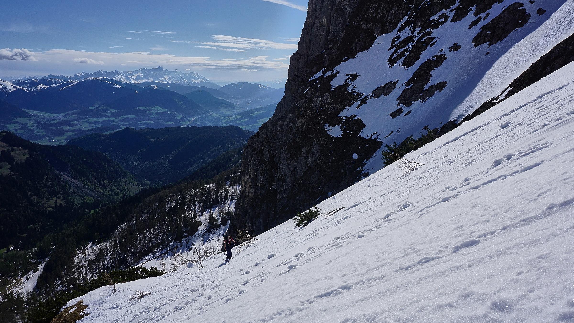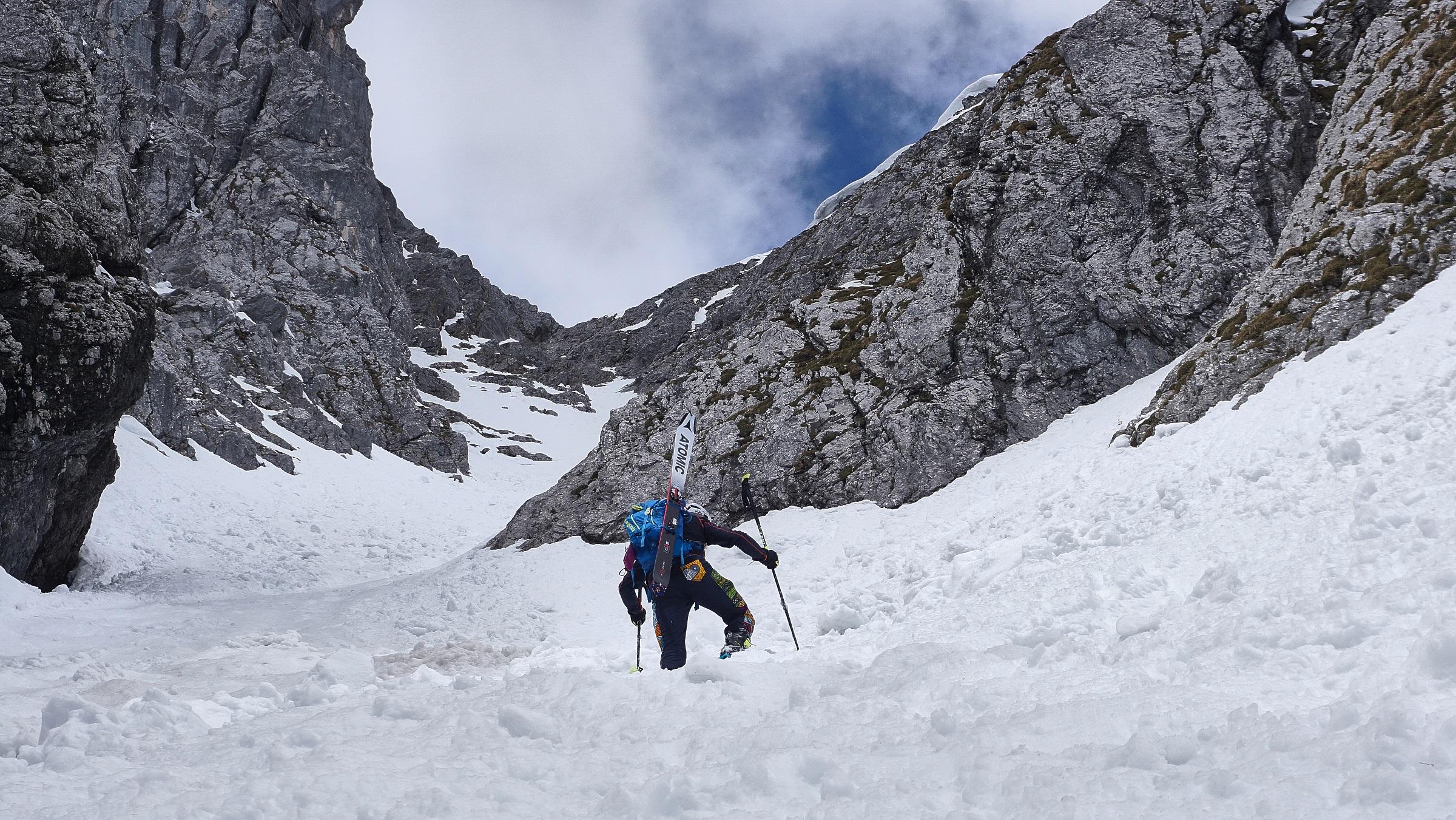 Schnee: trotz klarer und windstiller Nacht hat's nicht mehr durchgefroren, es strahlt bei den Temperaturen nicht mehr ab. Schneeklamm war nach den Neuschneefällen in der Mitte der Rinne bereits entladen und ohne Spuren einer Begehung/Befahrung. Ca. 50 Meter vorm Felsausstieg stoppten wir bei einem Riss in der Schneedecke. Abfahrt in der Rinne sehr tiefer Schnee, viel Slush, der Hang ins Höllkar runter dafür umso gschmeidiger und schmieriger :)