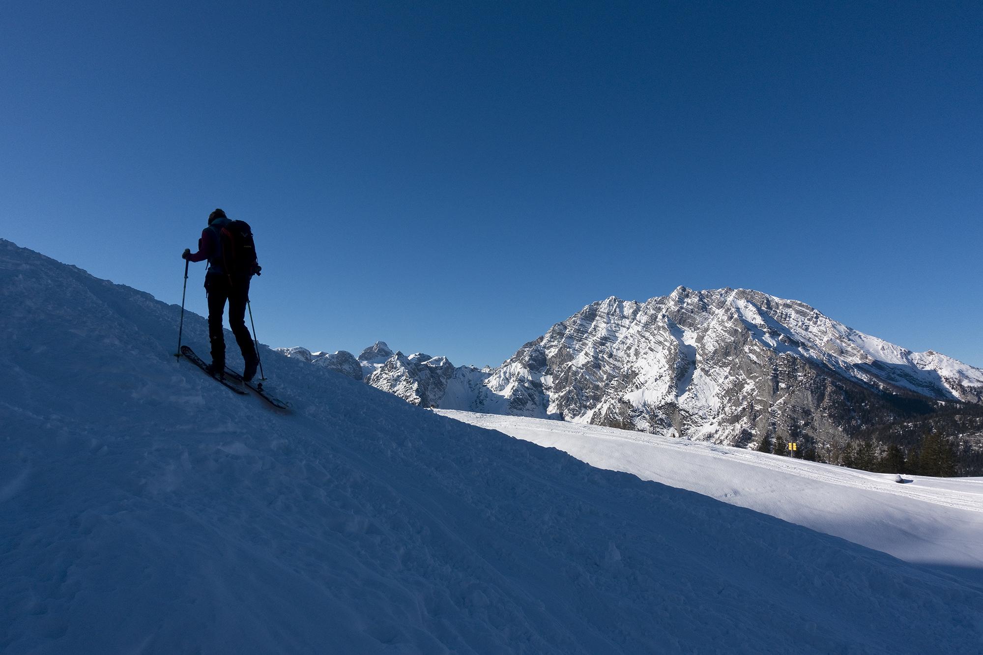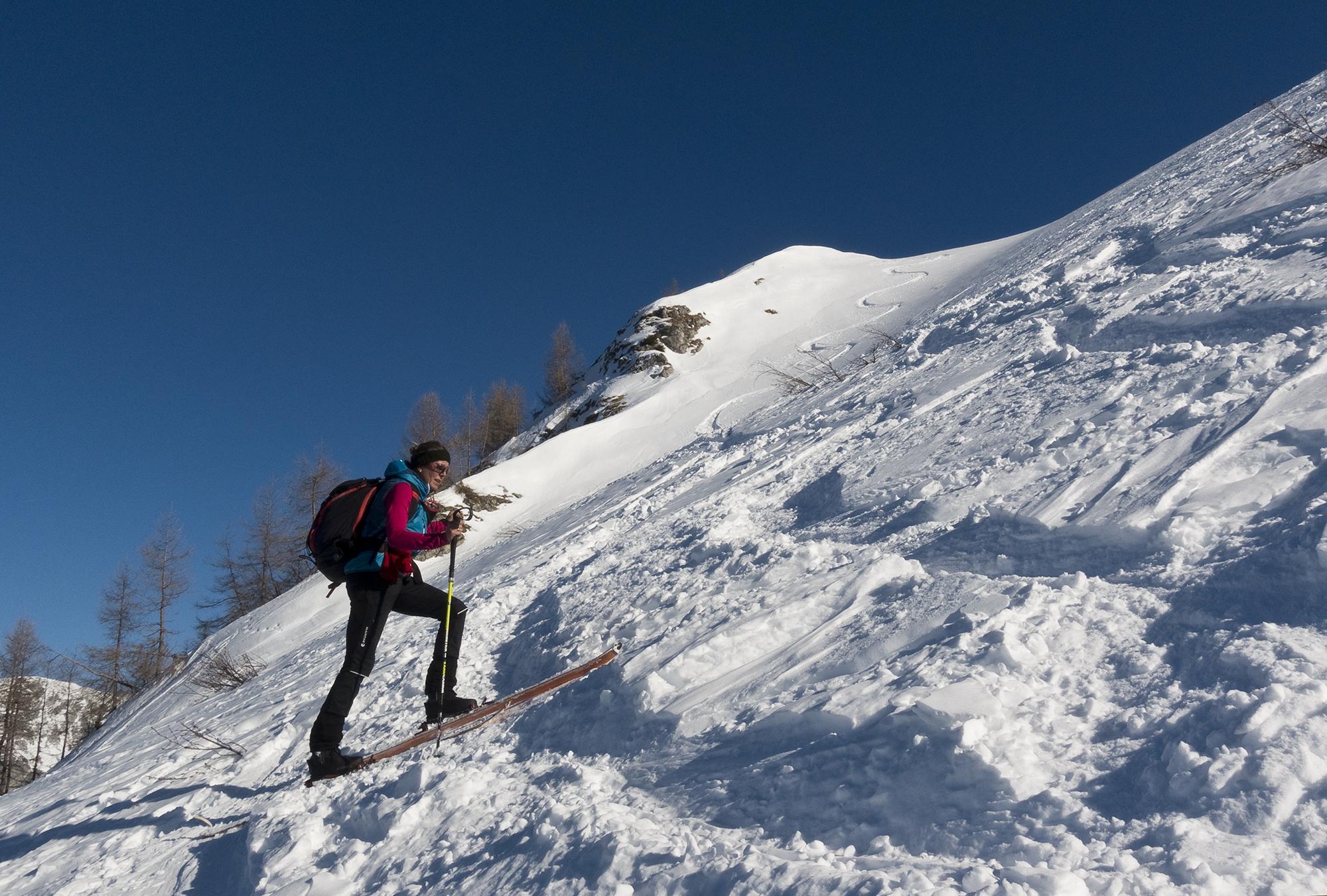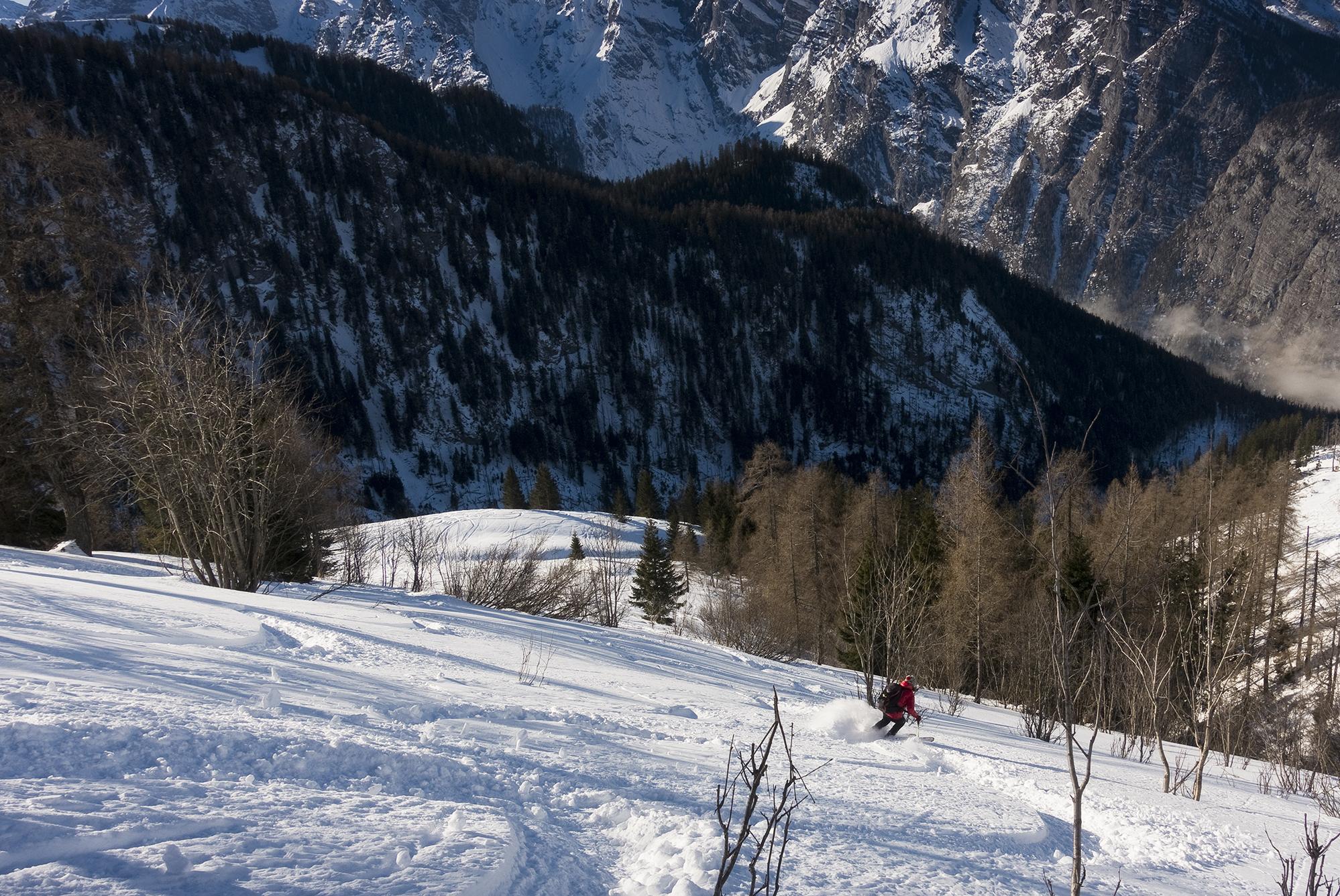 Hochbahn ist schon recht steinig, da geht es nur noch aufwärts durchgehend mit Ski. An den Priesbergalmen kommen wir in die Sonne.