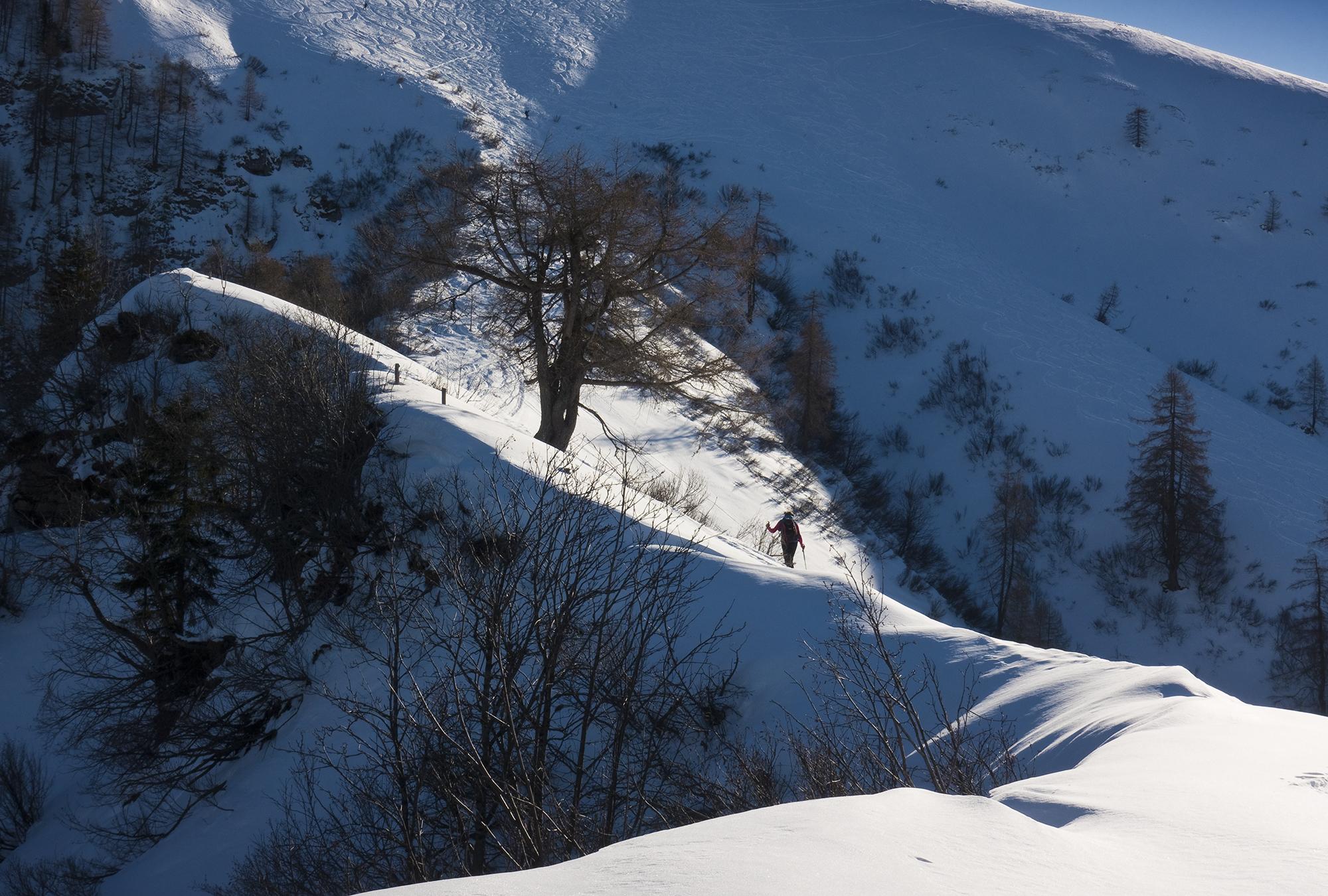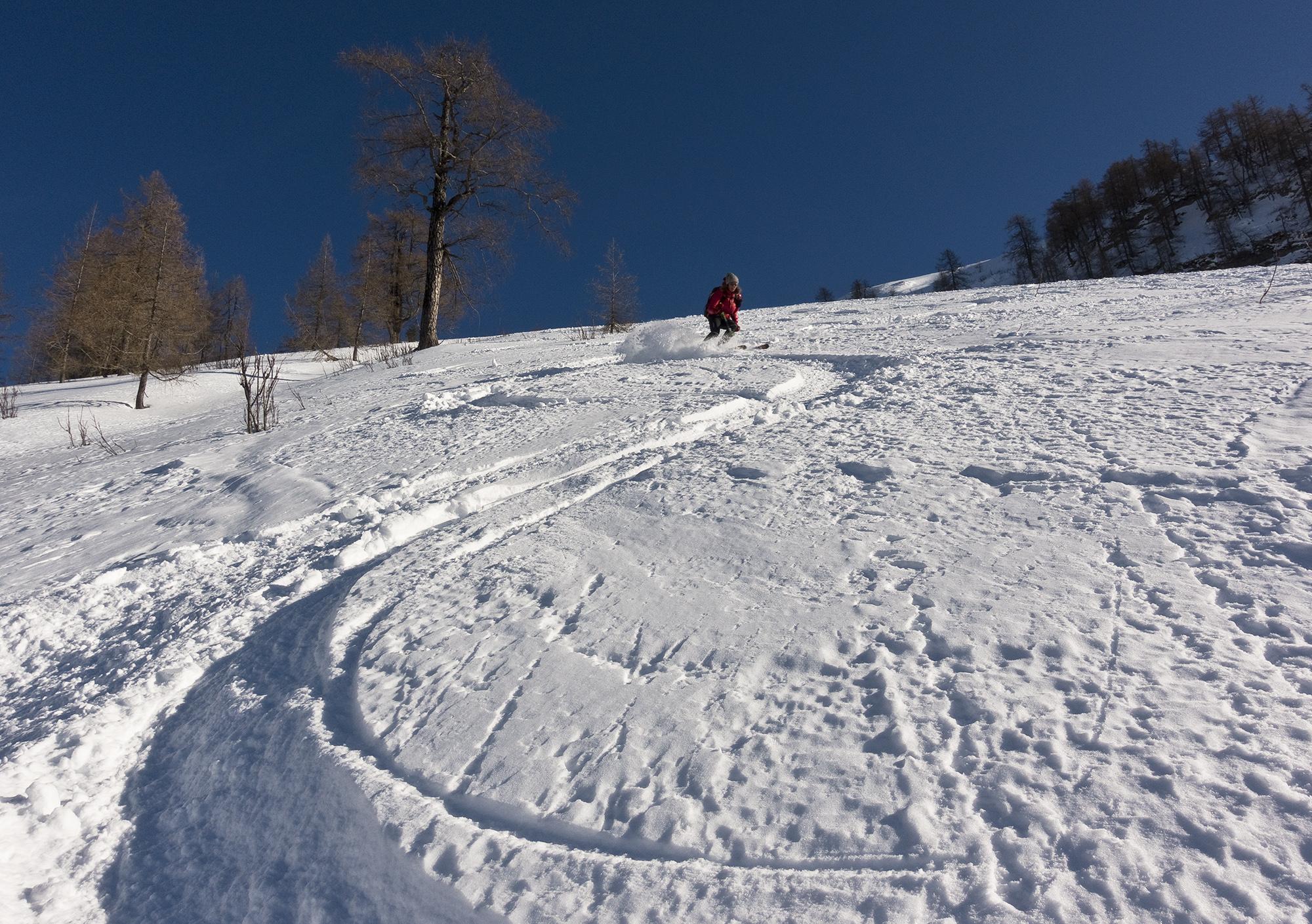 Nur ganz oben ist der Schnee hart und pistenartig ausgefahren, und es gibt schon recht viele Spuren im Pulverschnee, aber es hat ja auch einige Schleichwege, die man kennen muss, dann ist genug Platz für die eigene Spur.