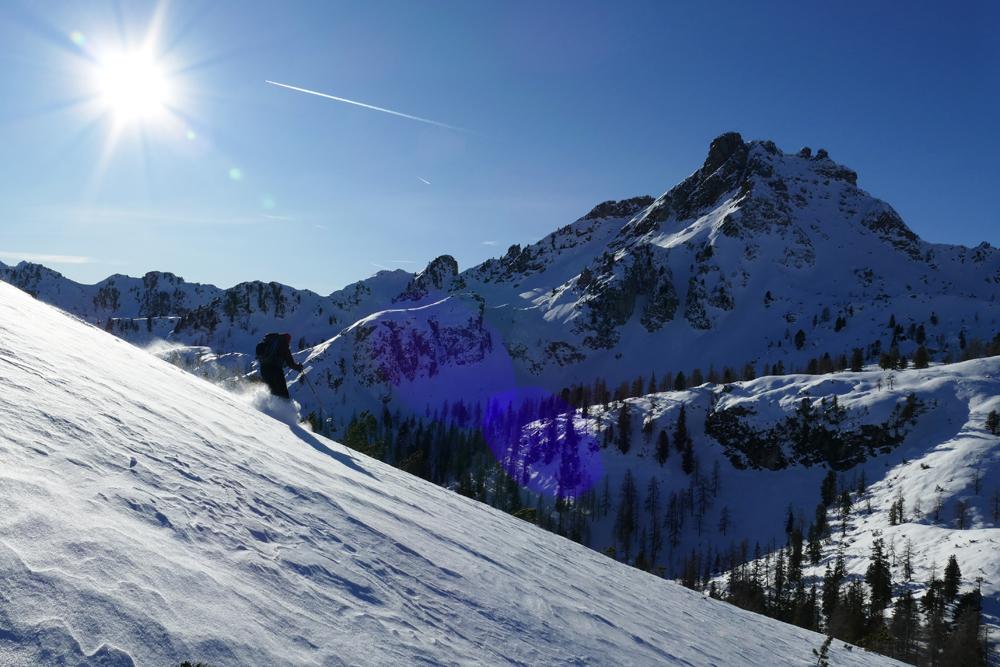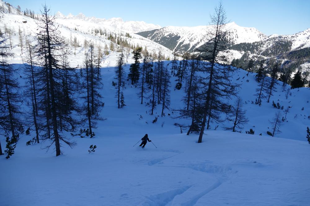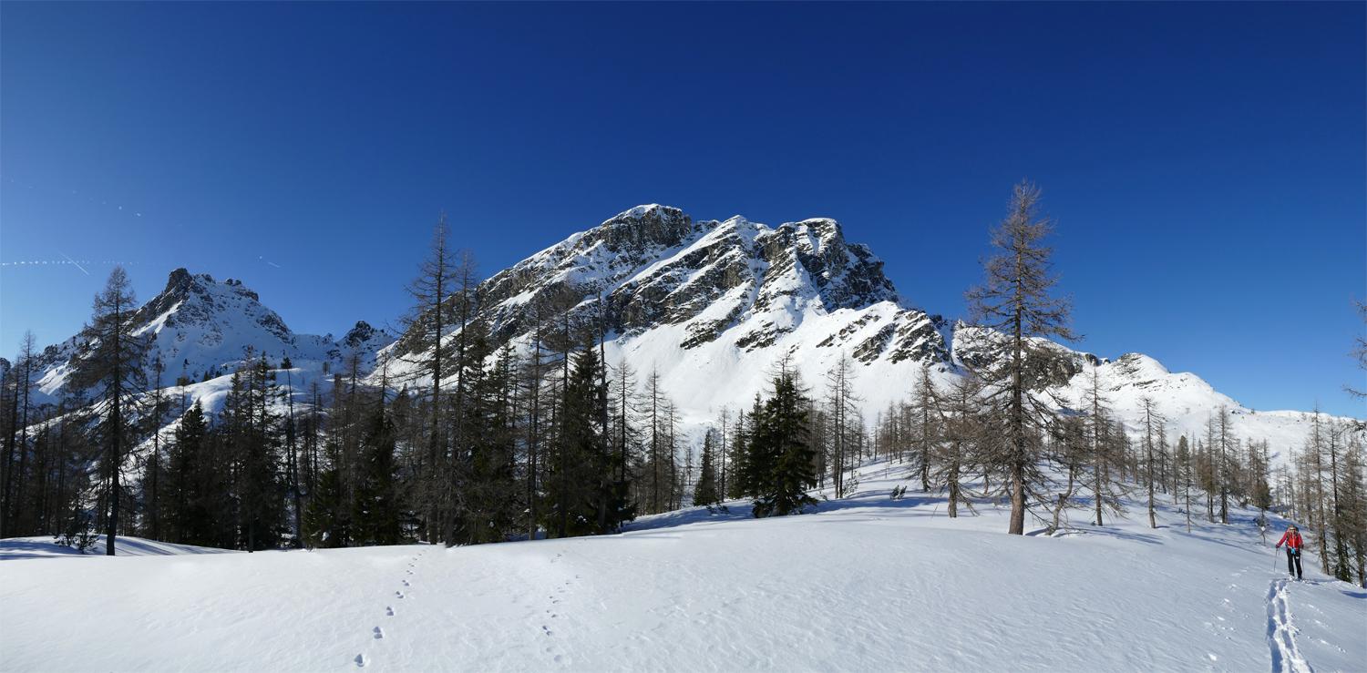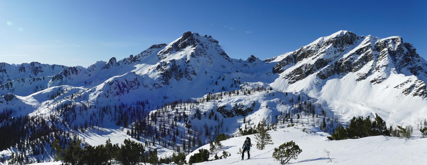 Start bei der Winklhütte im Forstautal bei -7°C. Über die Ellmaualm und die Bergarzkarhütte erreicht man die Waldgrenze. Nördlich des Laitternkogels immer auf den Vorderen Geißstein zugehend erreicht man durch einen lichten Lärchenwald einen sonnigen Sattel. So weit das Auge reicht ist keine weitere Spur als die unsere auszumachen. Von Westen kommend gehts bei immer stärker werdendem Wind und Temperaturen um 0°C auf den kreuzlosen, aussichtsreichen Gipfel. Die mögliche, sehr steile nördl. Abfahrtsvariante ca. 200m östl. des Gipfels haben wir aufgrund der kammnahen Einwehungen bleiben lassen müssen.