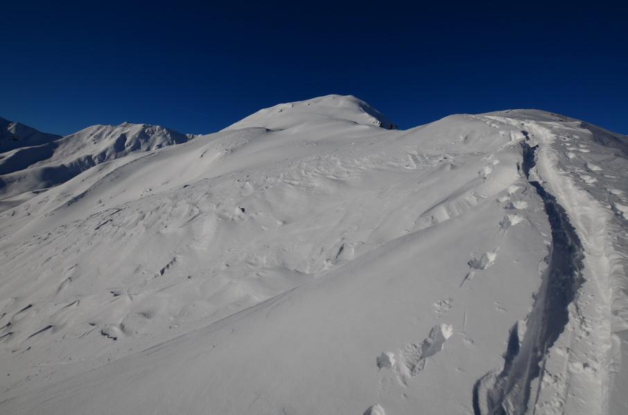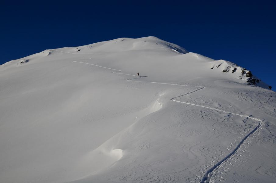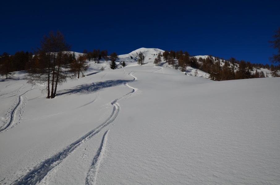 Im Zuge von Auf.- und Abstieg fand ich heute durchgehend recht ansprechende Schneeverhältnisse vor. Von Kalkstein weg muss man zuerst einmal einen riessigen alten Lawinenkegel umgehen, was aber dank der Spur recht einfach ist. Dann wird der frische Neuschnee mit steigender Seehöhe immer mehr. In Kammnähe ist es relativ hart und abgeblasen, ein paar meter unterhalb hat die Schneedecke dann schon einen leichten Windharschdeckel. Die Restlichen Flächen waren dann unverspurte Hänge mit deutlichem Windeinfluss, welcher dank der geringen Hangneigung im Bereich der Austiegsspur nicht kritisch war.