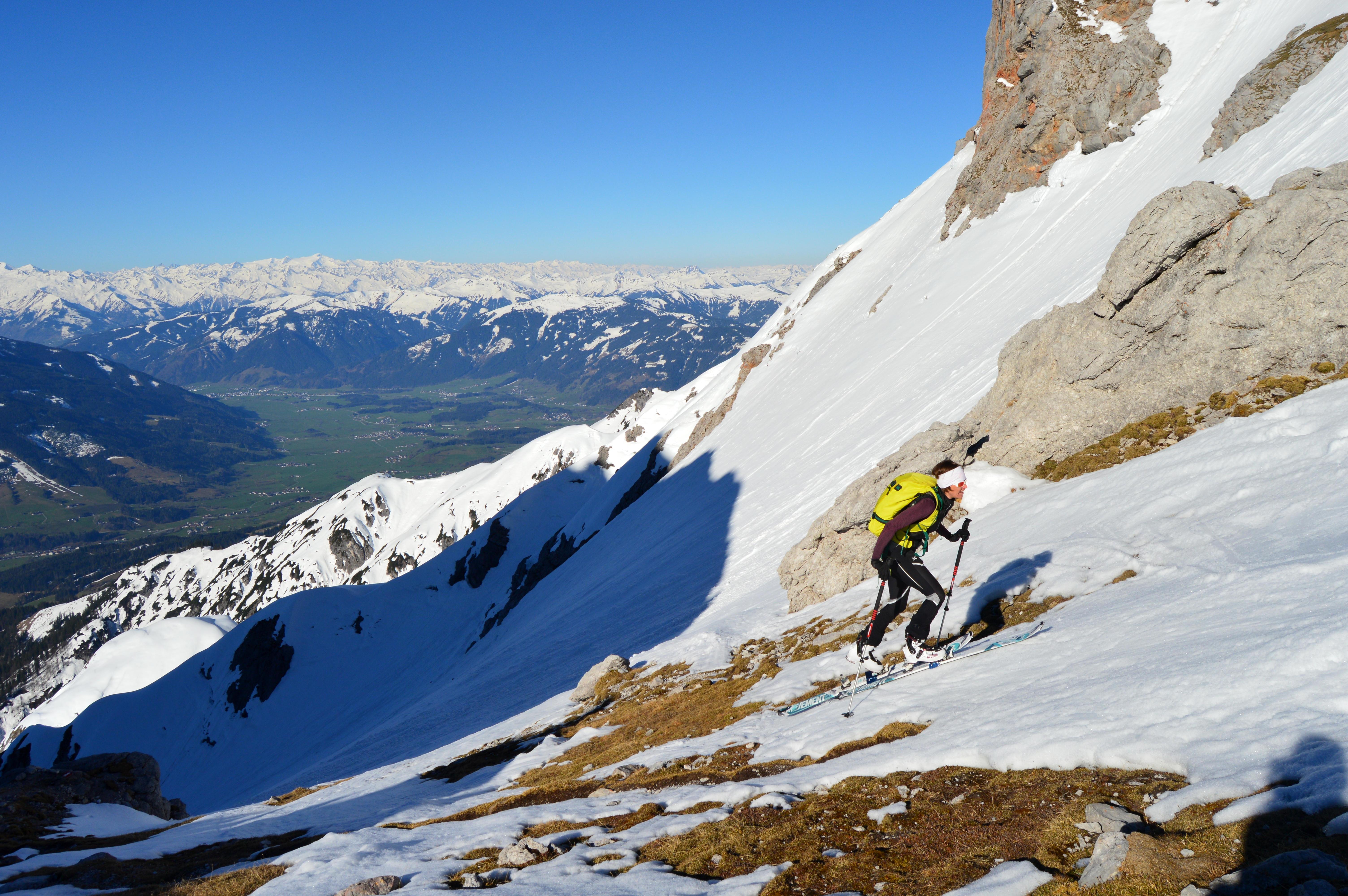 Die Schi müssen mittlerweile den Steig über die Kapelle bis zum flachen Boden, wo eigentlich das freie Gelände beginnt, getragen werden. Auf der Strasse könnte man eventuell etwas früher die Schi anschnallen. Die südseitigen Touren am Steinernen Meer dürften noch einige Zeit,natürlich mit Schitragen machbar und lohnend sein.