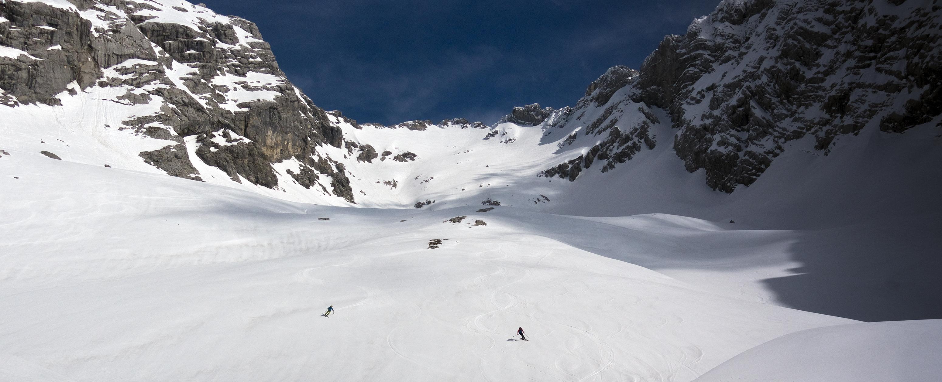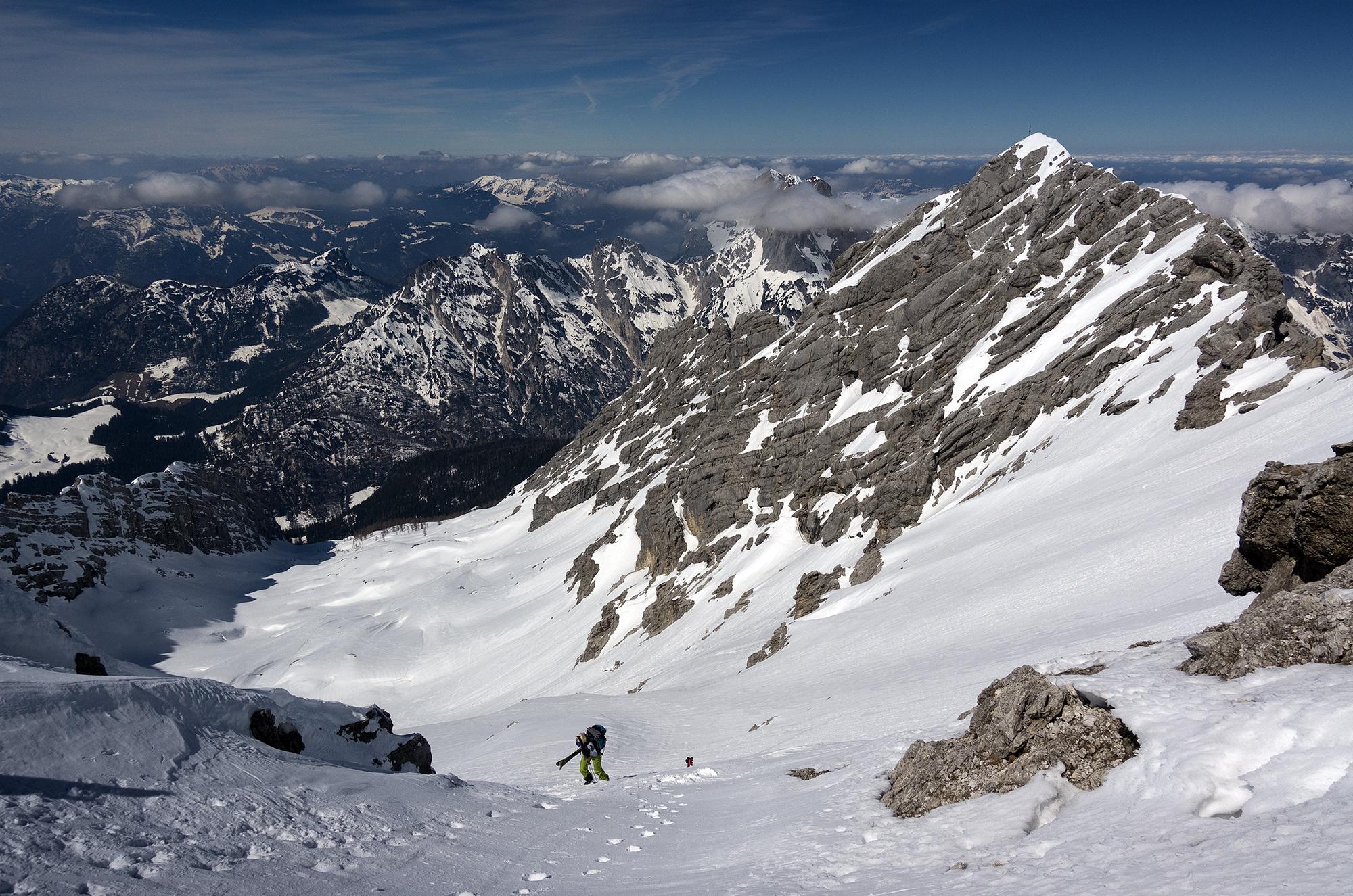 An der Hocheisspitze waren wir heute die Letzten. Dafür hatten wir Traumfirn vom Gipfel bis ins Tal, sogar der untere Steilhang über der Mittereisalm, der in der Früh eishart beim Aufsteigen war, hatte Sonne und war ein paar Zentimeter aufgefirnt.