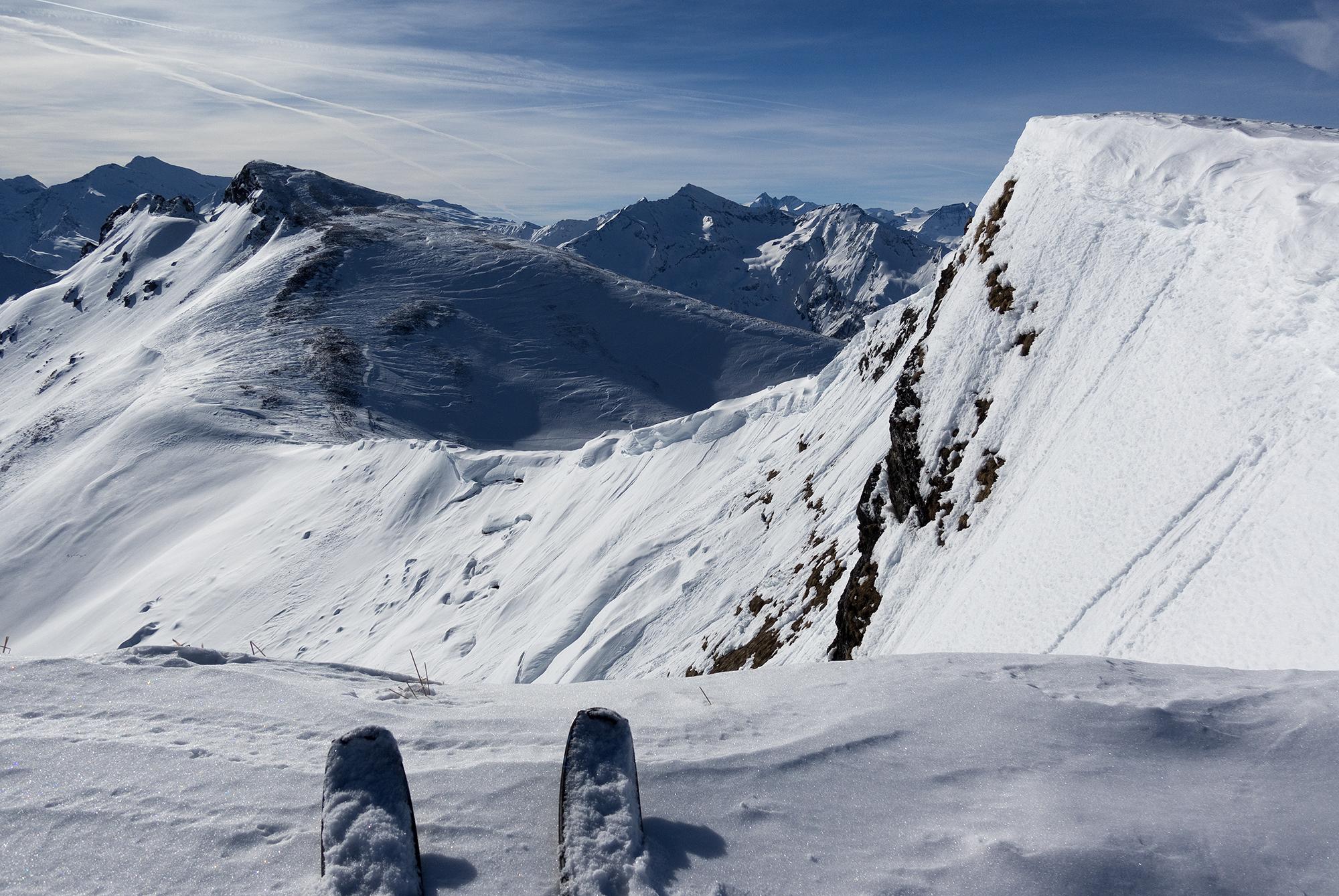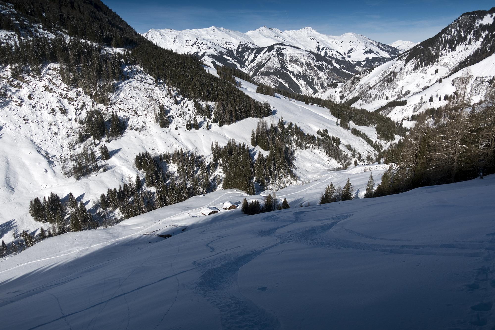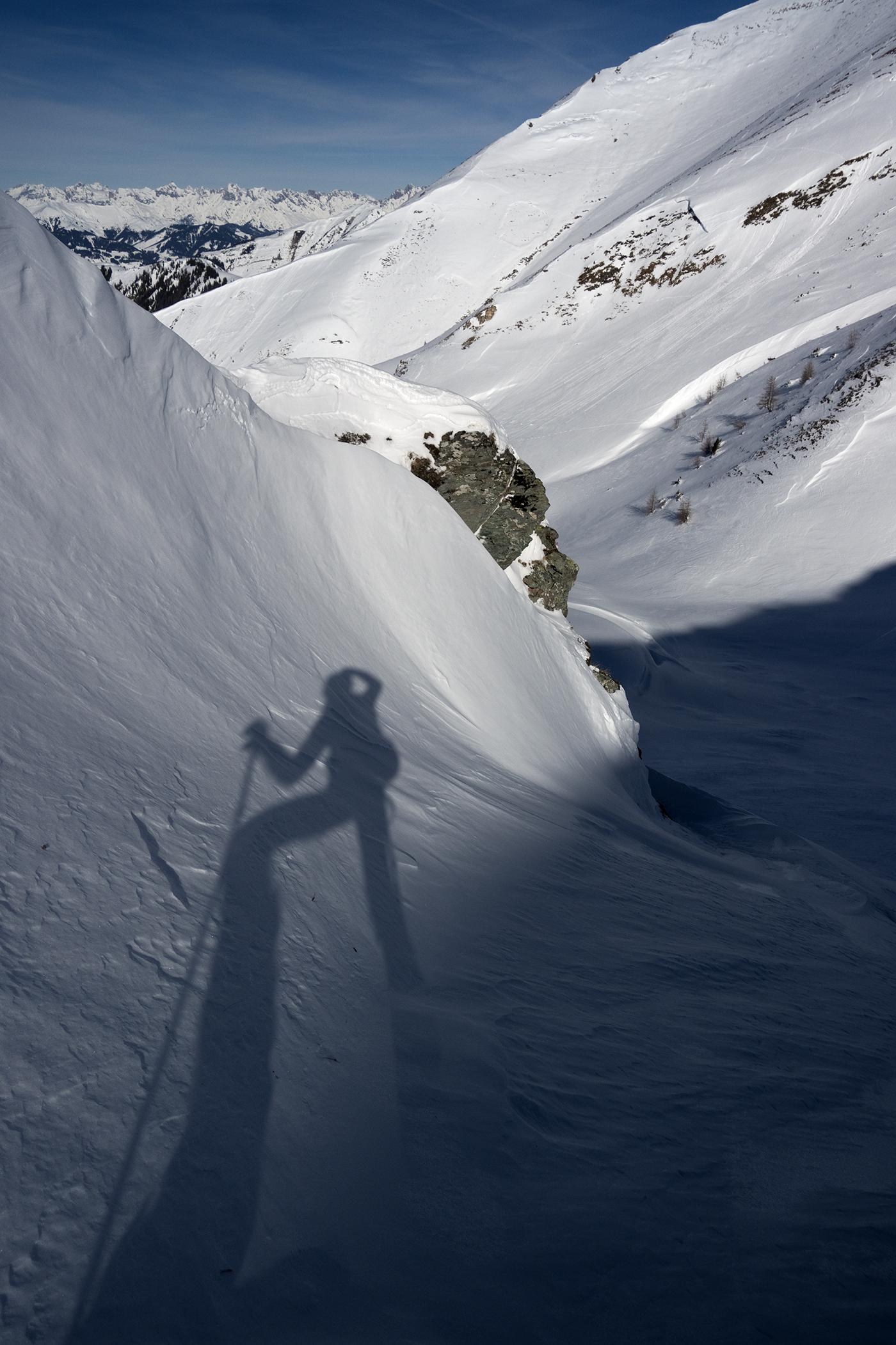 Einsam ist es über dem Forsterbachtal immer, und ich war erstaunt, schon 2 Skispuren von den letzten Tagen vorzufinden. Es liegt nicht überdurchschnittlich viel Schnee, aber 20-30cm Pulver auf fester, im unteren Bereich geringmächtiger Altschneedecke machen sich gut, - und ein paar steilere Varianten unter dem Hundskopf mit wenig Gegenanstieg zurück zur Originalroute sind toll zu fahren. Ganz oben im Gipfelbereich ist der Schnee arg windbehandelt, gepresst, zerfurcht oder weggeweht. Weiter unten, trotz Sonneneinstrahlung, gesetzter aber locker staubender Pulverschnee.