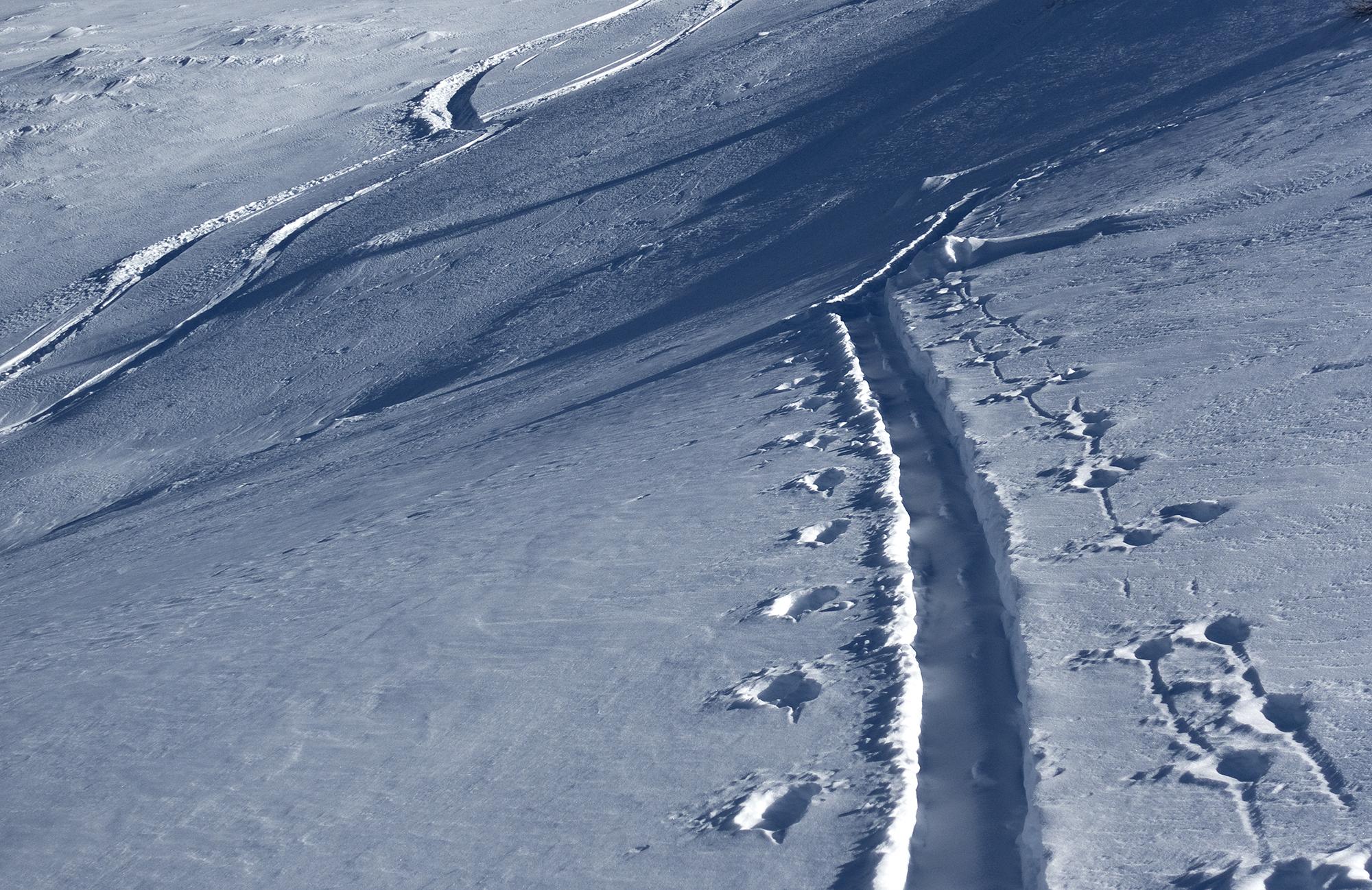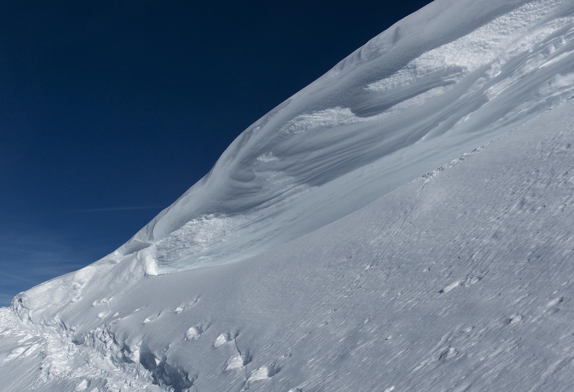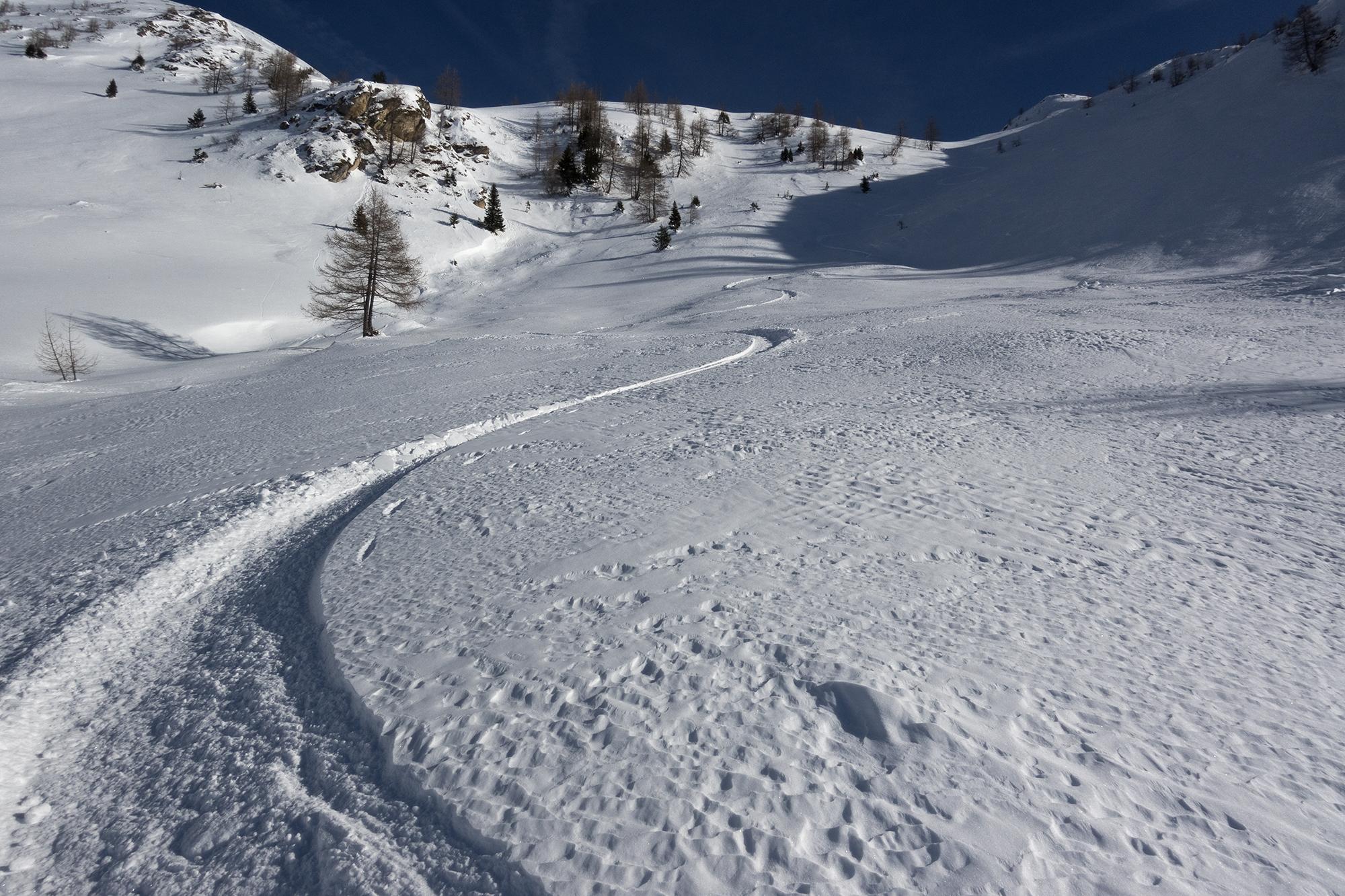 Einsam ist es über dem Forsterbachtal immer, und ich war erstaunt, schon 2 Skispuren von den letzten Tagen vorzufinden. Es liegt nicht überdurchschnittlich viel Schnee, aber 20-30cm Pulver auf fester, im unteren Bereich geringmächtiger Altschneedecke machen sich gut, - und ein paar steilere Varianten unter dem Hundskopf mit wenig Gegenanstieg zurück zur Originalroute sind toll zu fahren. Ganz oben im Gipfelbereich ist der Schnee arg windbehandelt, gepresst, zerfurcht oder weggeweht. Weiter unten, trotz Sonneneinstrahlung, gesetzter aber locker staubender Pulverschnee.