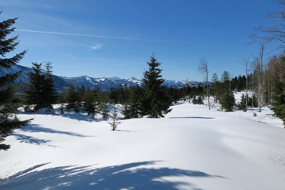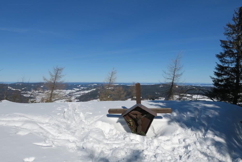 Bedingungen: Ab 500m rasch ansteigende Schneedecke, auf 800m bereits rund 1,50m, auf 1000m 2-3m. Südseitig und oben am freien Kamm sehr weich und schwer (sulzig), im Schatten (nordseitig) zum Teil noch herrlicher Pulver auf kompakter Altschneedecke. Viel Schneebruch ab 800m aufwärts, auf 1000-1100m teils massive Schäden im Nadelwald (überwiegend Stamm- und Wipfelbrüche), Wege aber großteils problemlos begehbar.