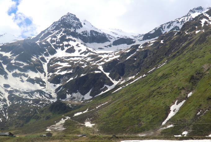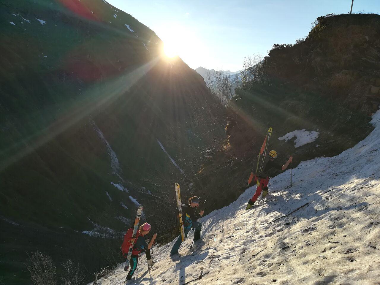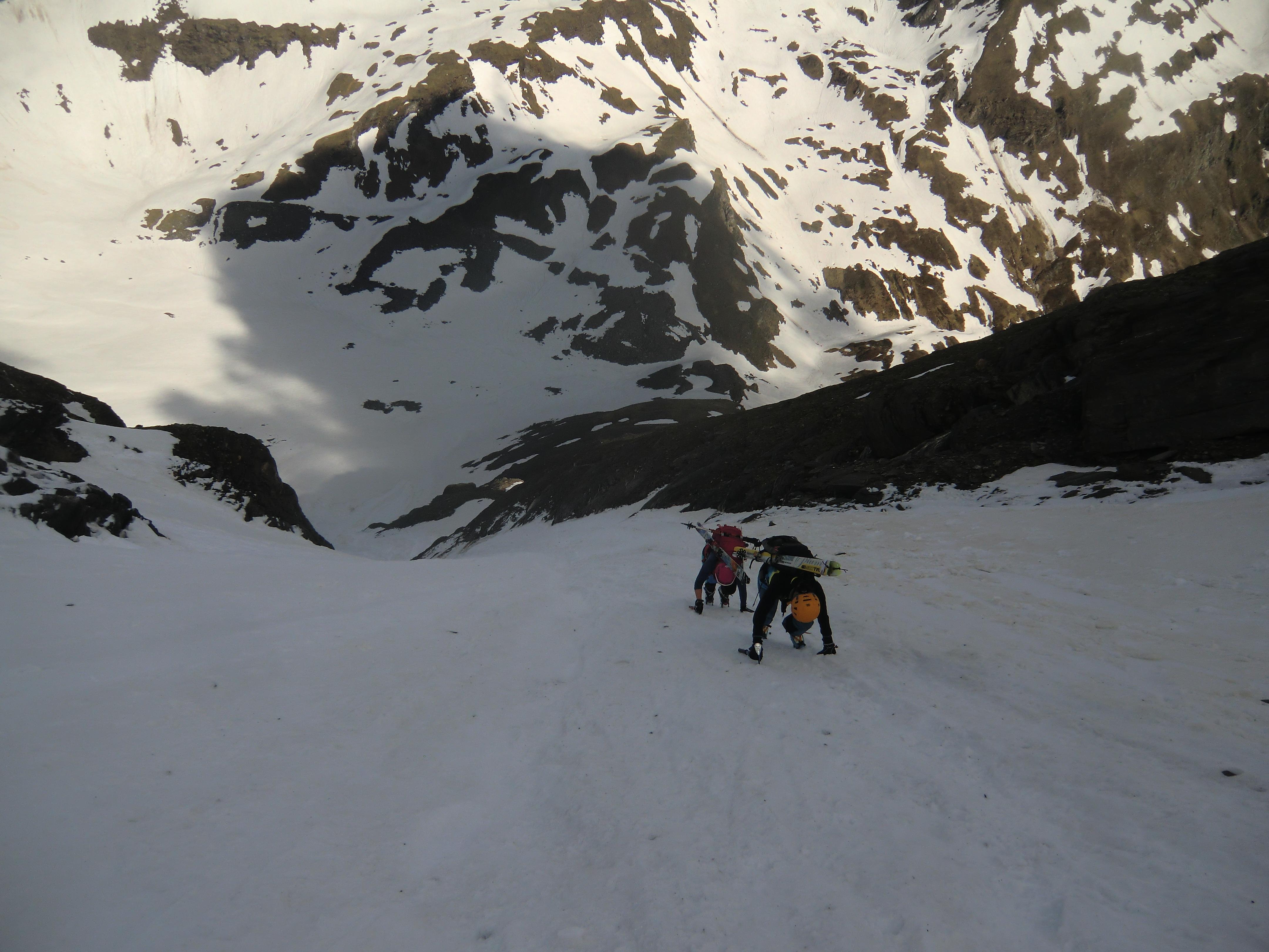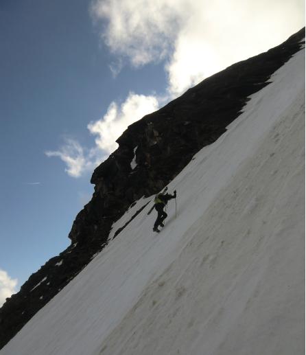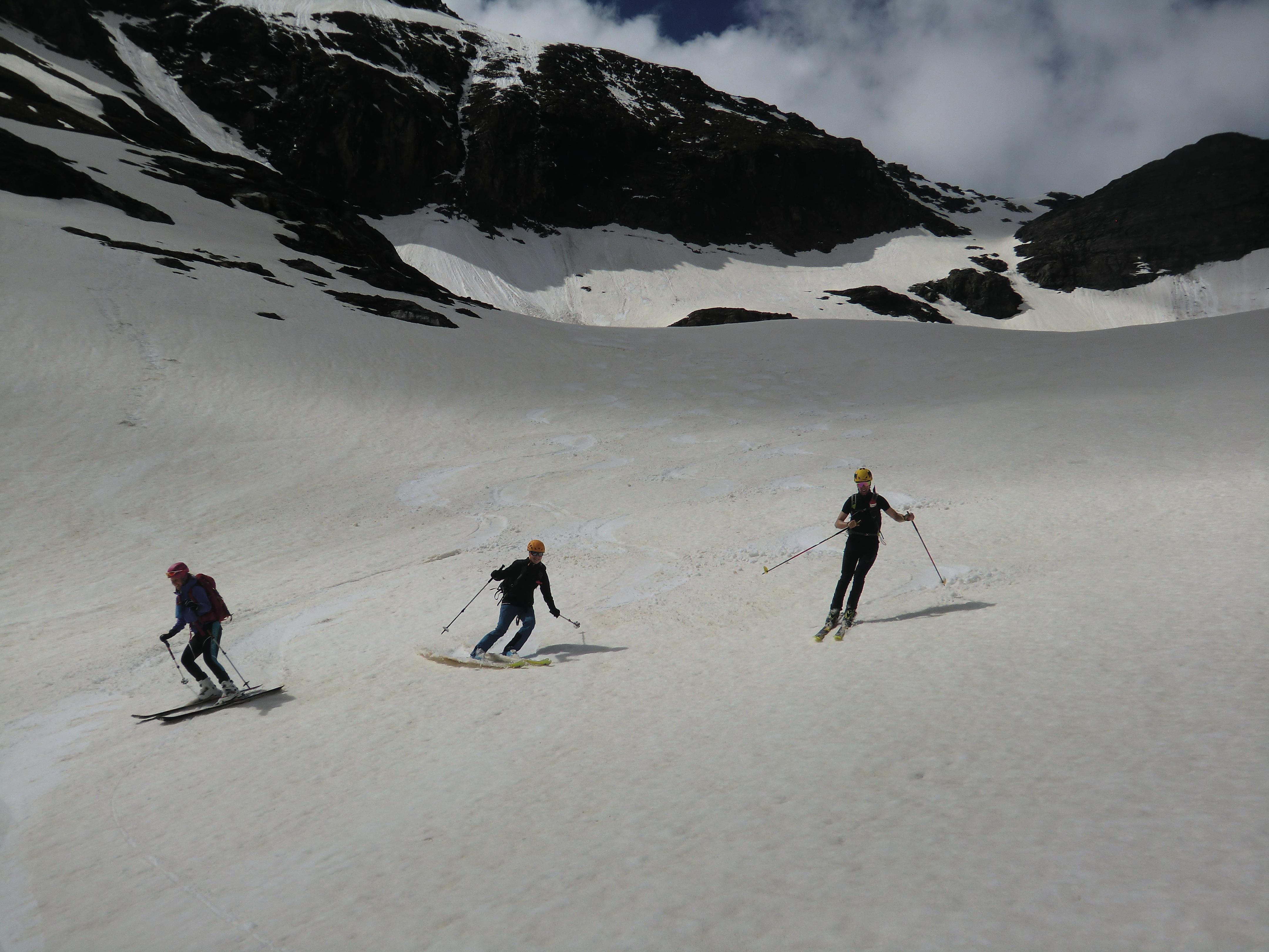 Schnee: Tragen bis 2070m, teilweise über alte Lawinenkegel. In der Rinne harter Trittfirn, oberhalb von ca. 2800m Stapfschnee. Abfahrt um 10Uhr bis auf ca 1820m, meist auf super Sommerfirn.