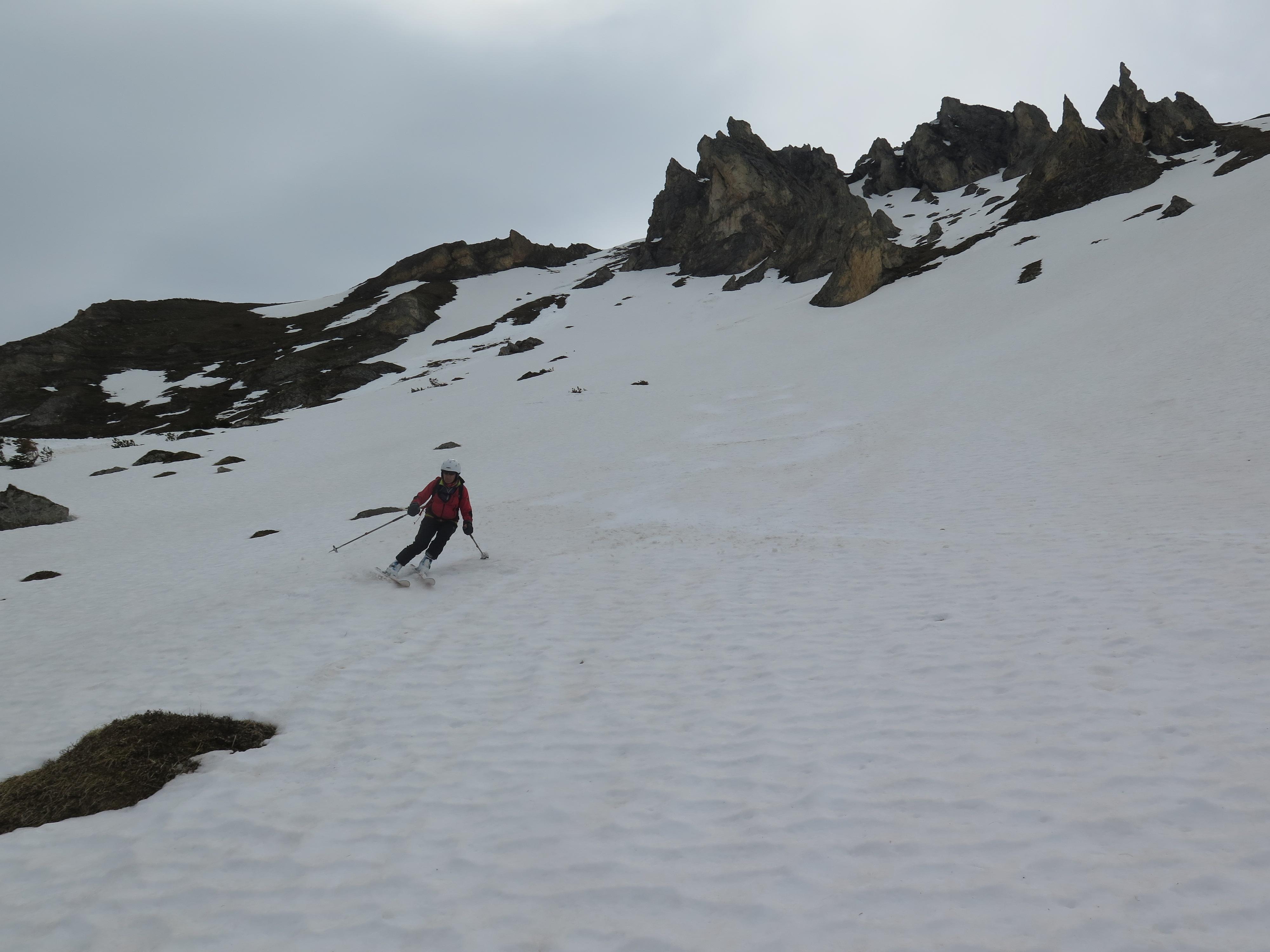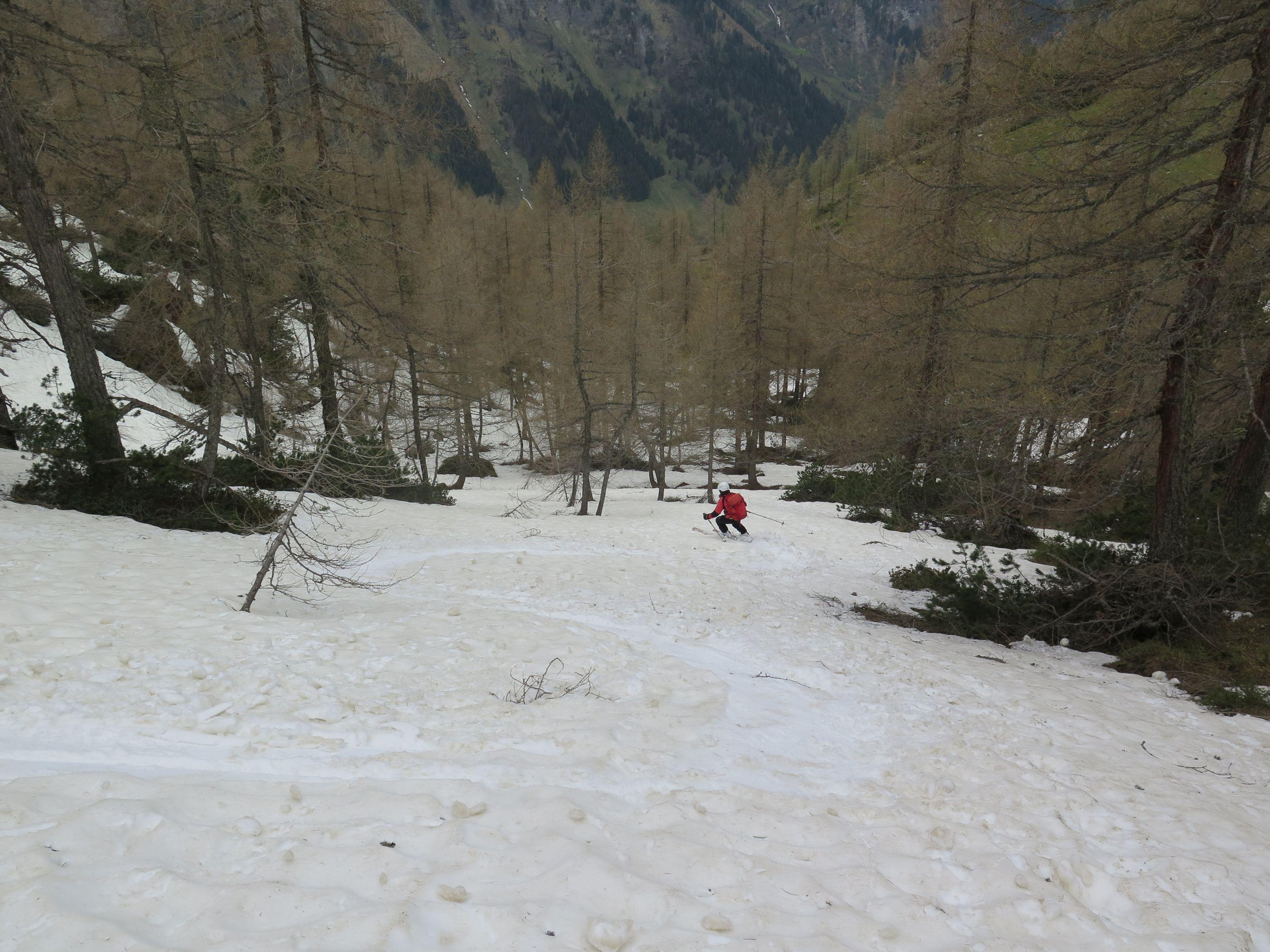 Schnee: bis zur Blockhütte unterhalb der gelben Wände Frühstücksfirn, im Lärchenwald wirds etwas tiefer.