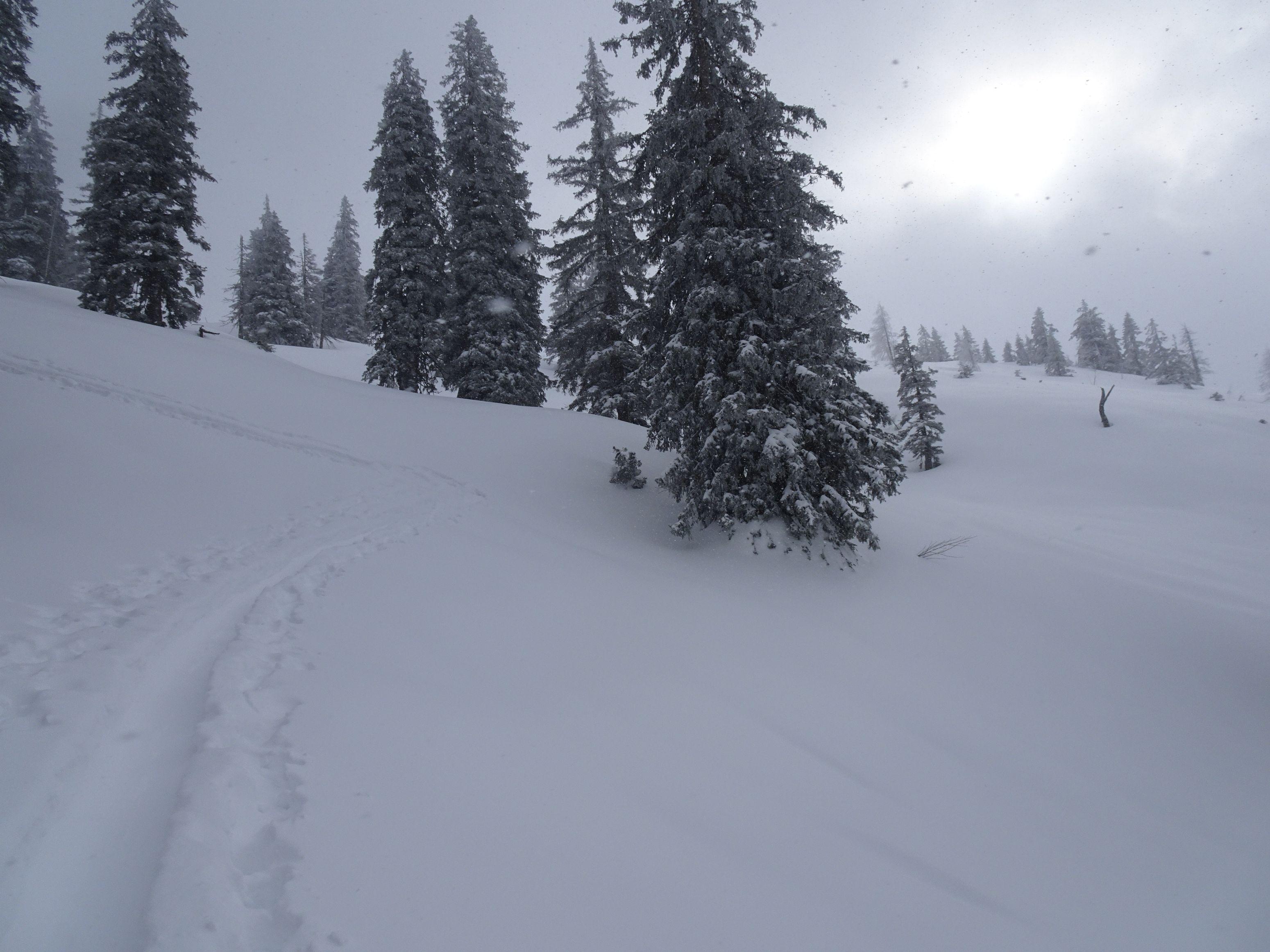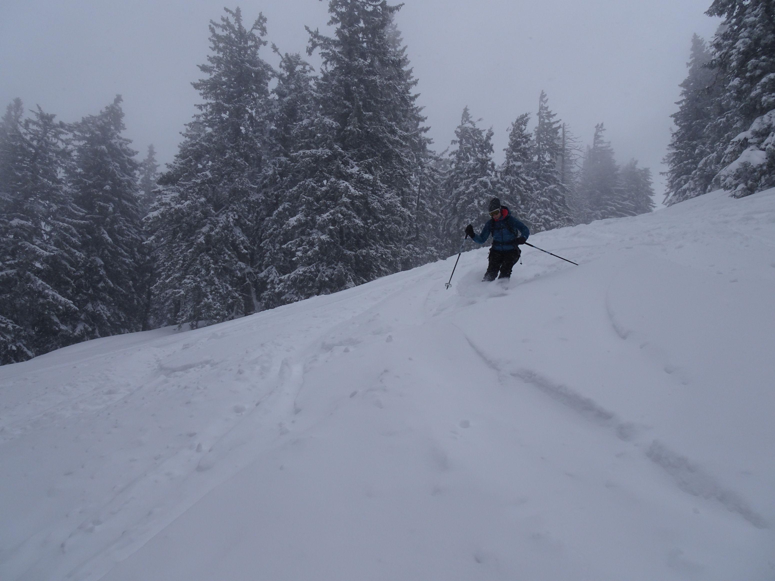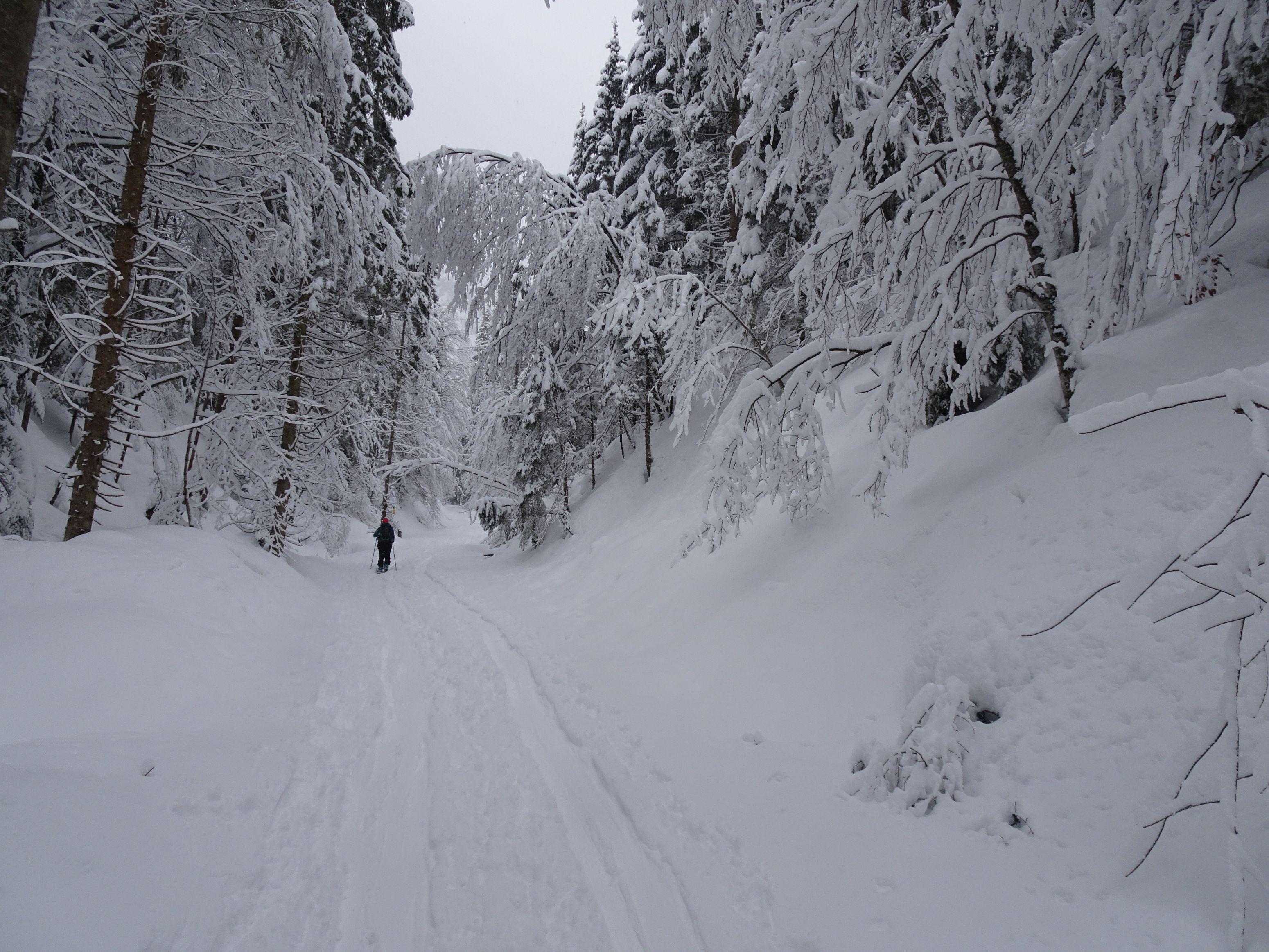In Salzburg ein Mix aus Regen und Schnee, am Ausgangspunkt nahe dem Weiler Aschenau tiefwinterliche Verhältnisse. Wetter grausig, Nebel, zeitweise lebhafter Wind, leichte Graupel und Schneeschauer, dafür gabs heute eine schöne Pulverschneeabfahrt. Alter Lawinenkegel von der Roßgasse zum Roßgassenboden.