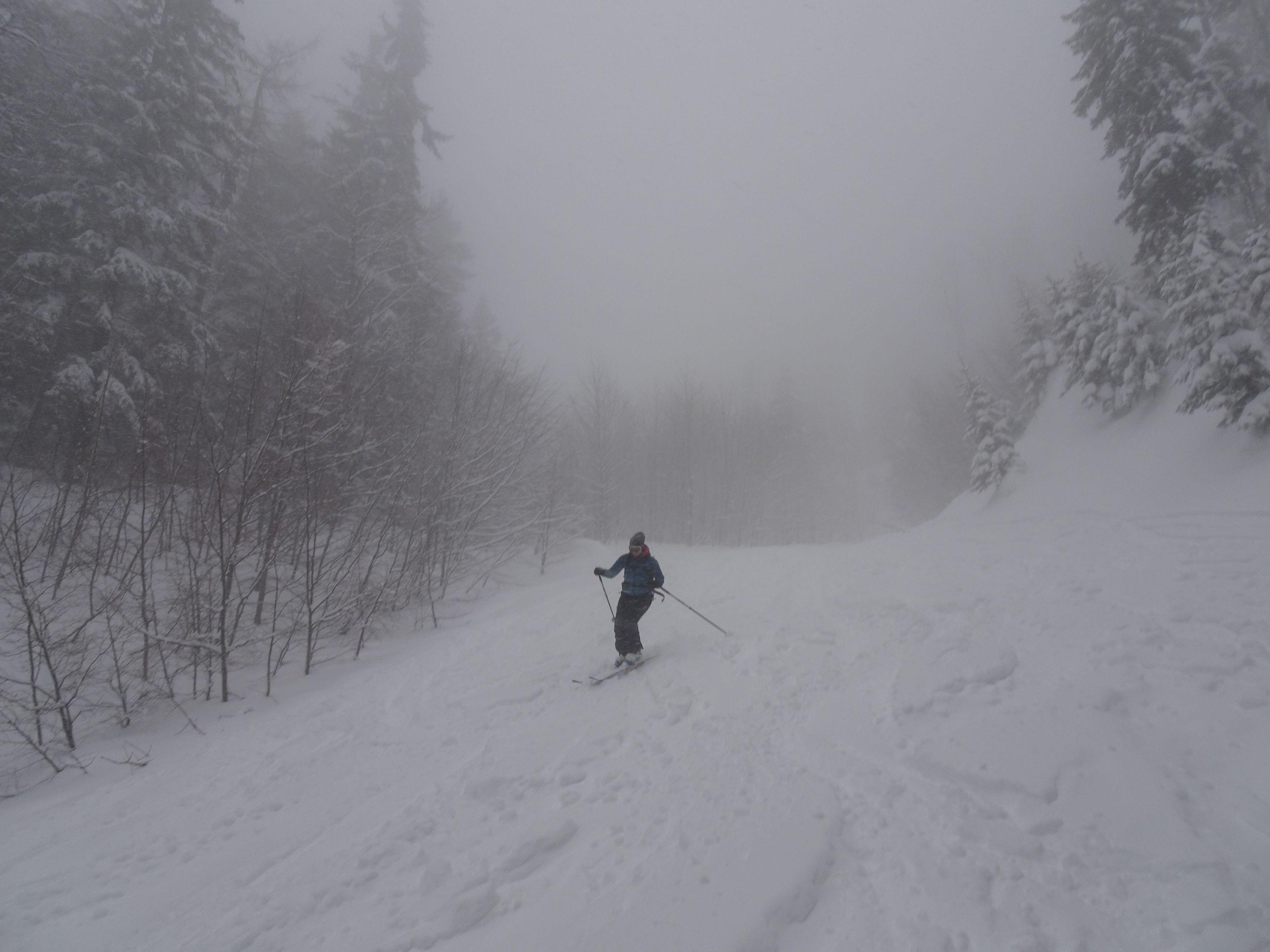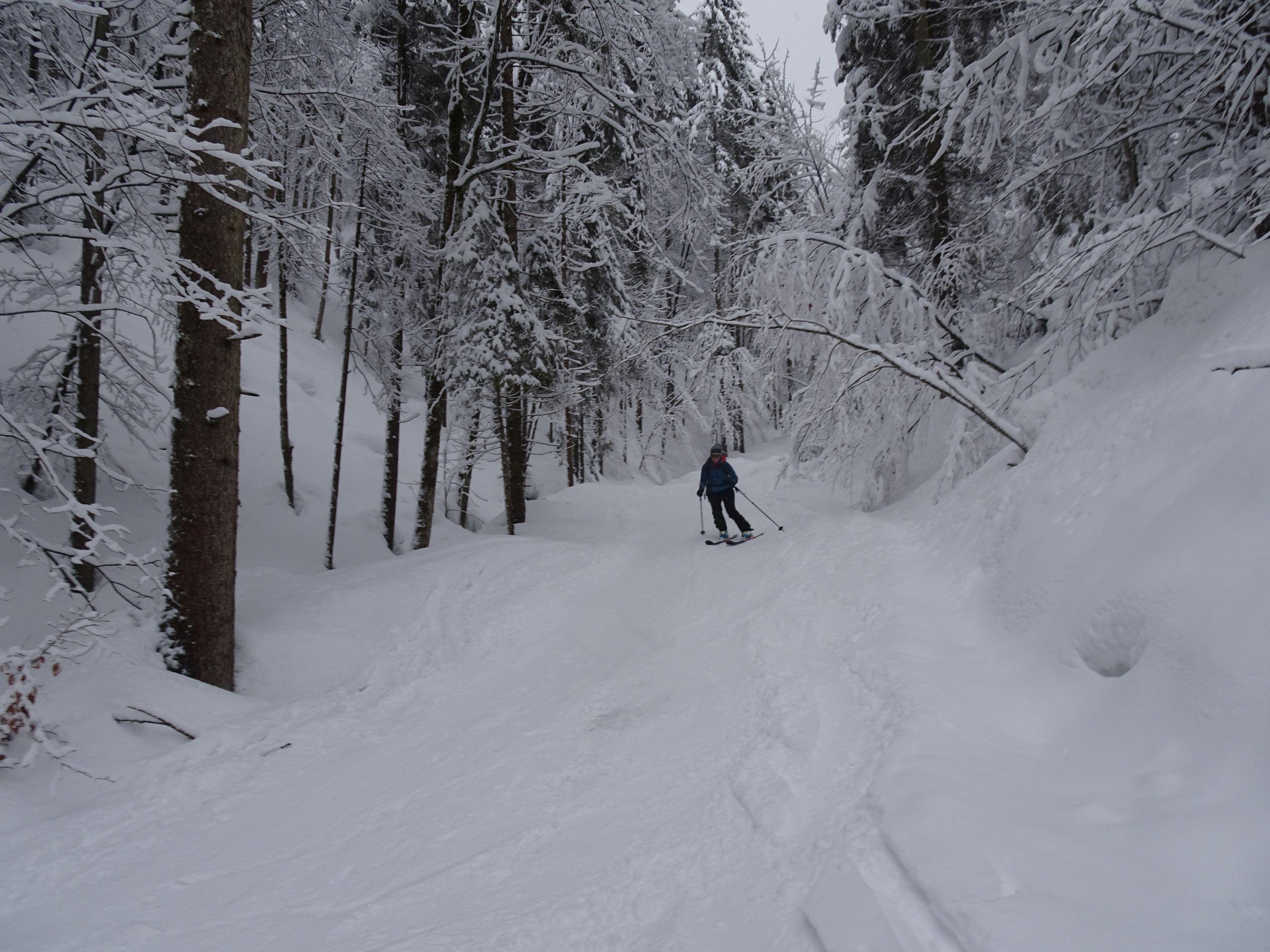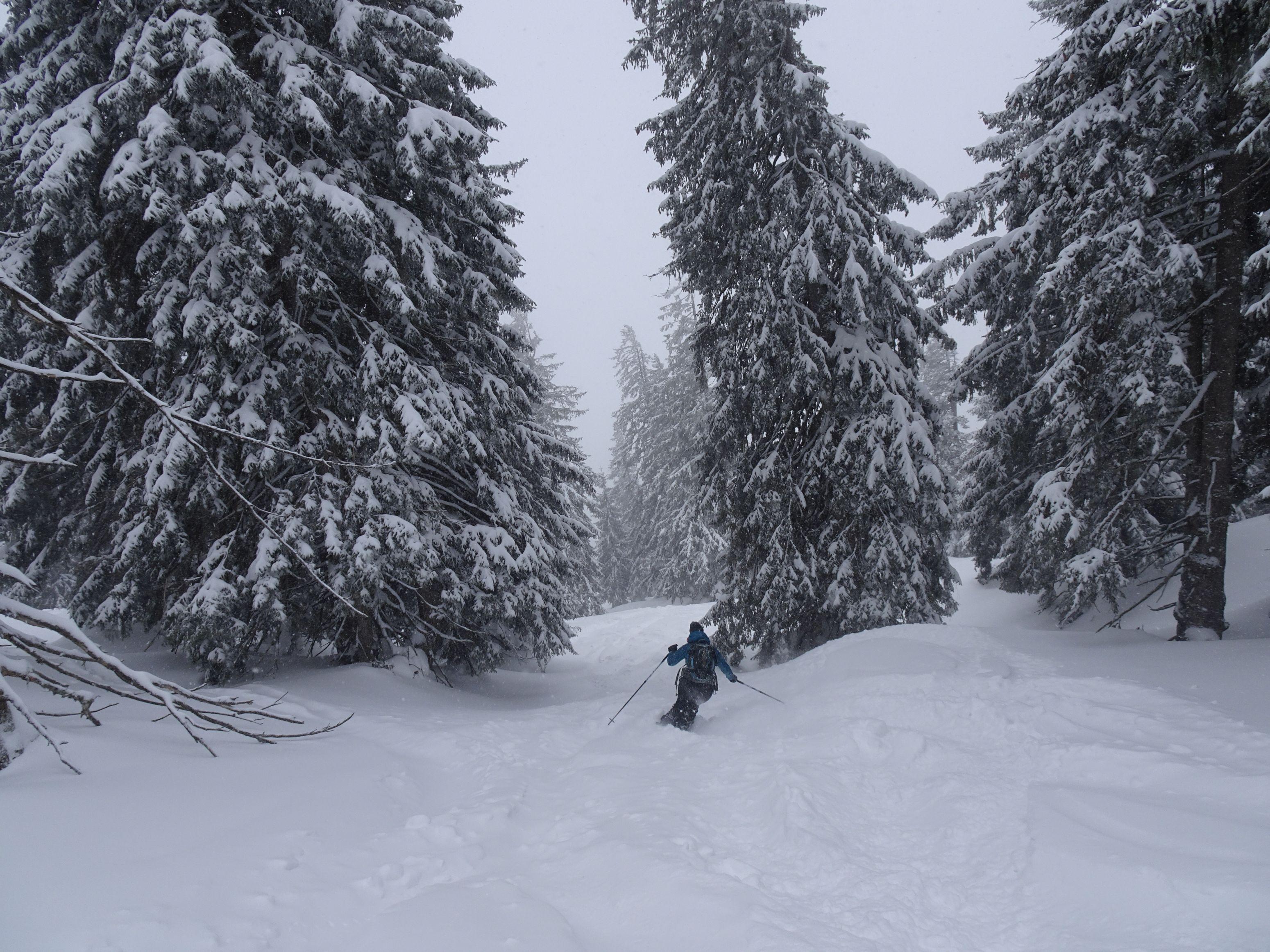 In Salzburg ein Mix aus Regen und Schnee, am Ausgangspunkt nahe dem Weiler Aschenau tiefwinterliche Verhältnisse. Wetter grausig, Nebel, zeitweise lebhafter Wind, leichte Graupel und Schneeschauer, dafür gabs heute eine schöne Pulverschneeabfahrt. Alter Lawinenkegel von der Roßgasse zum Roßgassenboden.