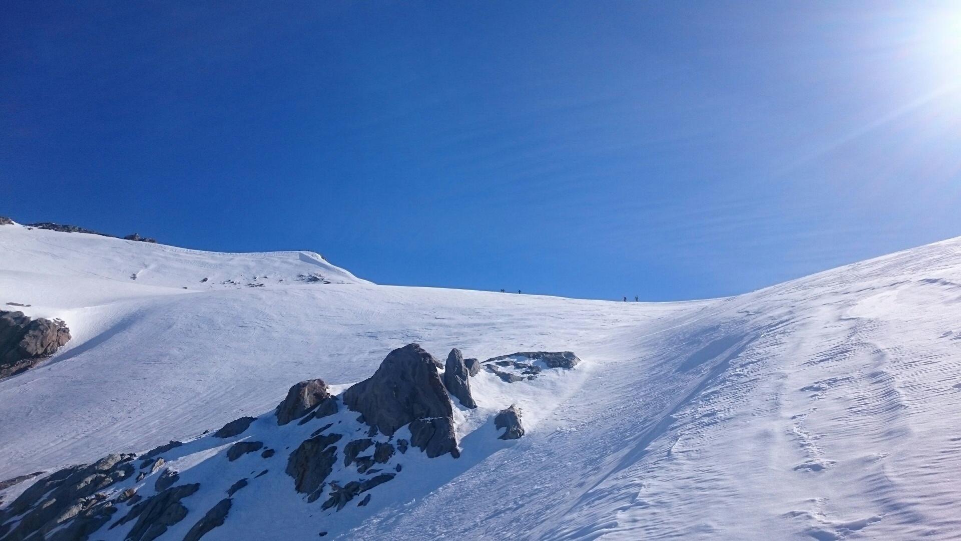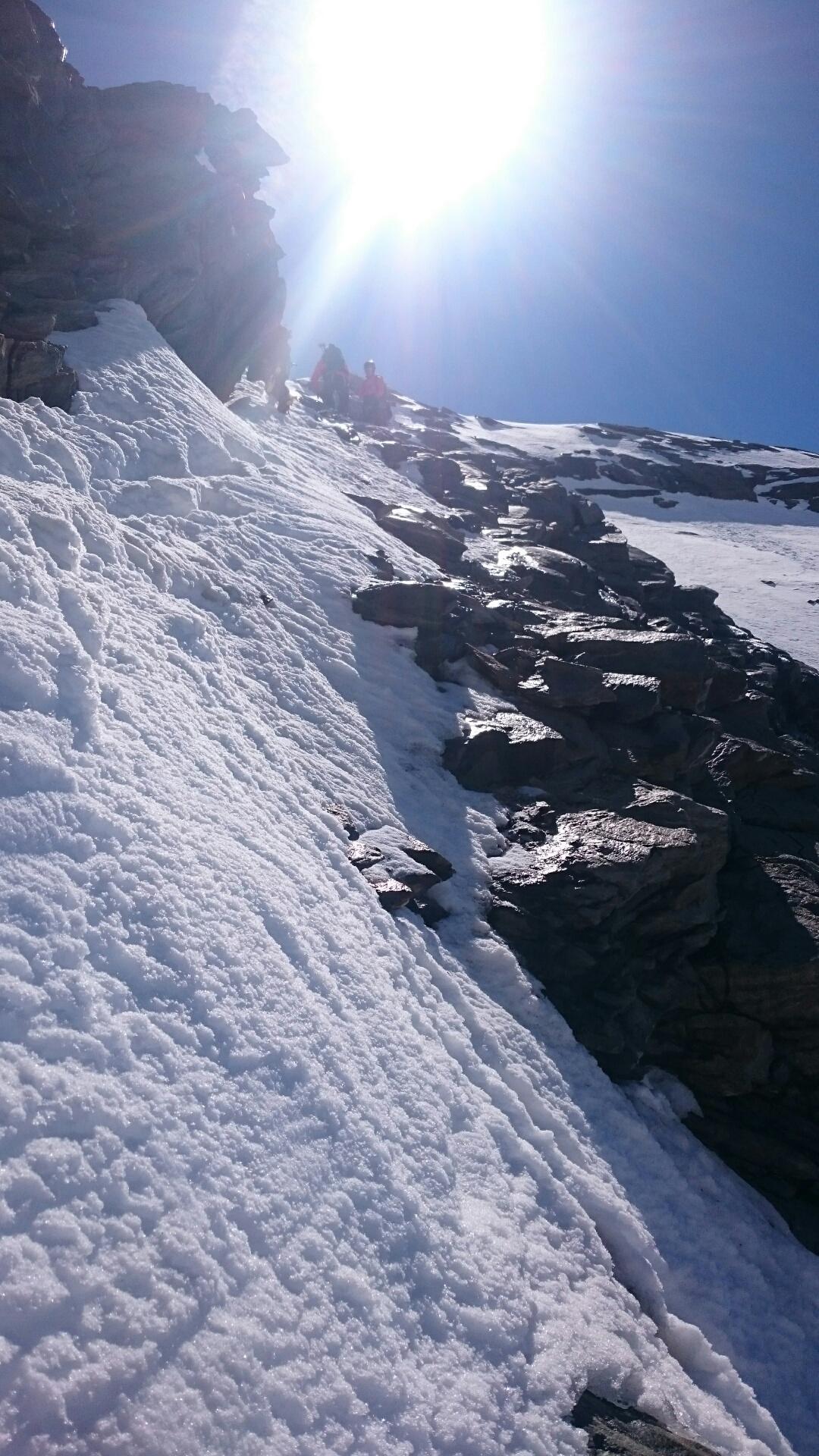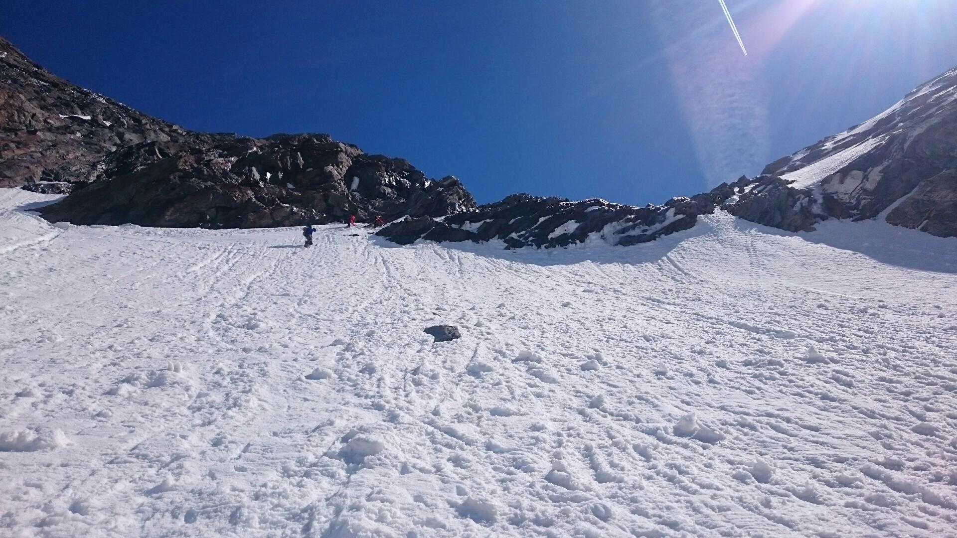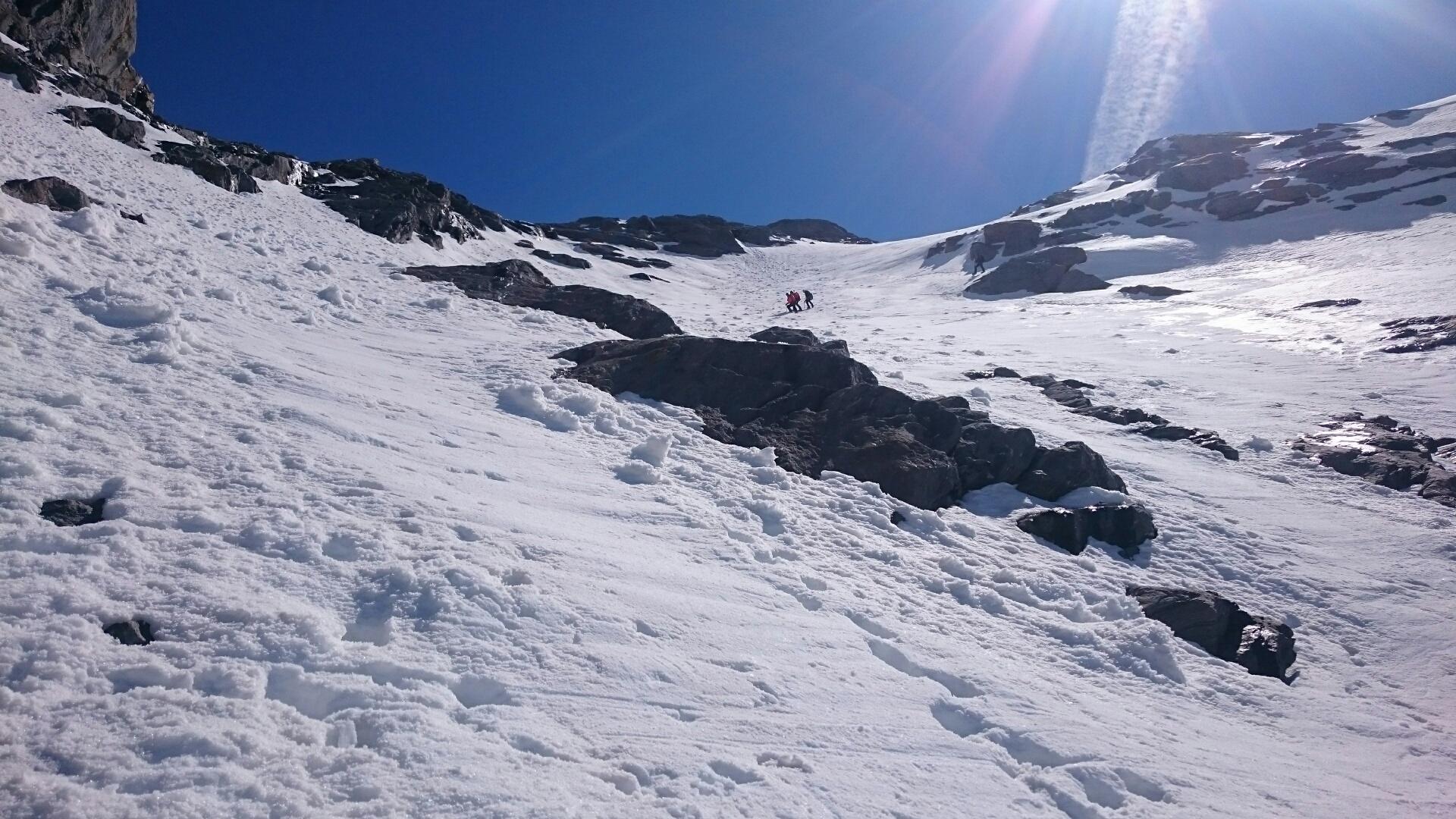 Blick vom Ausstieg aus der Flanke Richtung Gipfel