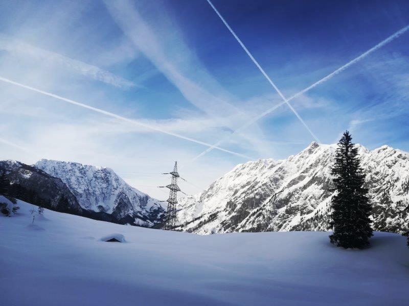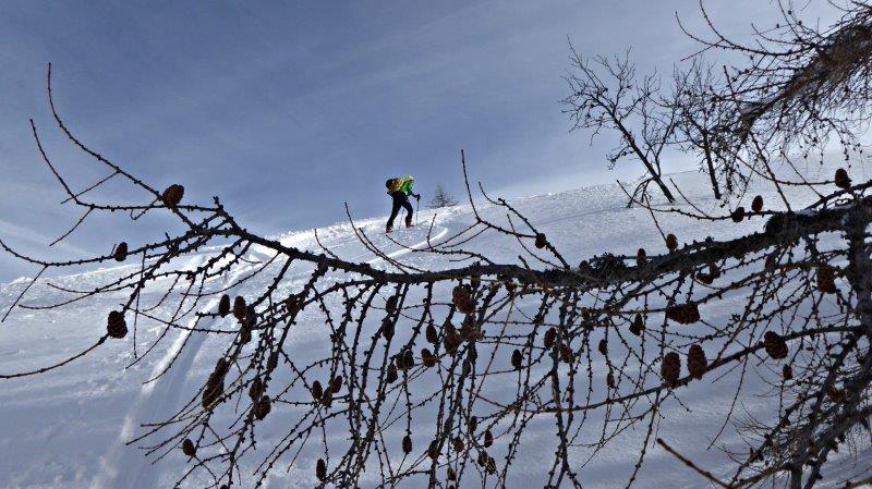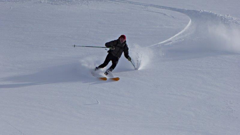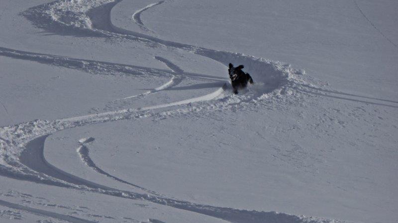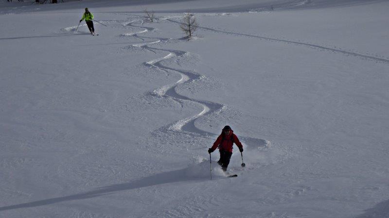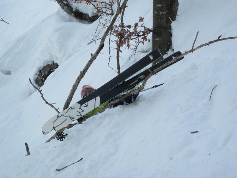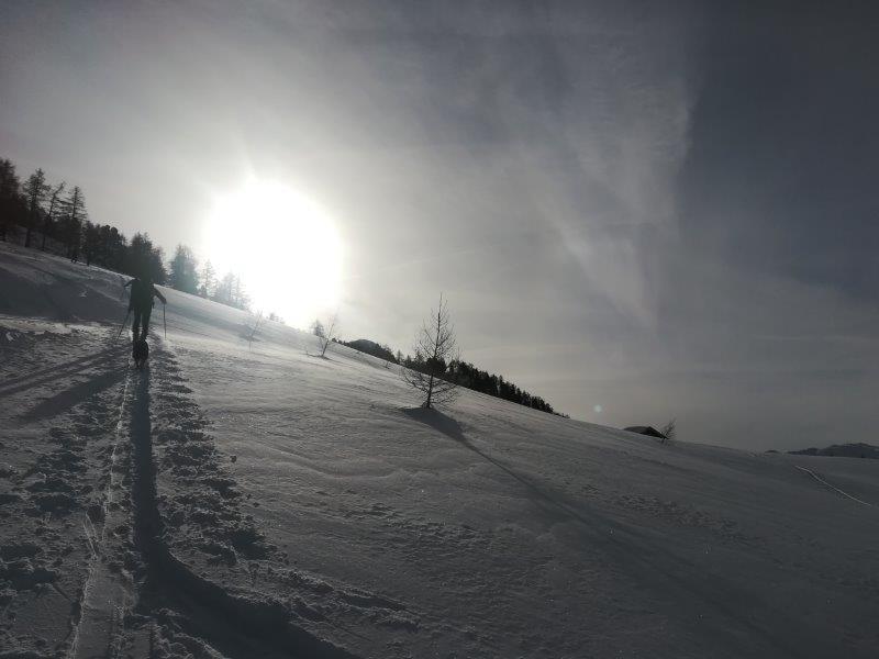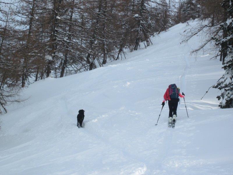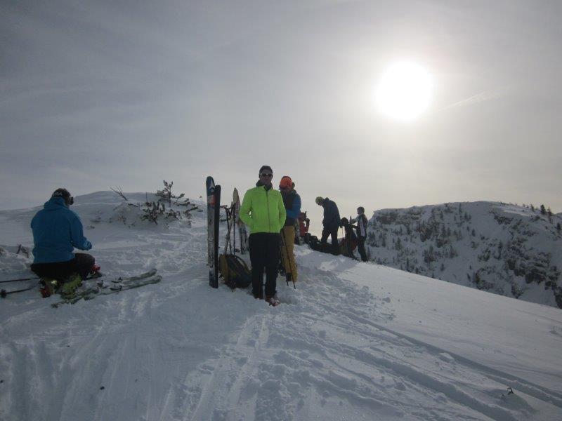Die ersten 200, ostseitigen Höhenmeter von Ager (892 m) hinauf hatten bereits einen ganz dünnen Schmelzharschdeckel vom Sonnenschein des Vortags. Ansonsten gab es bis auf 2 000 m hinauf eine gut gesetzte Schneedecke mit 20 cm Pulver drauf, sowohl im Wald als auch auf den freien Almwiesen. Der Nordrücken zum Gipfel war auf der Westseite stark abgeweht und daher ostseitig gewaltig überwechtet. Zuerst ging's noch mit Harscheisen und dann per Stapfen zum Gipfel.