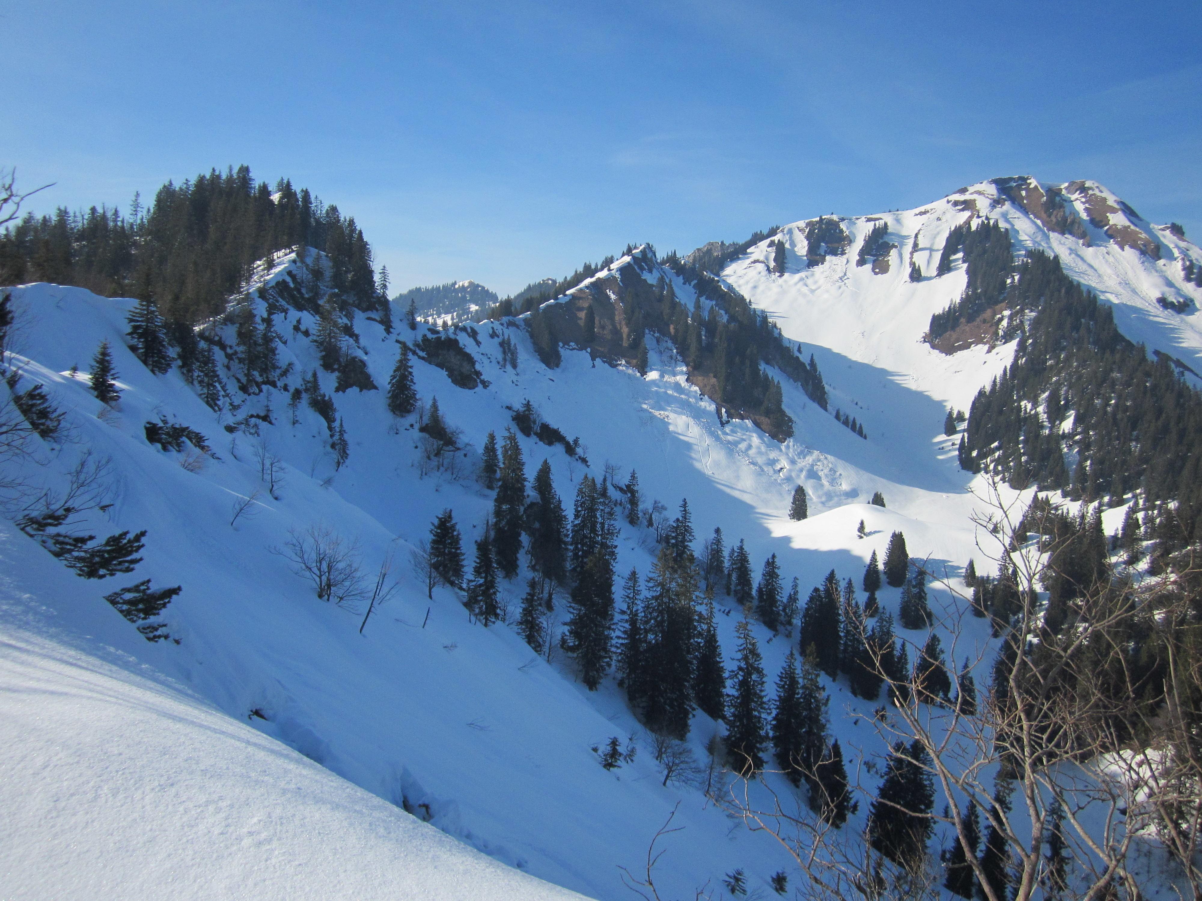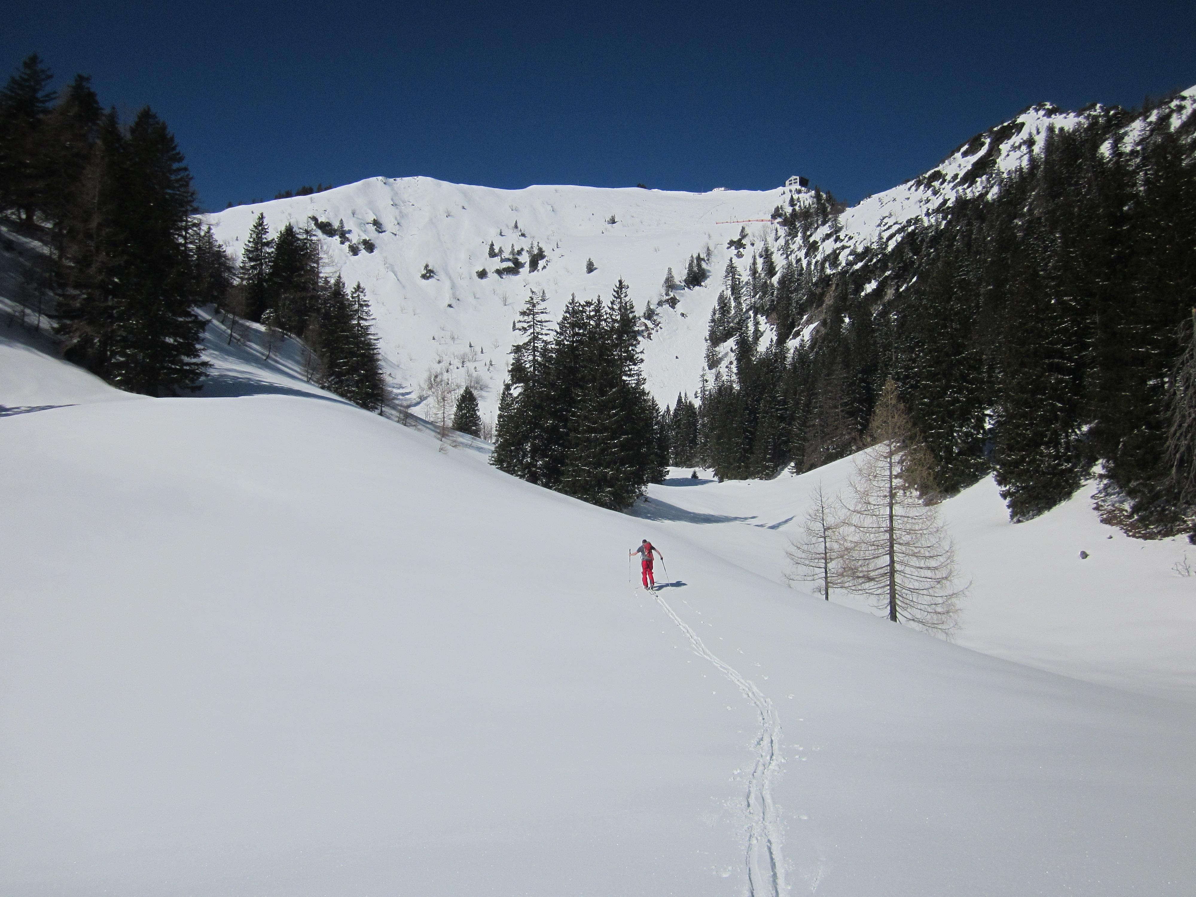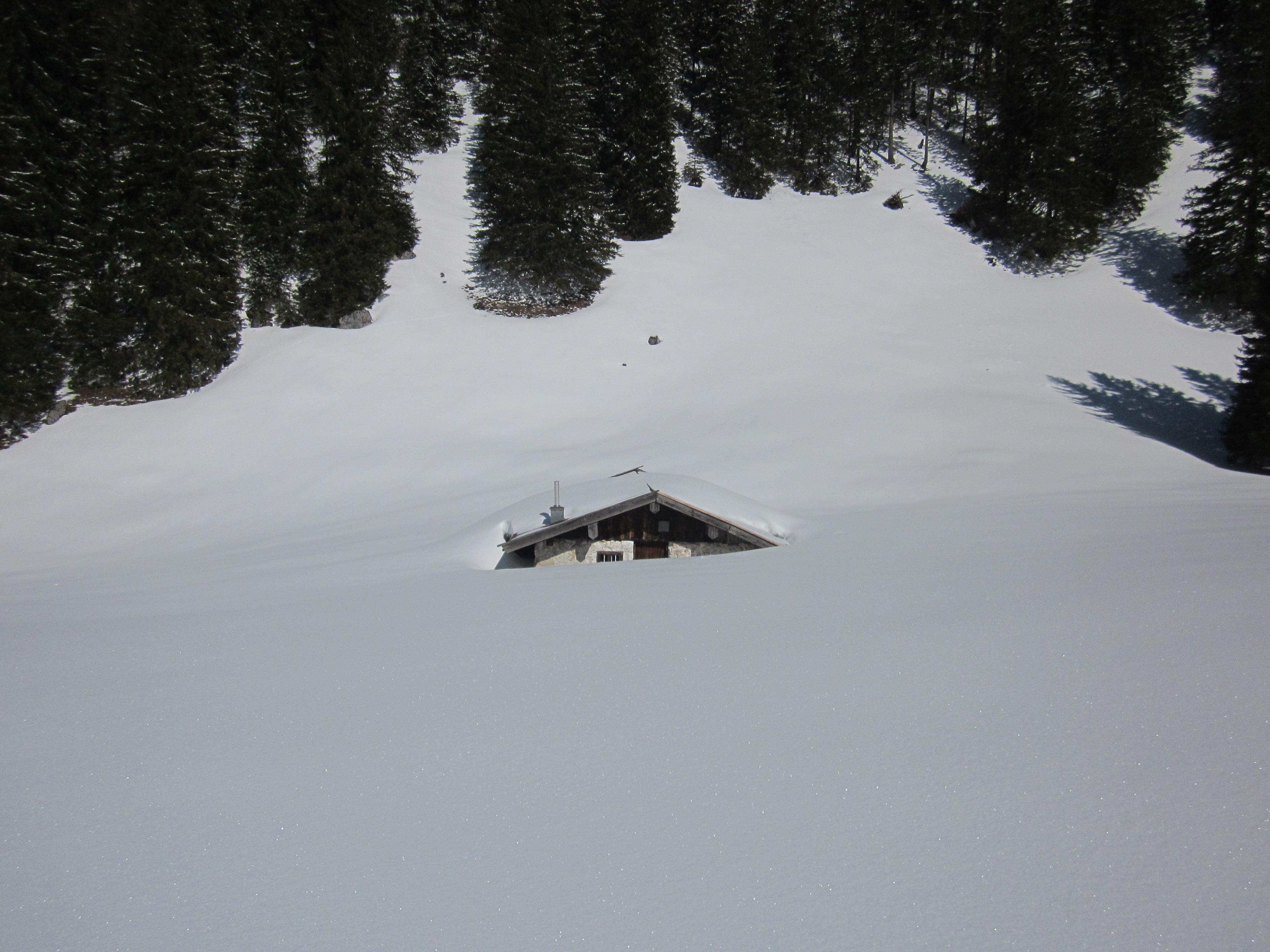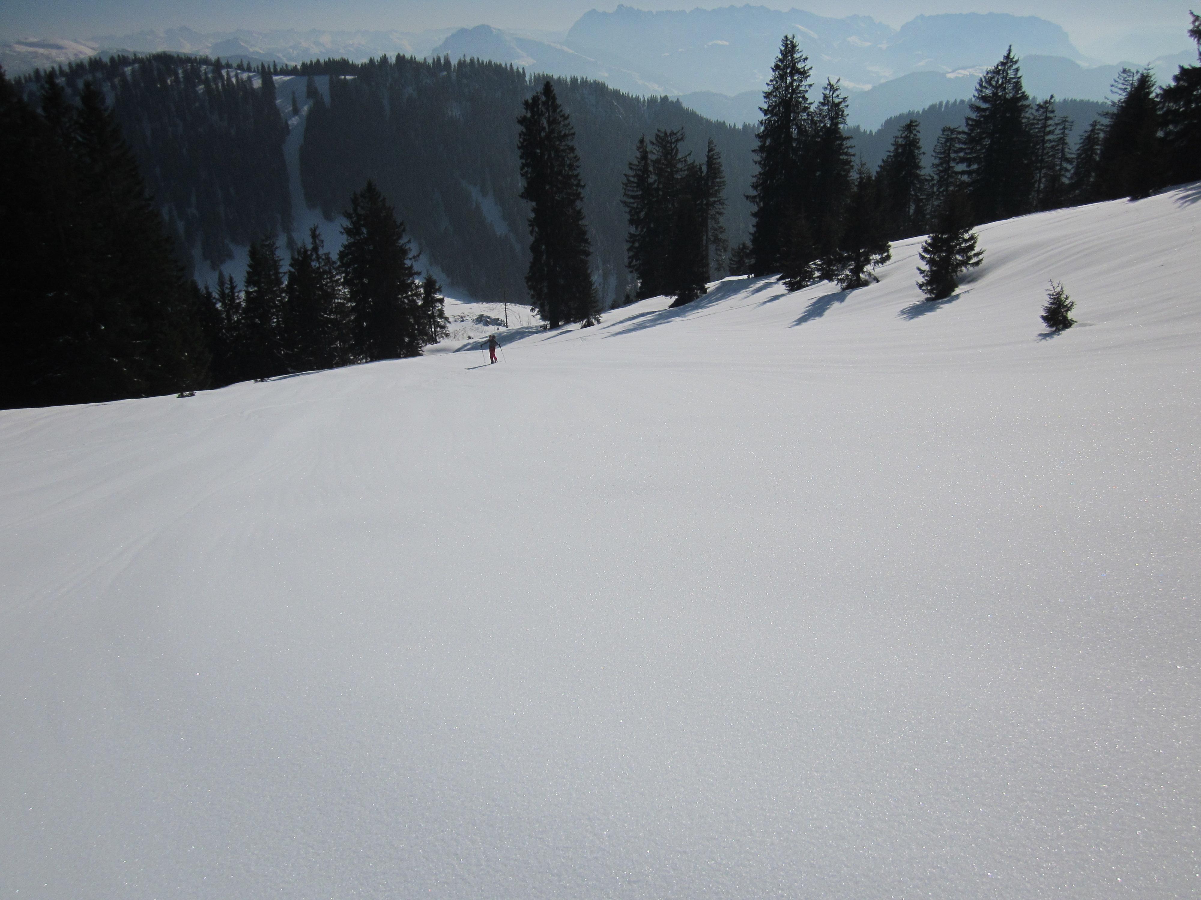 Südseitig wars teilweise firnig, teilweise nasser Pulver, aber gut zu fahren. Kaum Bruchharsch. Bis auf 20 m alles mit Skiern, sonst keine Unterbrechungen.