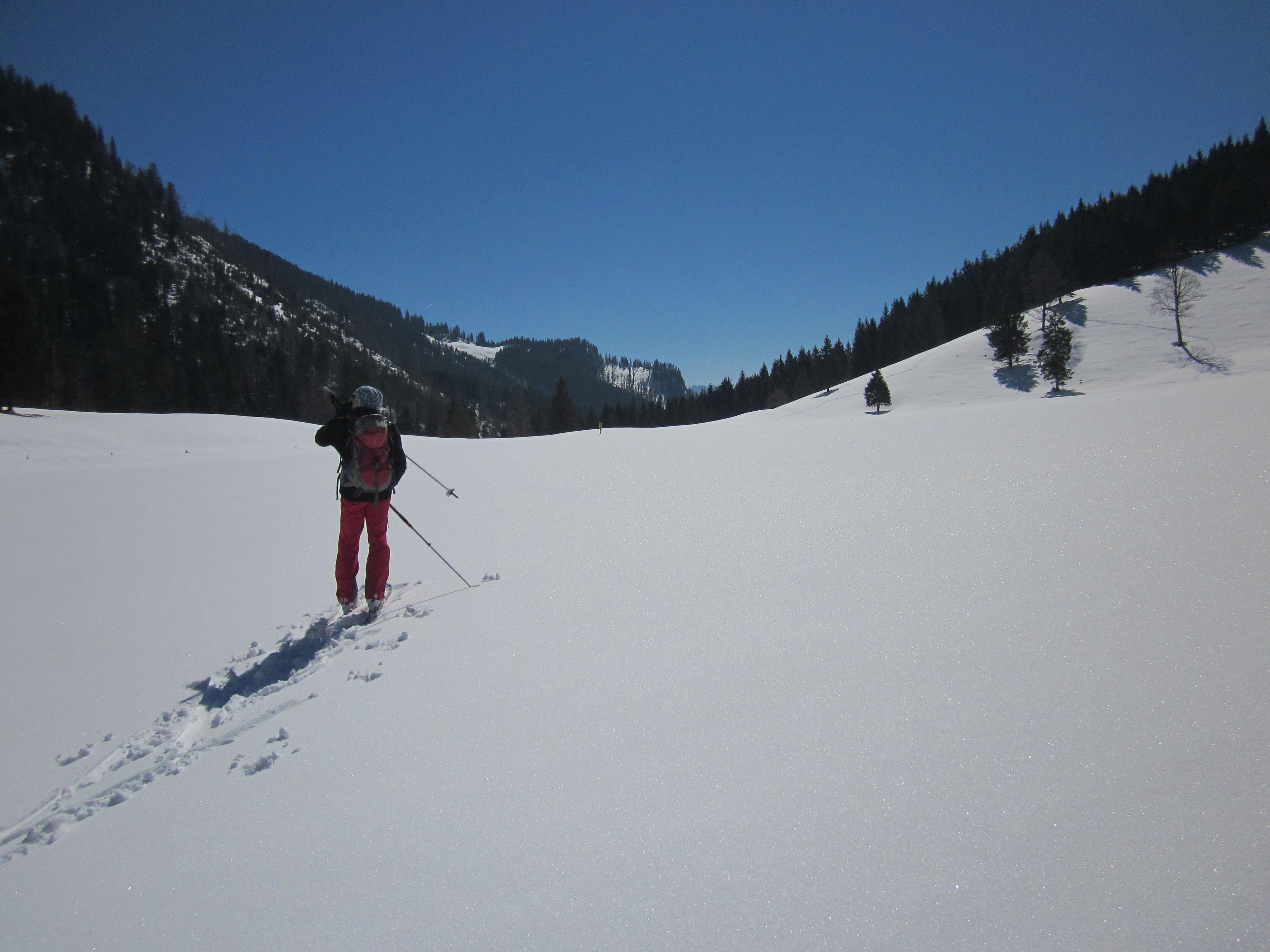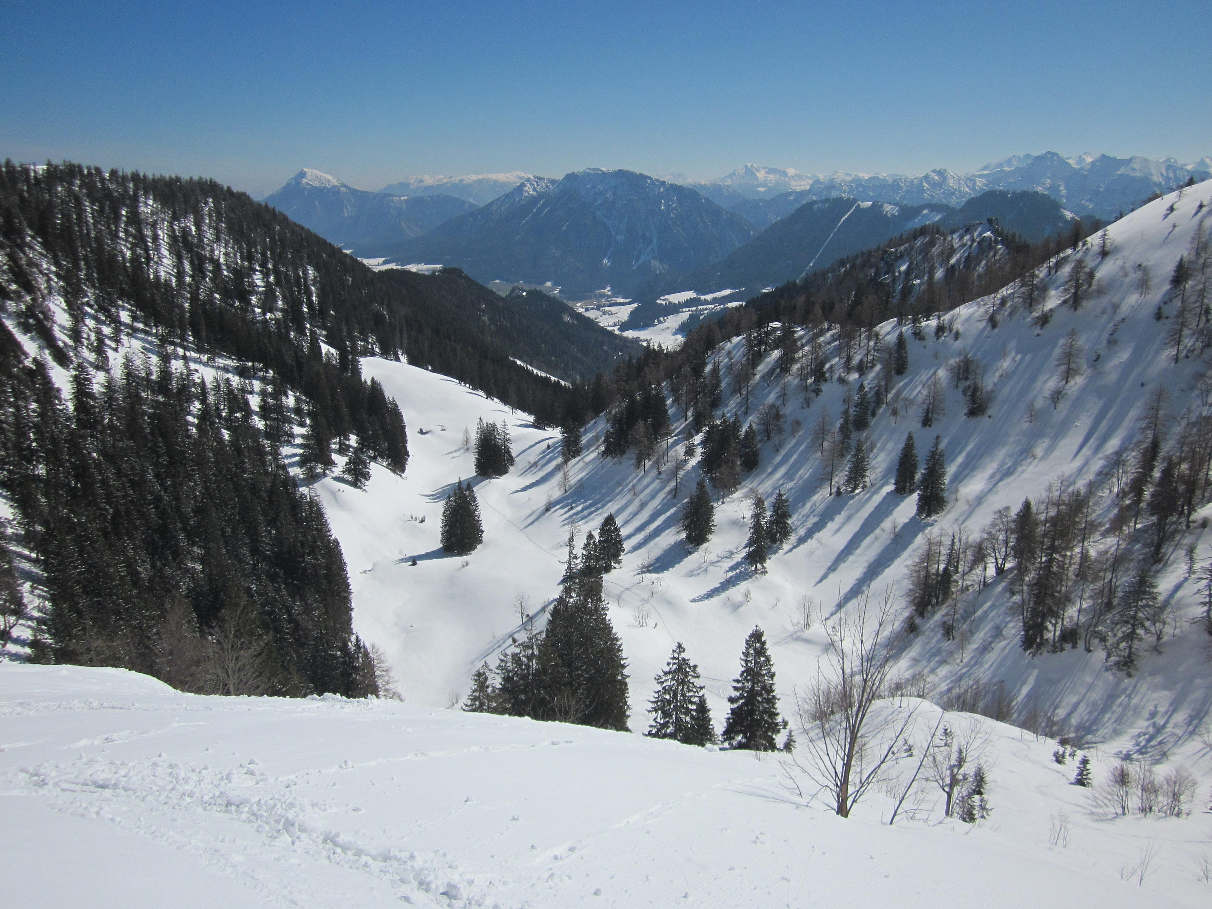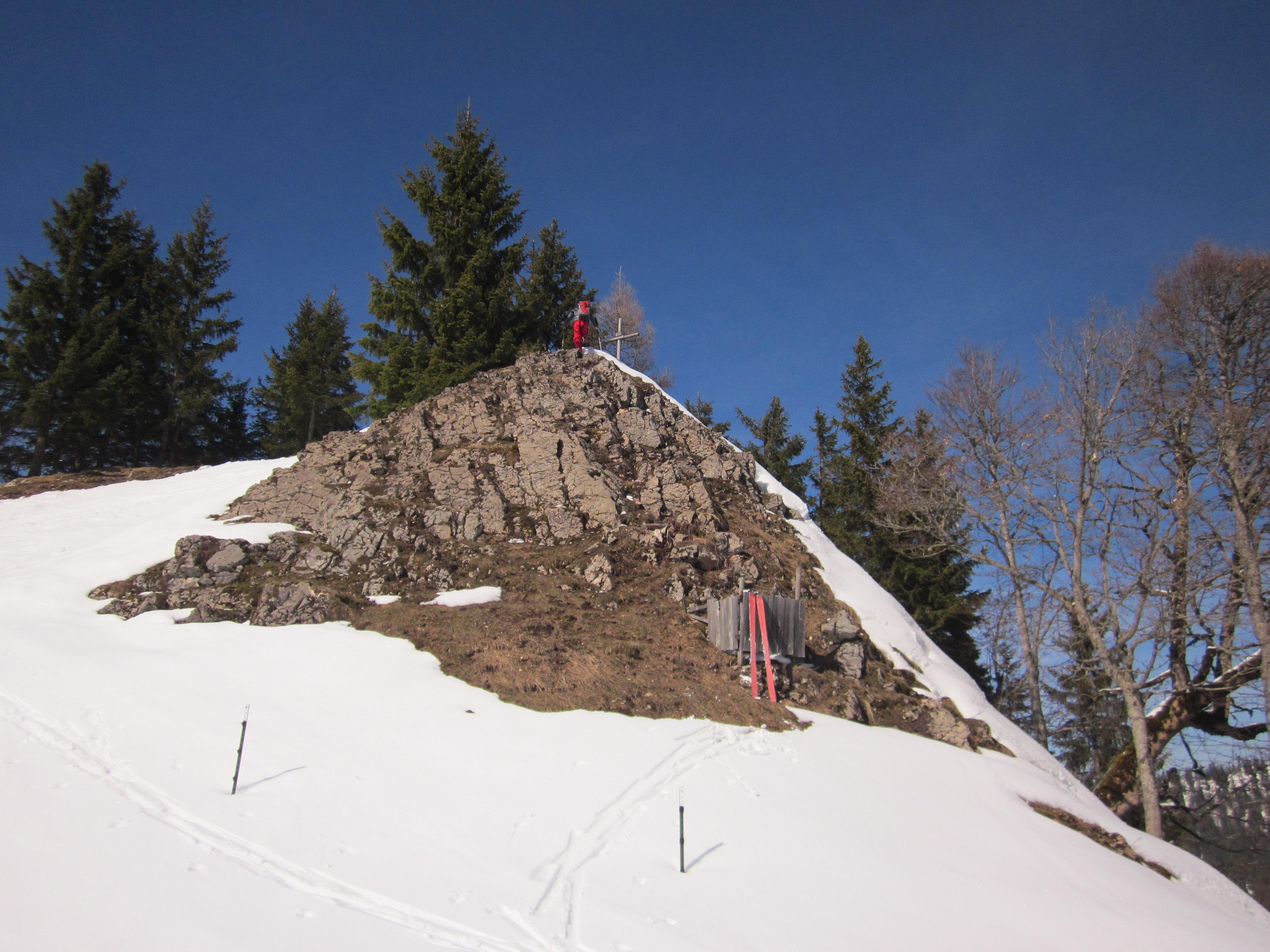 Südseitig wars teilweise firnig, teilweise nasser Pulver, aber gut zu fahren. Kaum Bruchharsch. Bis auf 20 m alles mit Skiern, sonst keine Unterbrechungen.