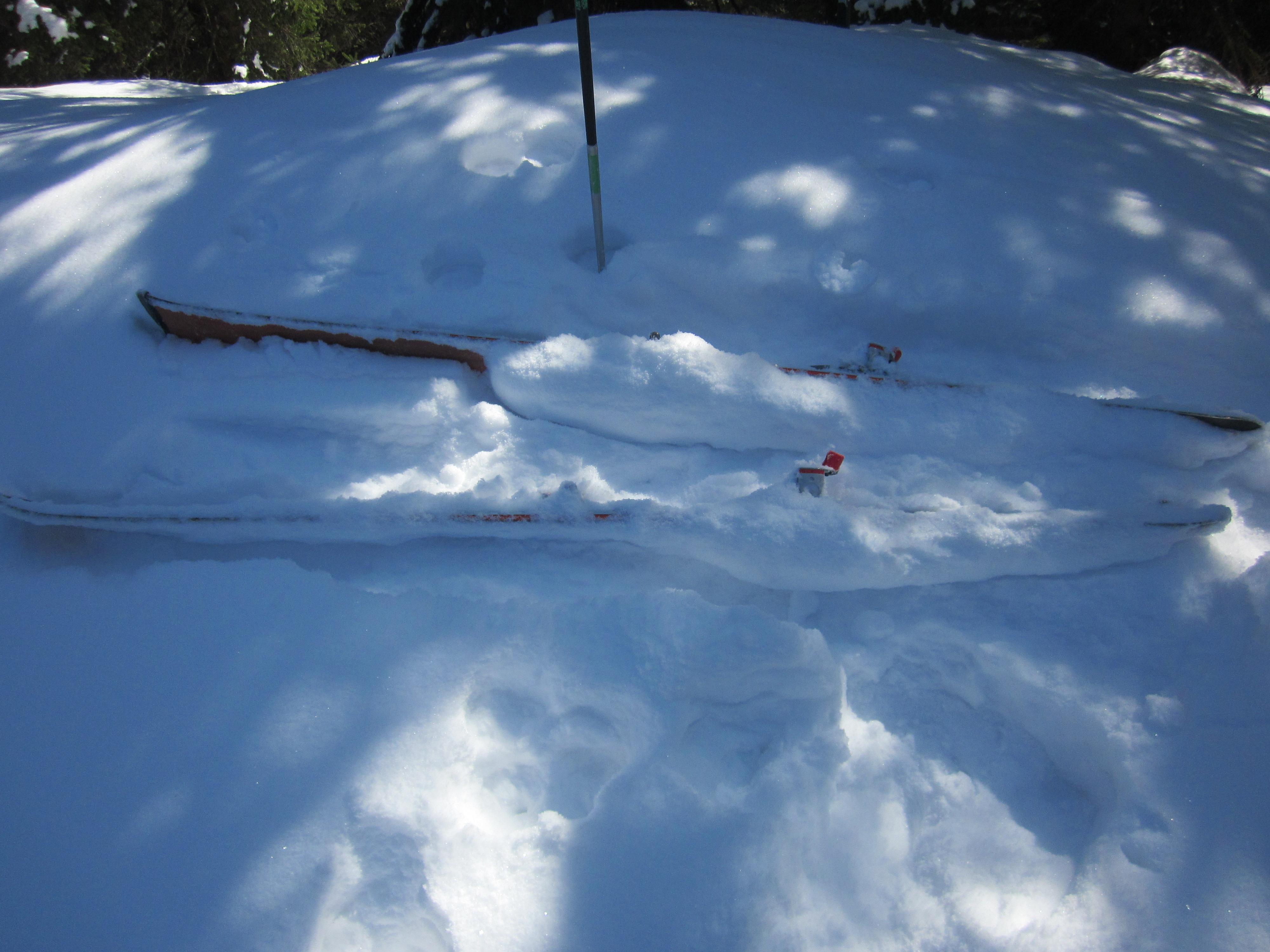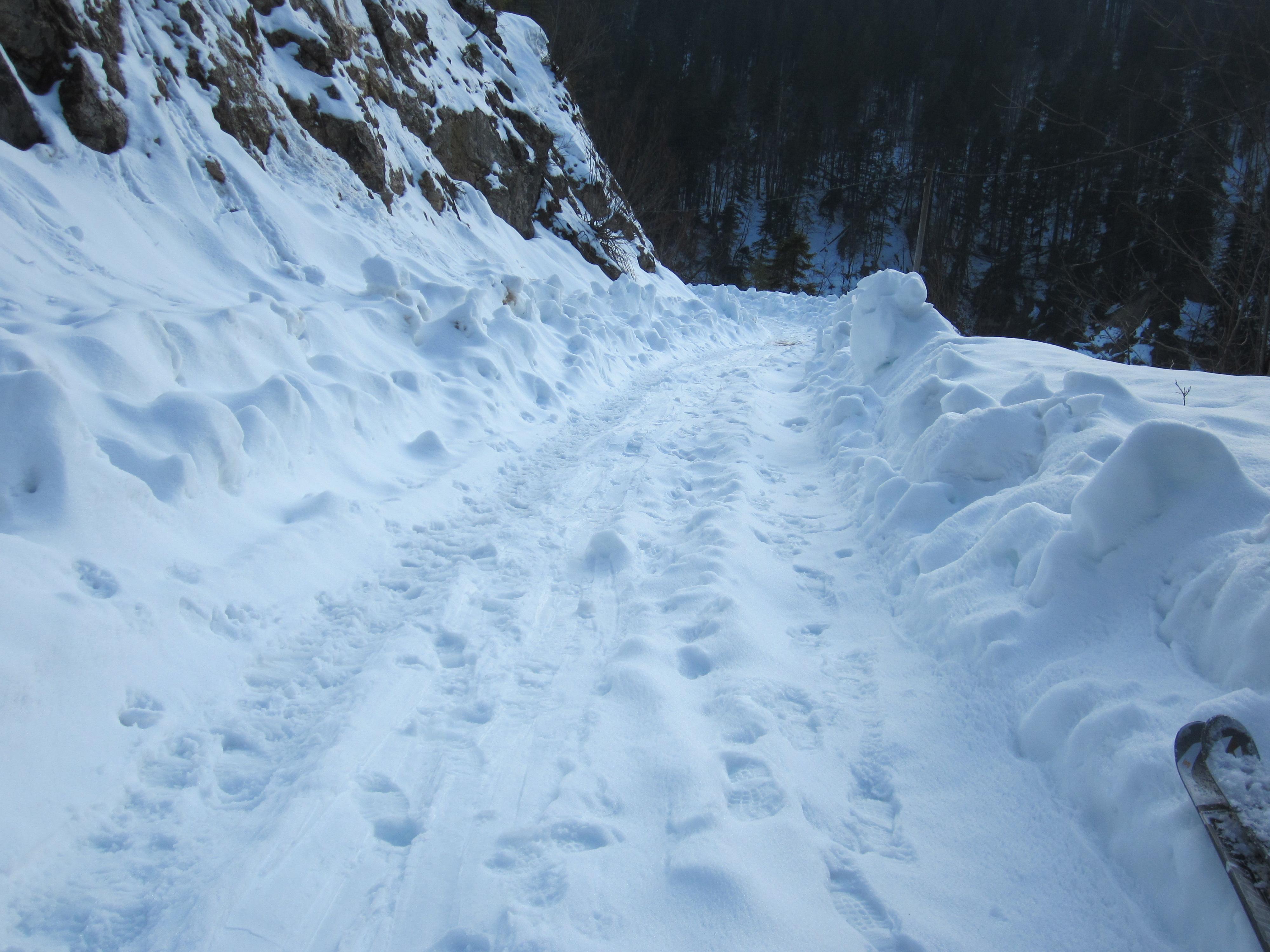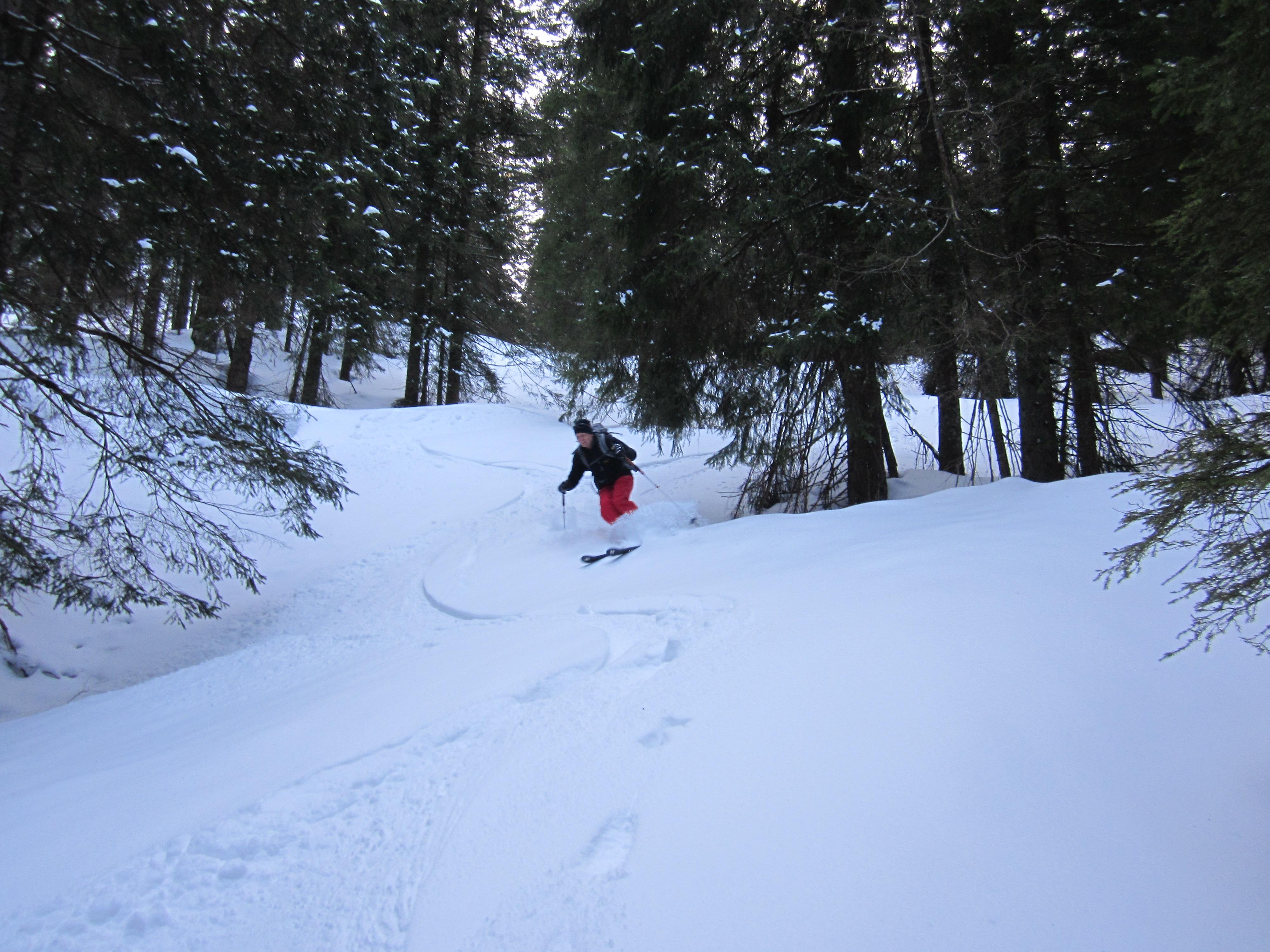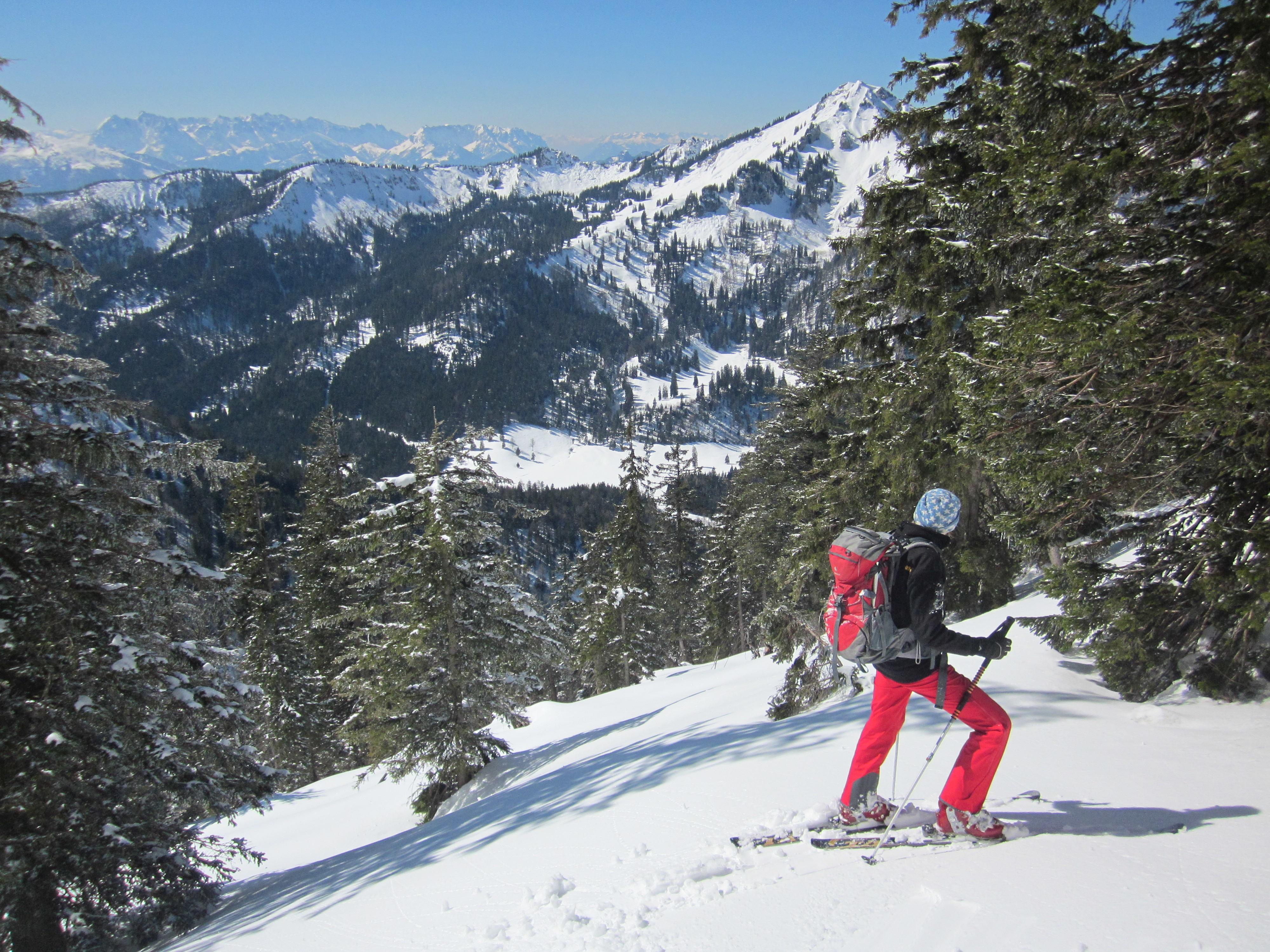 Südseitig wars teilweise firnig, teilweise nasser Pulver, aber gut zu fahren. Kaum Bruchharsch. Bis auf 20 m alles mit Skiern, sonst keine Unterbrechungen.