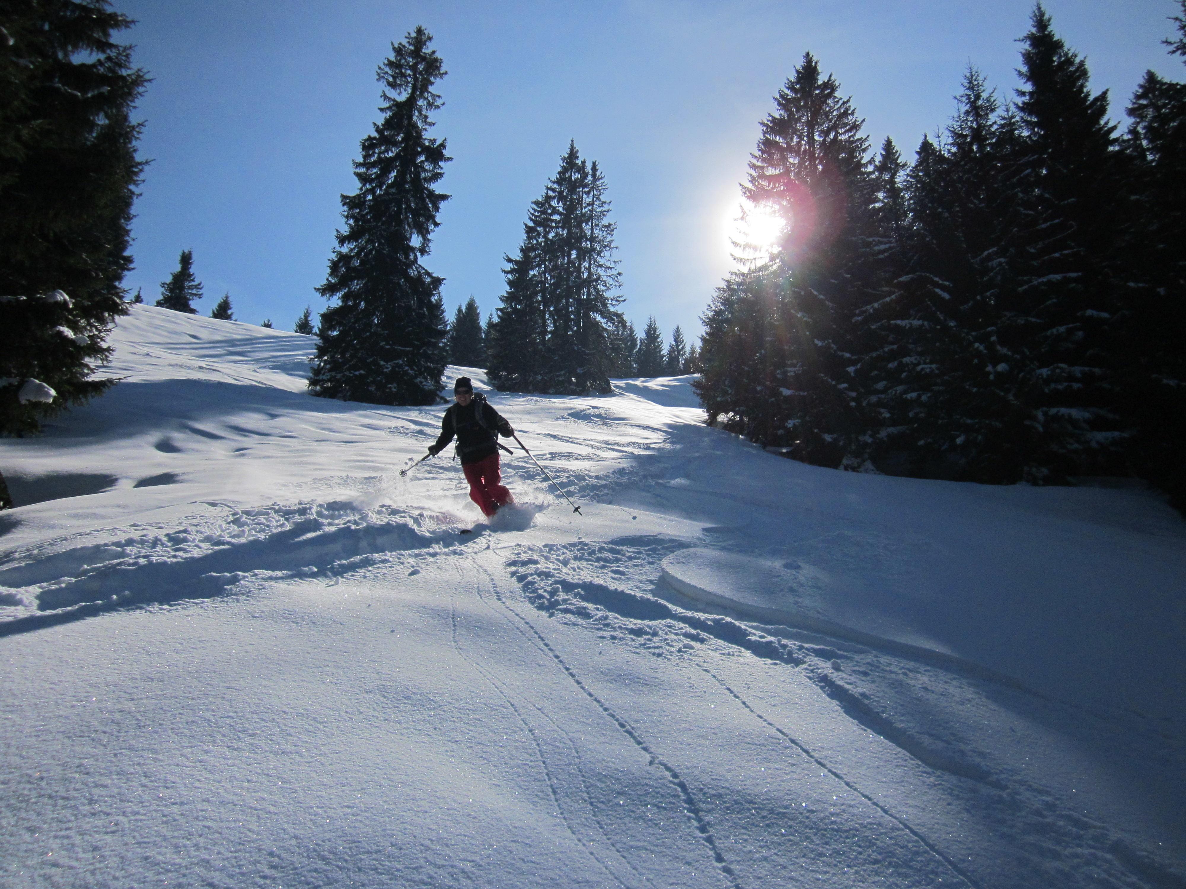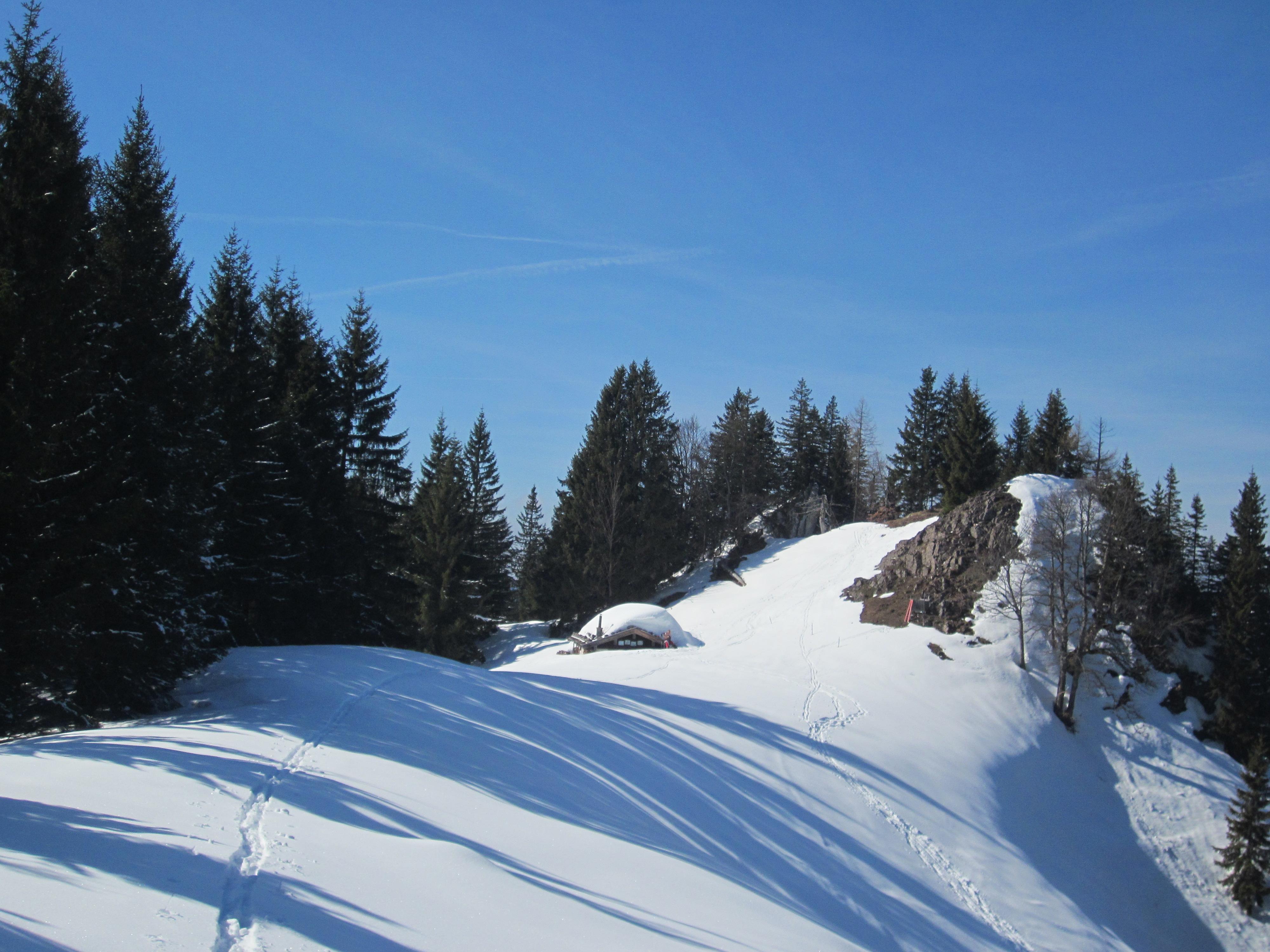 Erstaunlich viel Pulver (nordseitig und im Schatten), der allerdings sehr angestollt ist. Zum Rechenberg sind wir allerdings ein paar Meter gestapft. Fluffiger, nicht tragender Pulver - eisiger Untergrund - Stollen und Harscheisen. Passt ois ned zsamm.