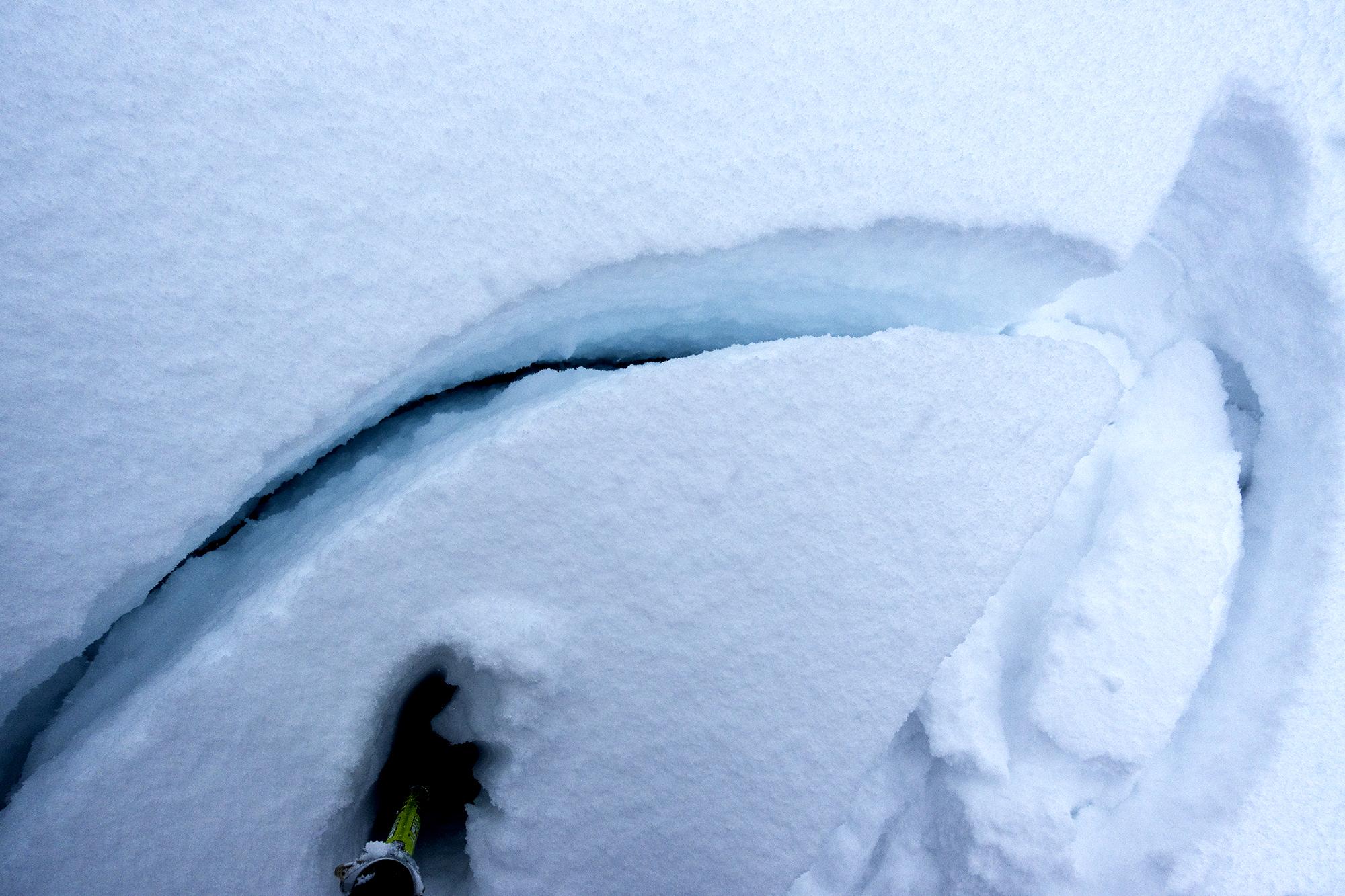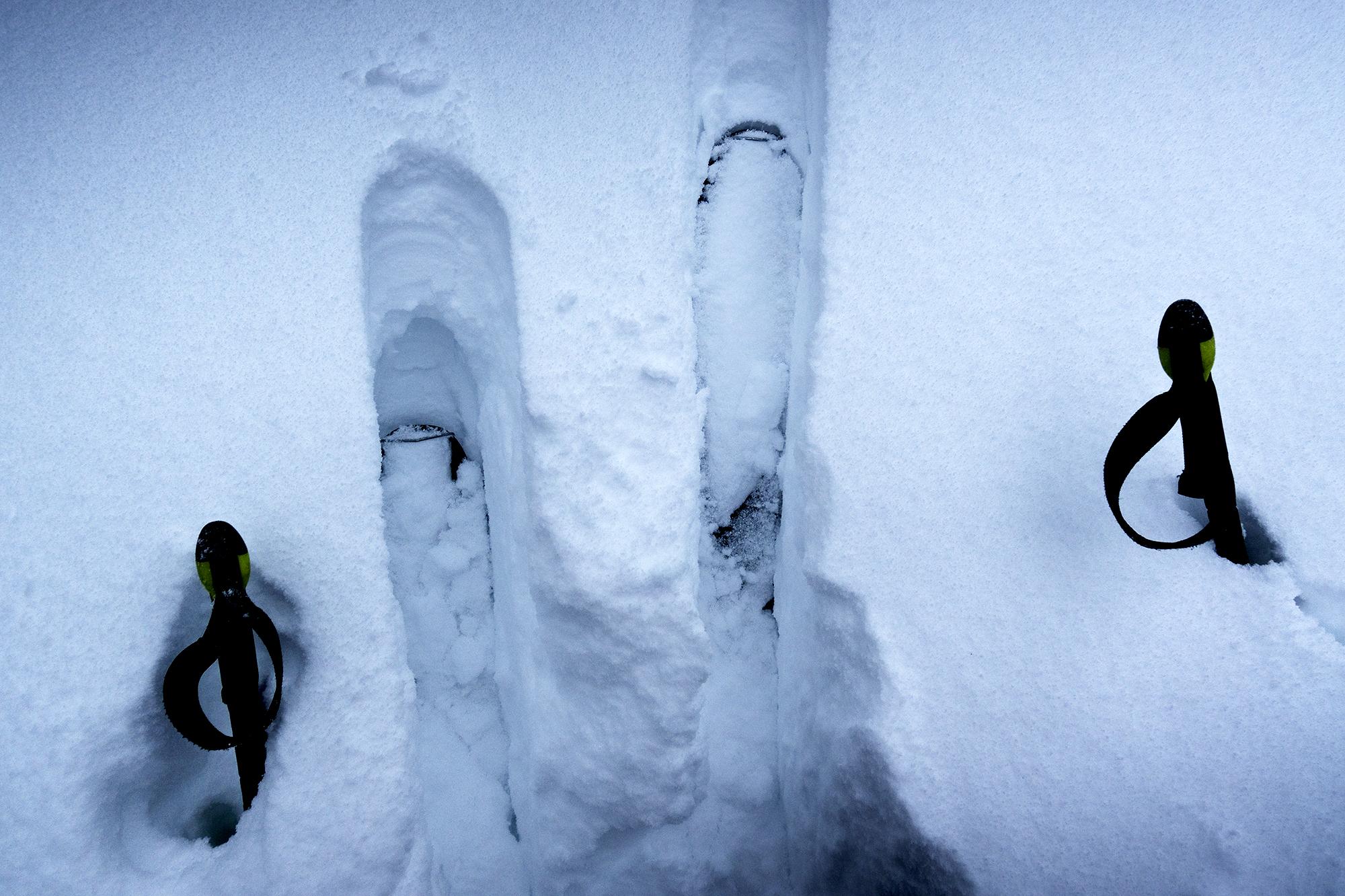 Es geht rauf und runter im Tiefschnee ohne Steinkontakt. Der Schnee ist bodennah so wasserhaltig und dicht gepackt, dass er Steine und Vegetation verlässlich versiegelt.