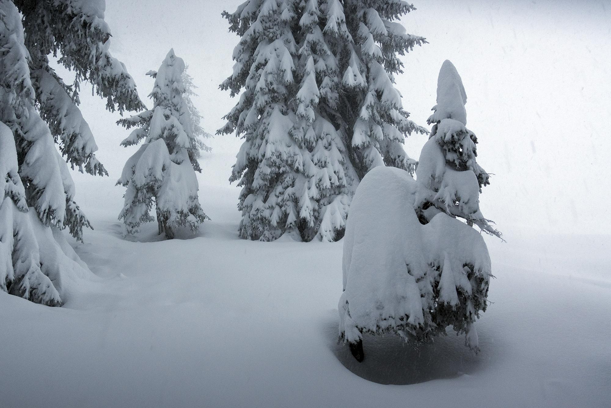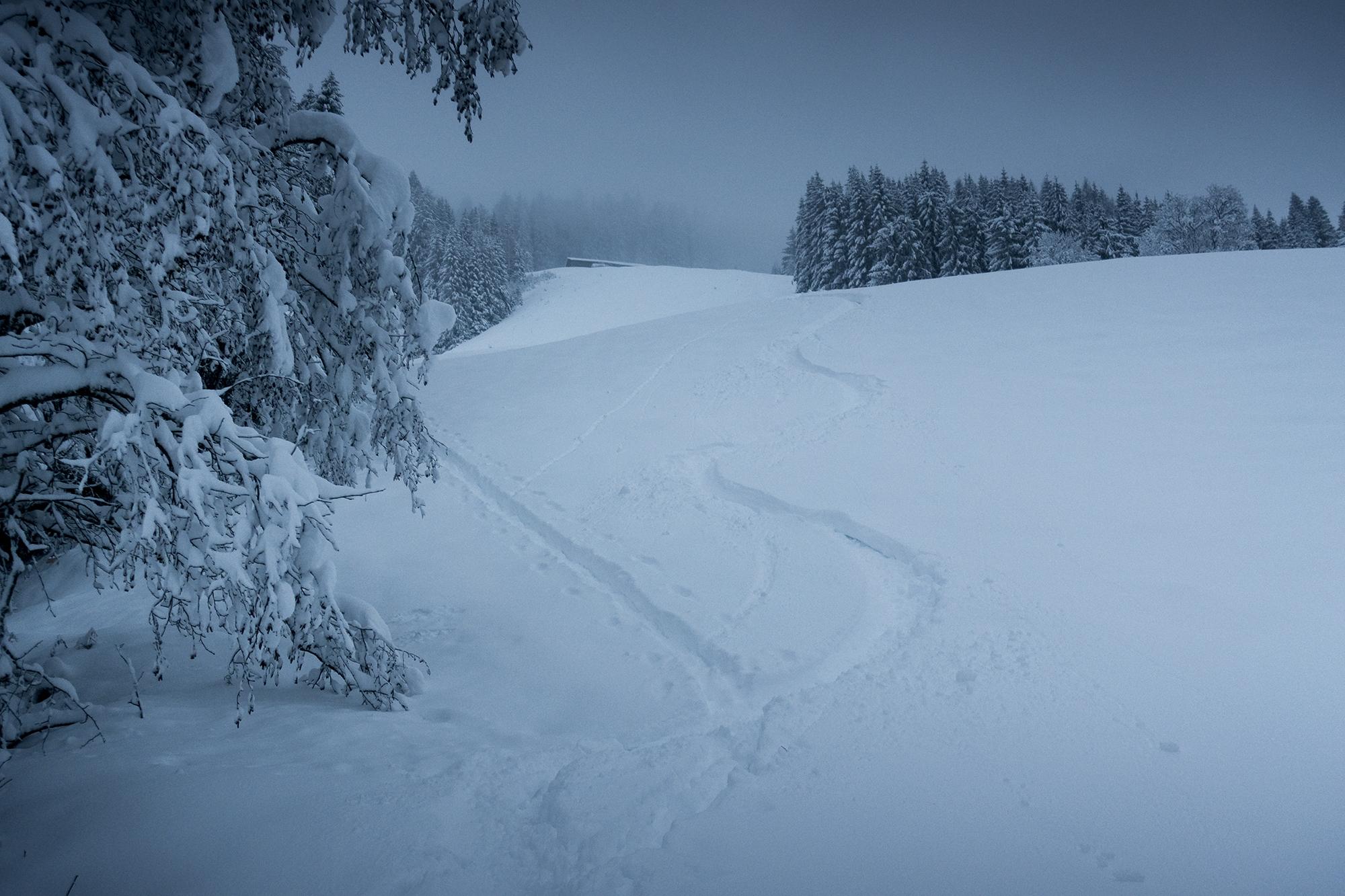 Es schneit ununterbrochen, und wenn man unterhalb der Jagdhütte aus dem Wald kommt, schlägt der Sturm zu. Totales White Out. Let's call it winter!