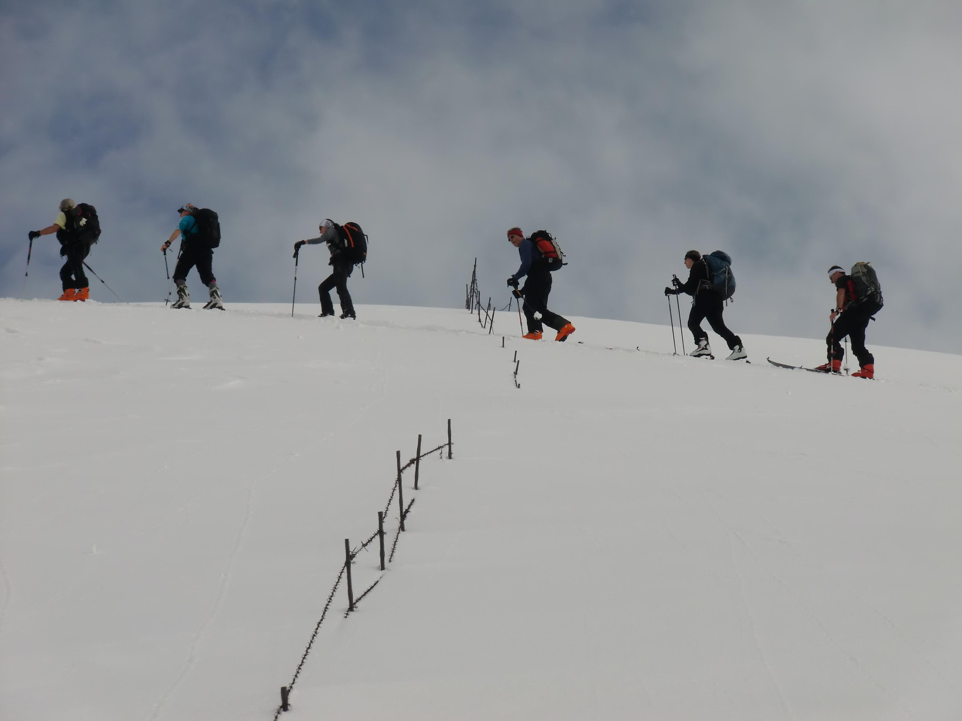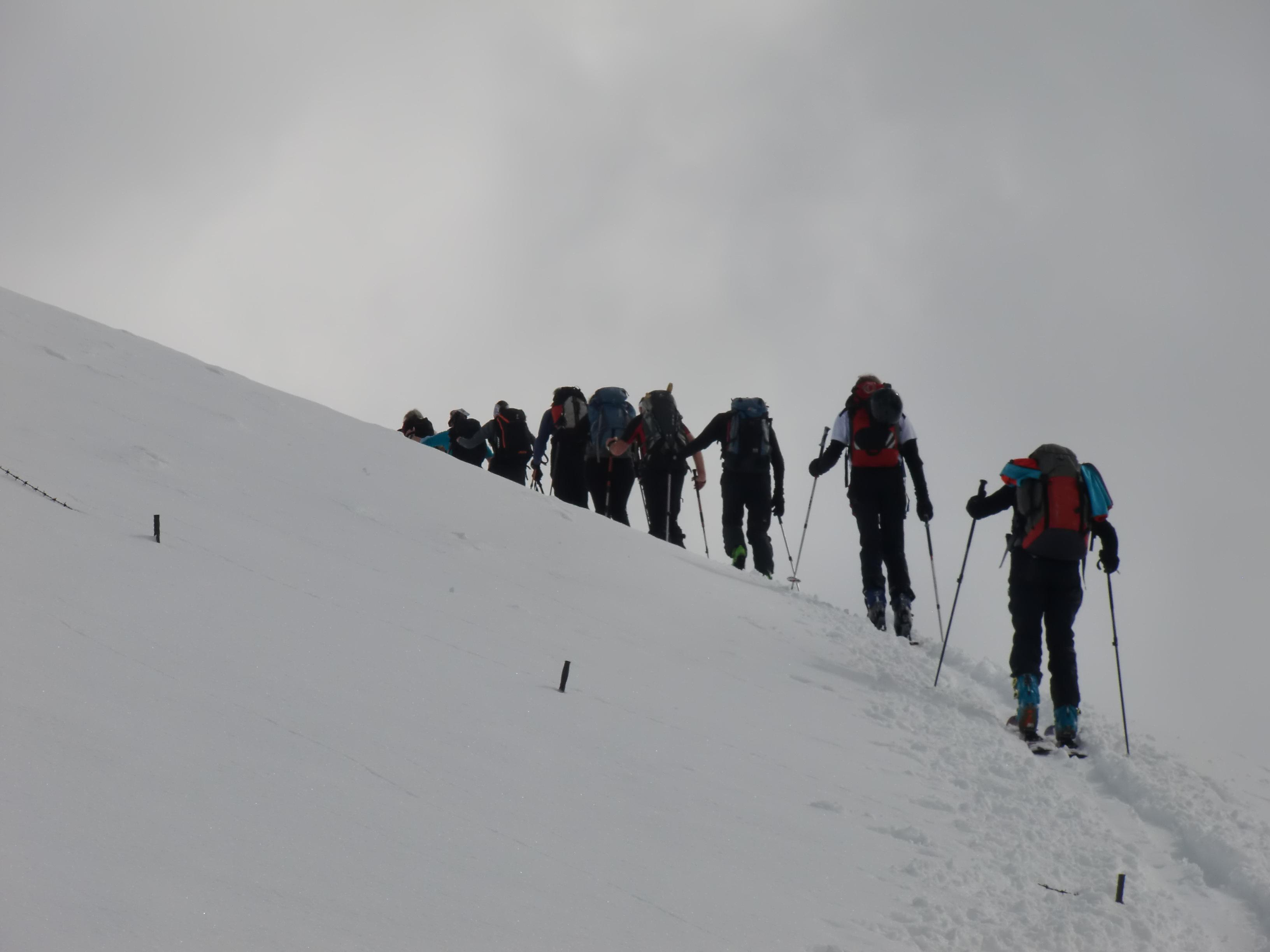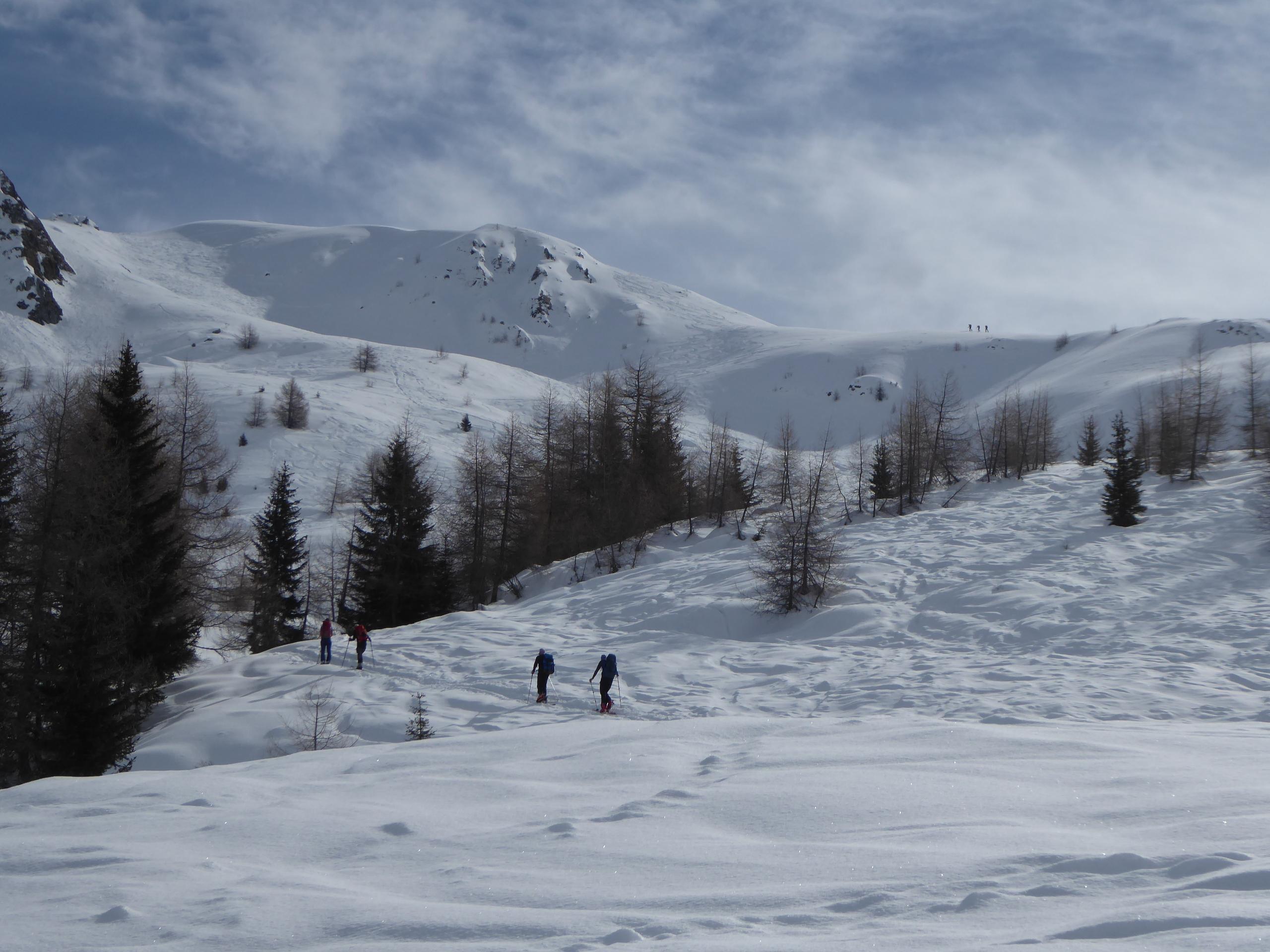 Schnee: Oben angefeuchteter Pulver mit leider brüchigem Untergrund, Mittelteil Bruchharsch, sehr zerfahren plus die Bombentrichter der Schneeschuhgeher, unten tragender Firn, zuletzt unter der Hütte Buckelpiste.