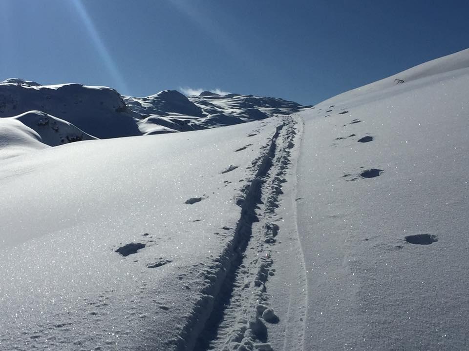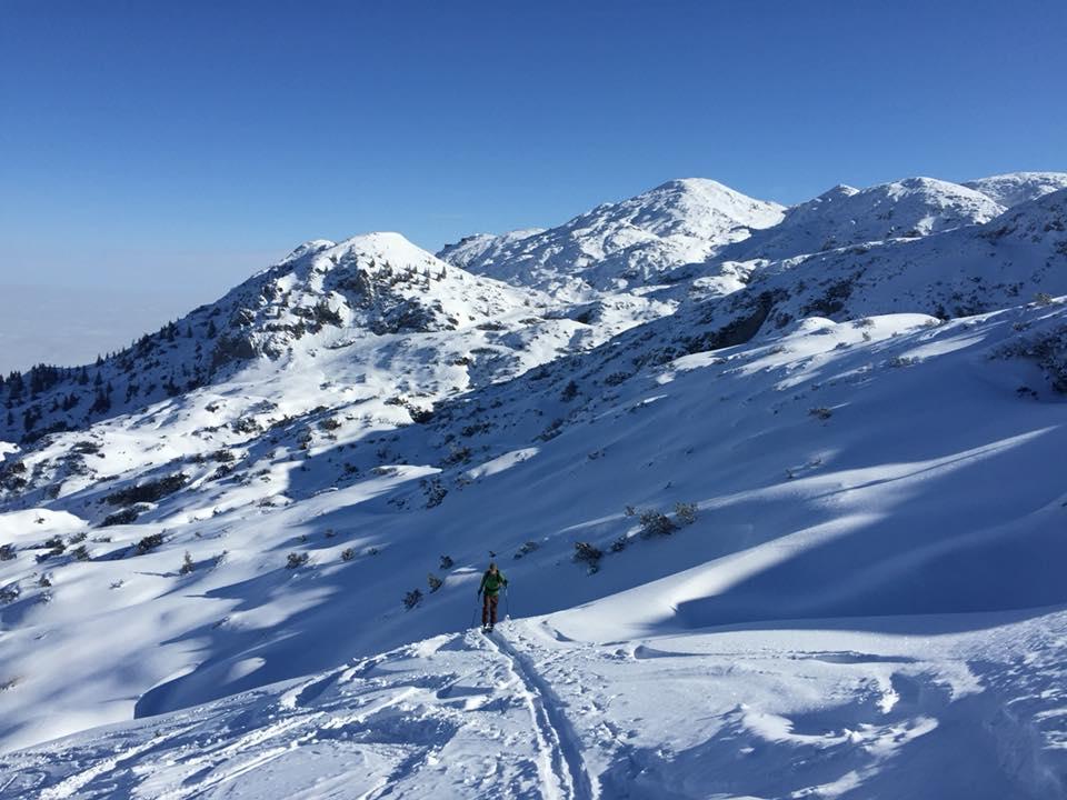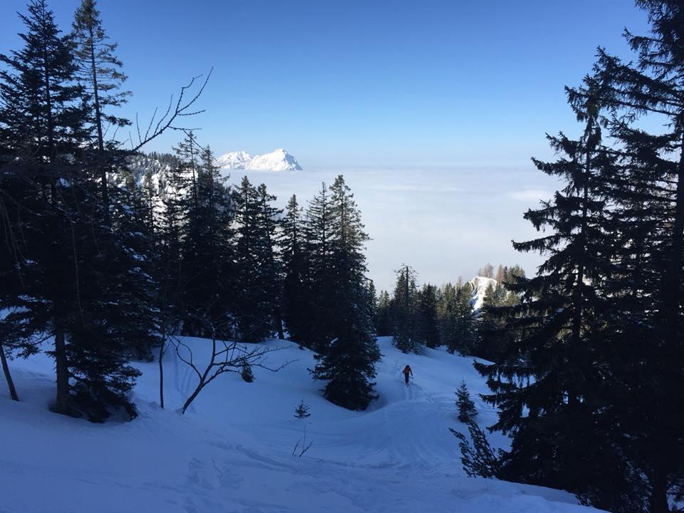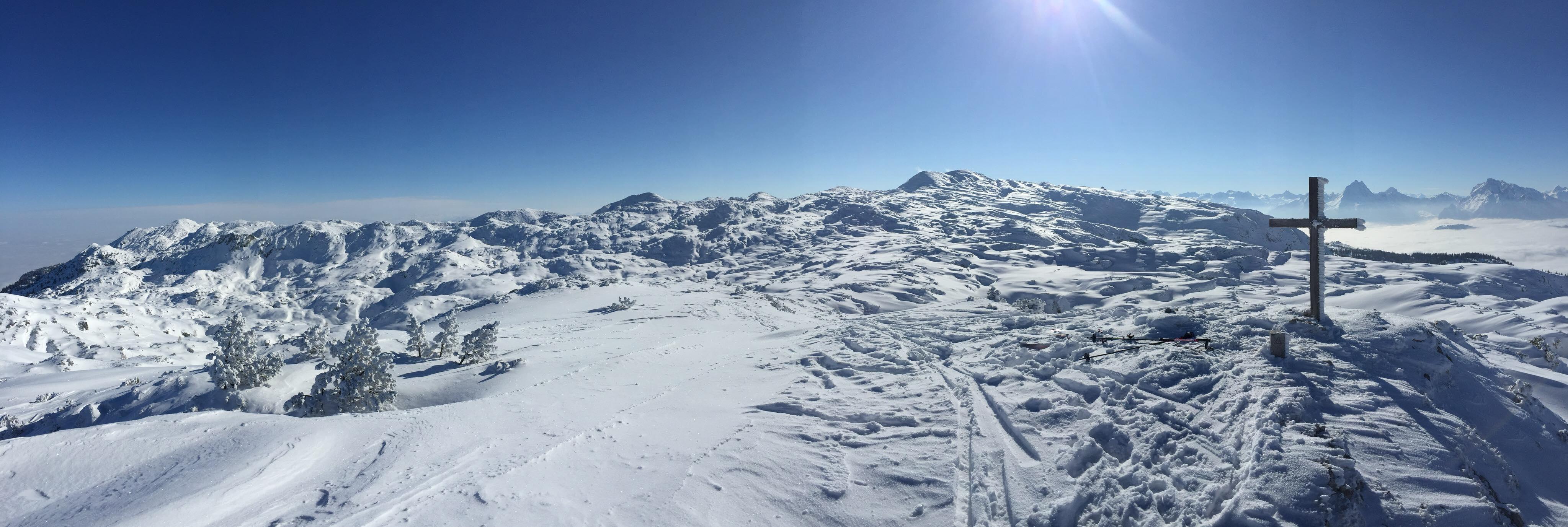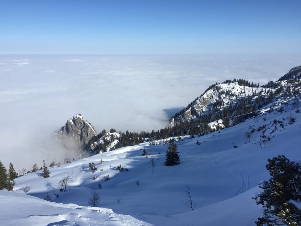 Verhältnisse: Super Schneelage am Plateau. Unterhalb von 1000 mSh leider nur bescheidene Schneelage. Dolinen und Schächte meist zu. Südseitig hat der Pulver bereit einen leichten Stich.