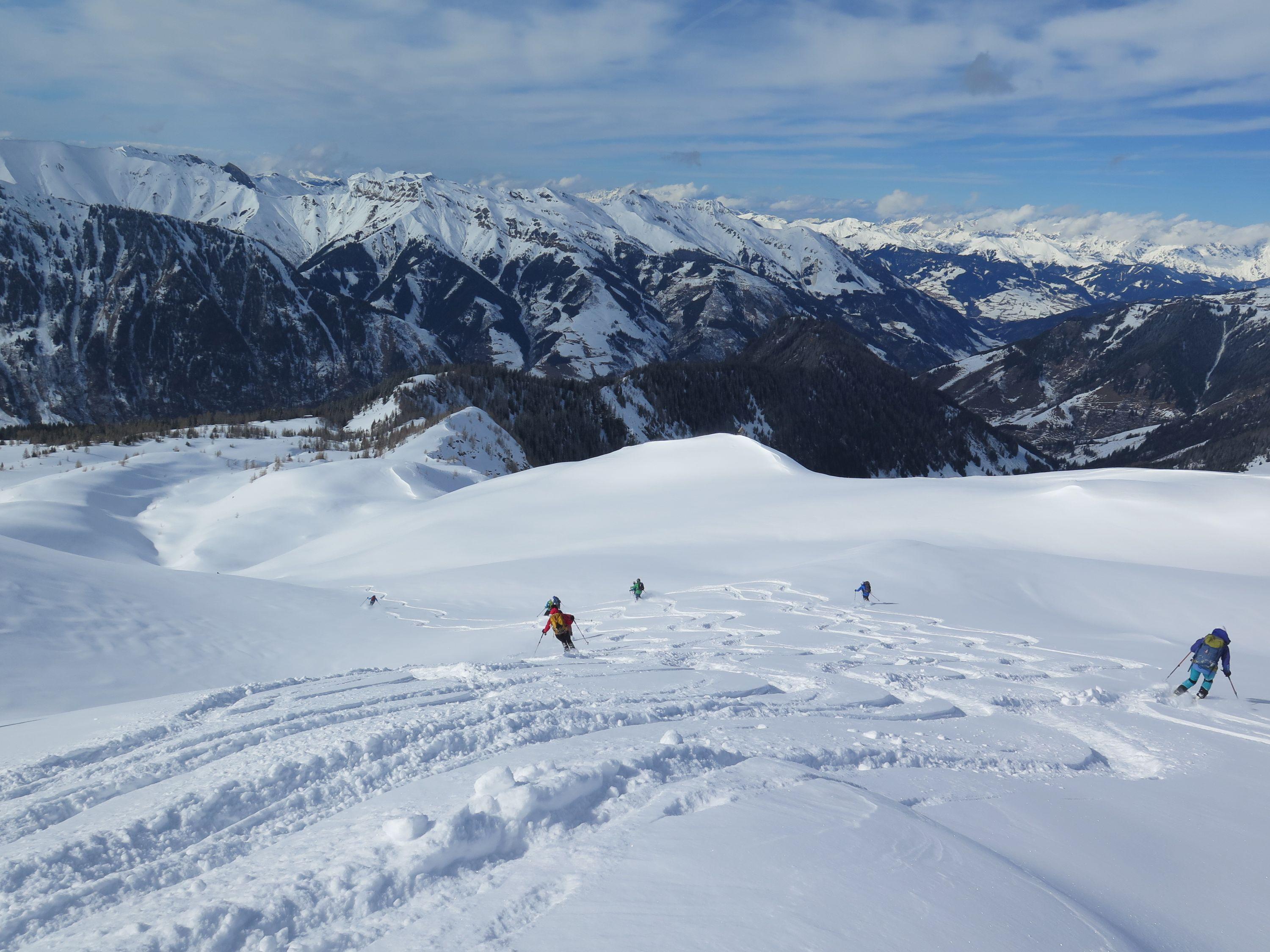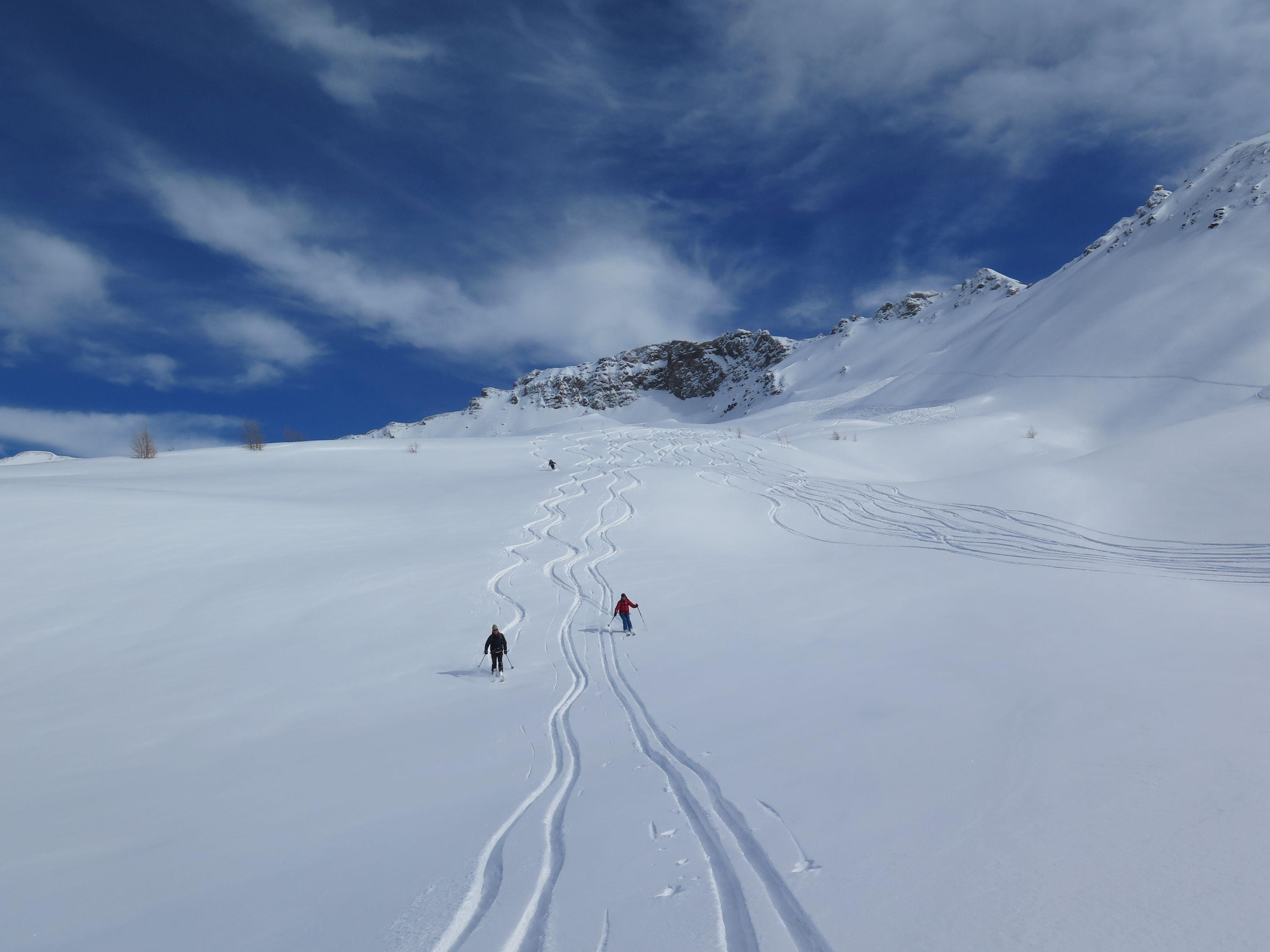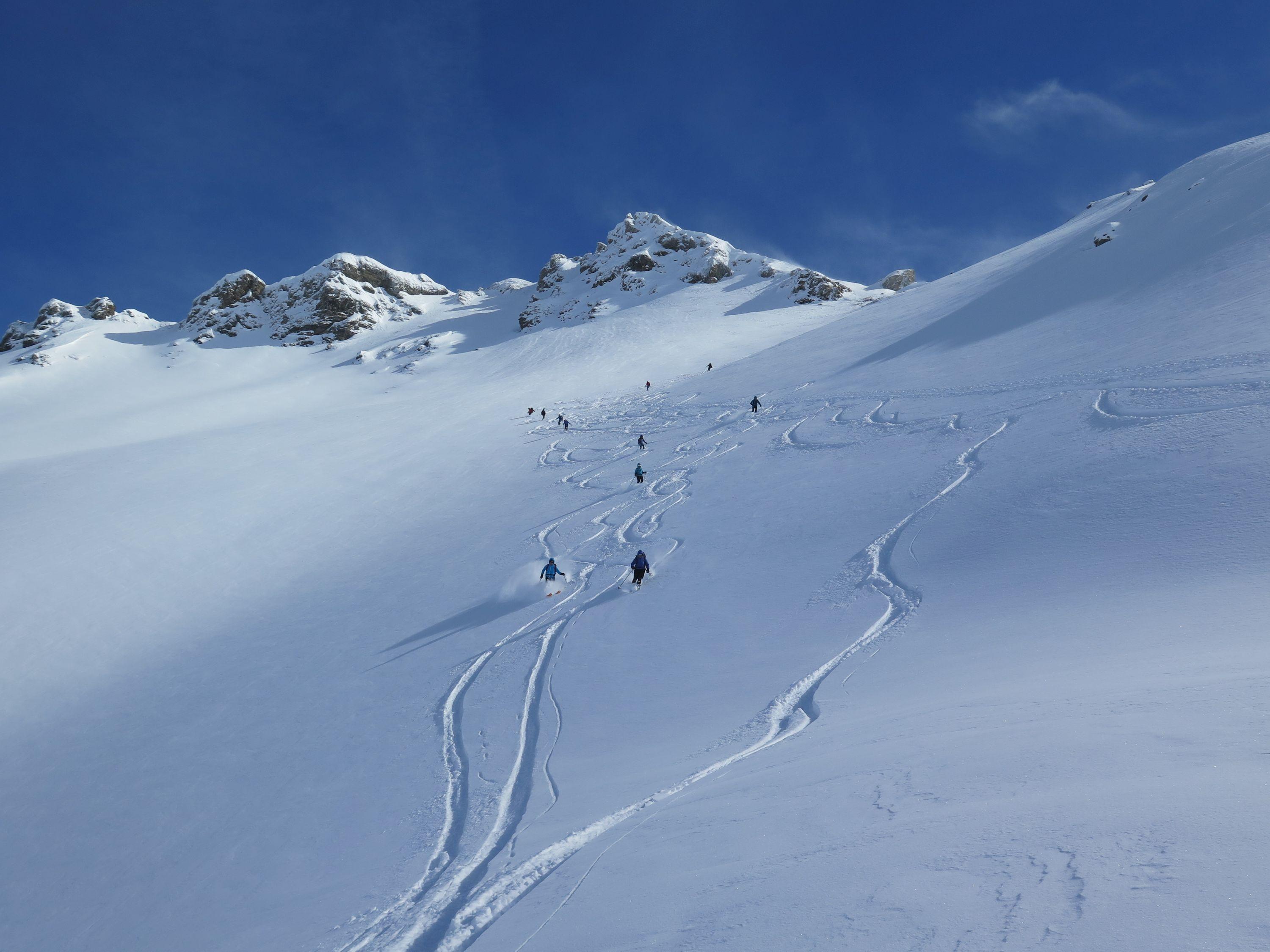 Schnee : Wiesenbereich leicht angeweicht, ab der Waldgrenze Neuschneeauflage bis ca. 20 cm, kurz vor der Scharte leicht windbehandelt.