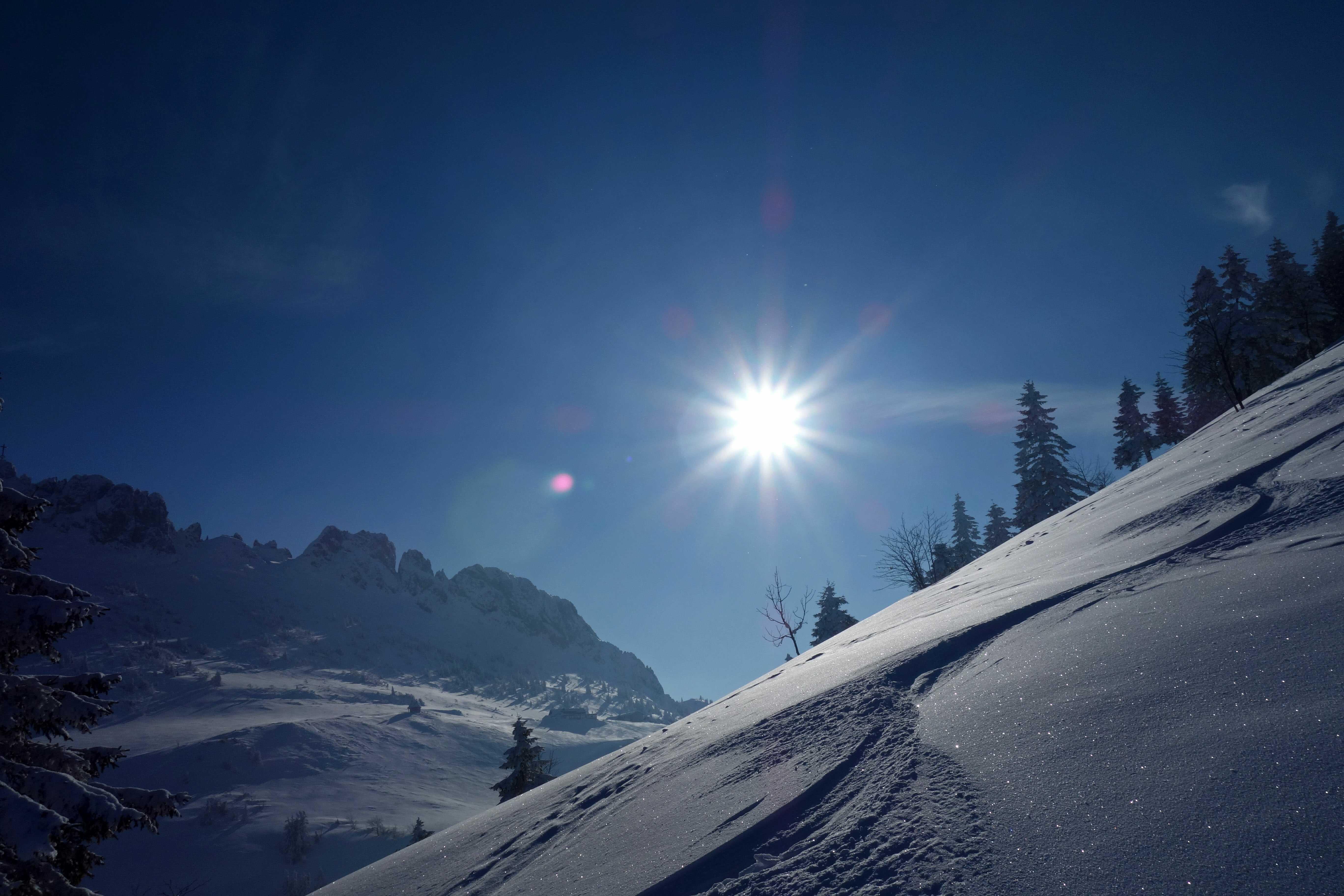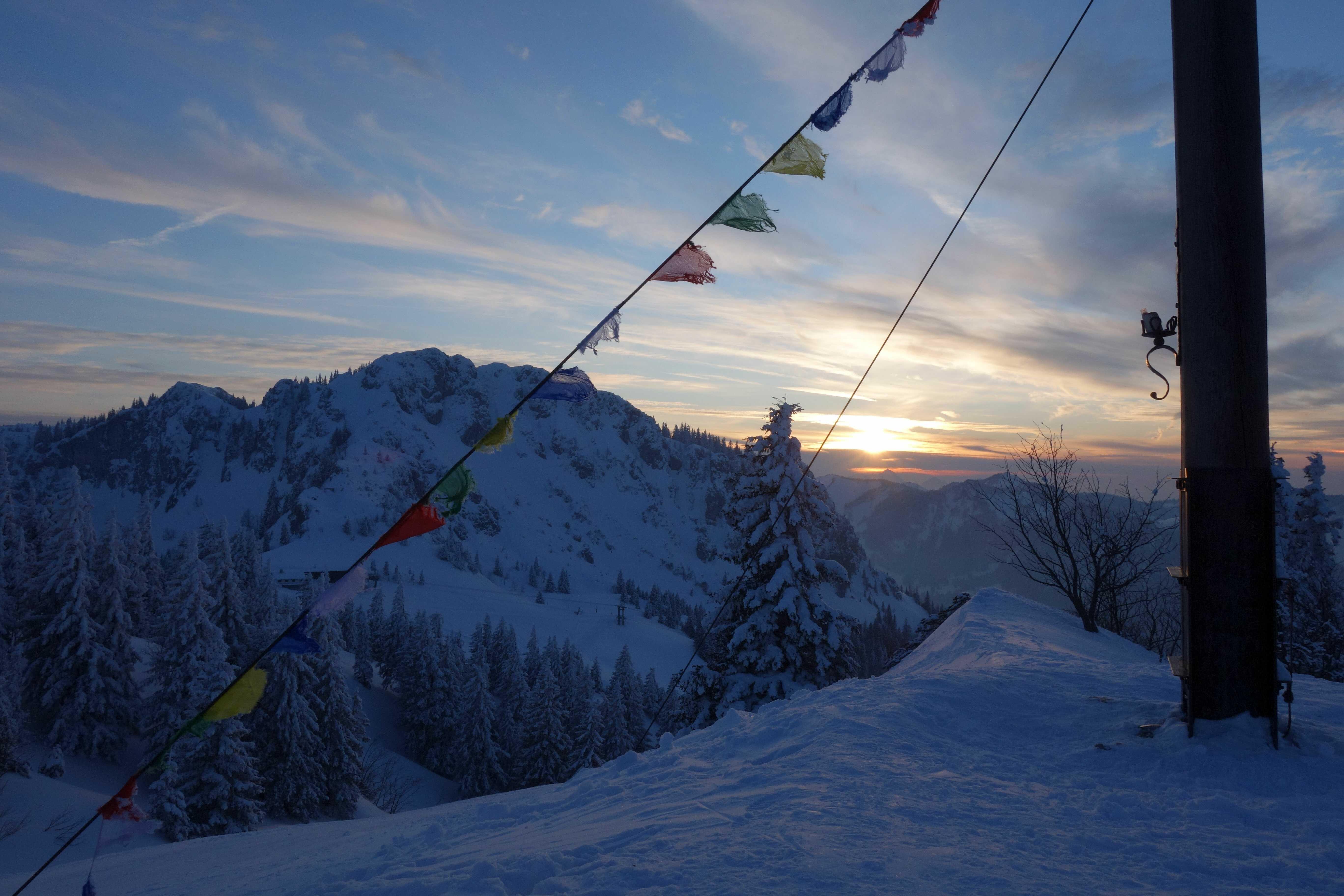 Nachmittagstour vom PP bei der Seilbahn in Hohenaschau (620) über die Piste auf den Sulten (1472). Nach verschiedenen Pulverabfahrtsvarianten über die Steinlingalm (1450) zur Schlechinger Scharte (1635). Zurück über Steinlingalm und nach Querung zum Kreuz oberhalb der Sonnenalm (1500) über die Piste ins Tal.